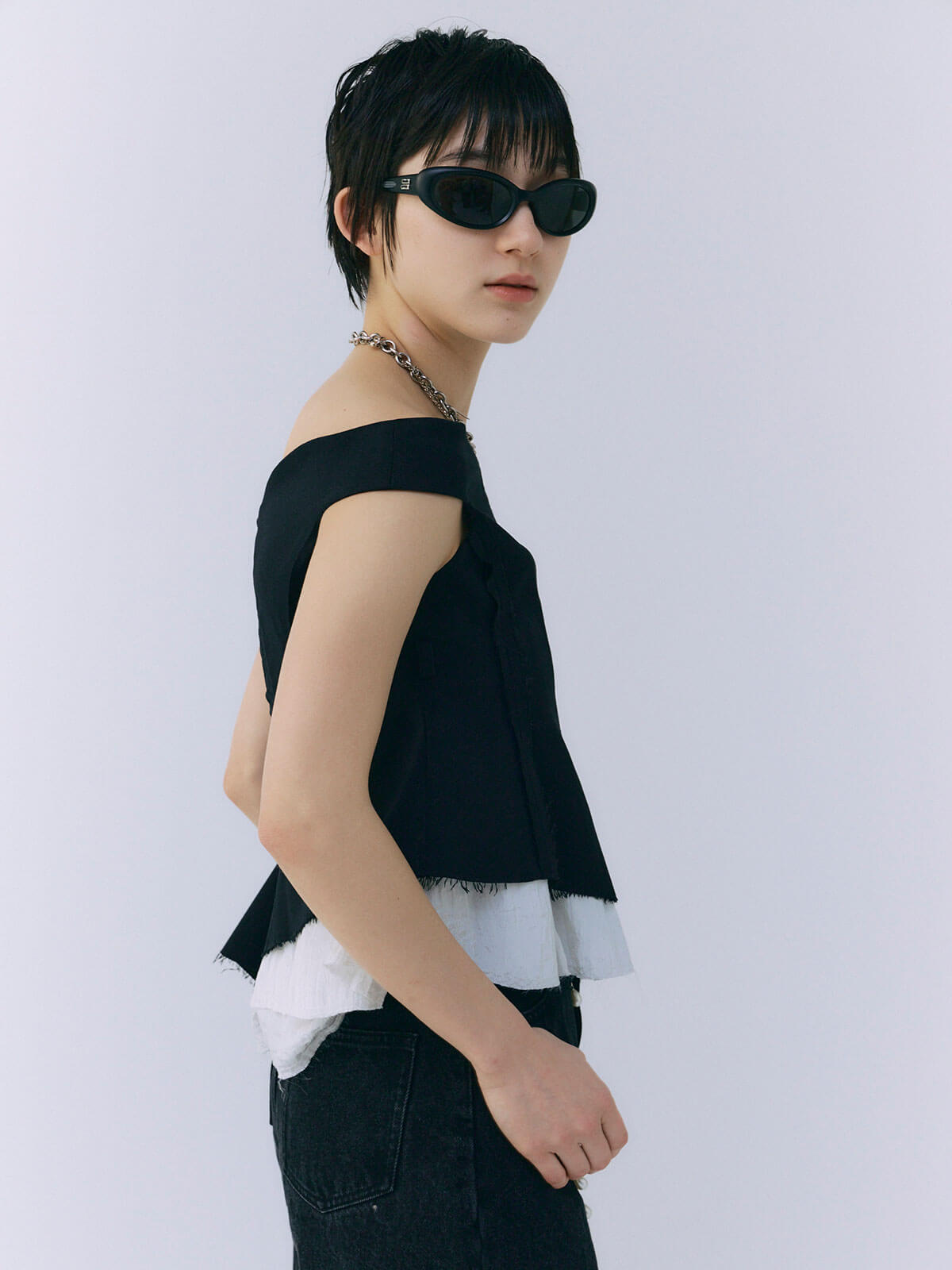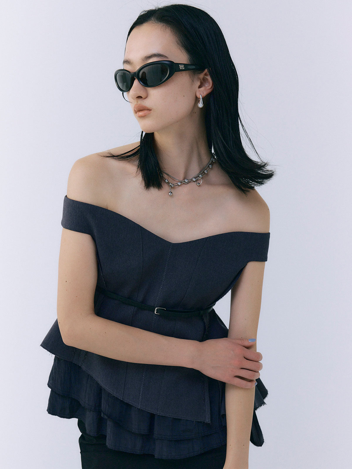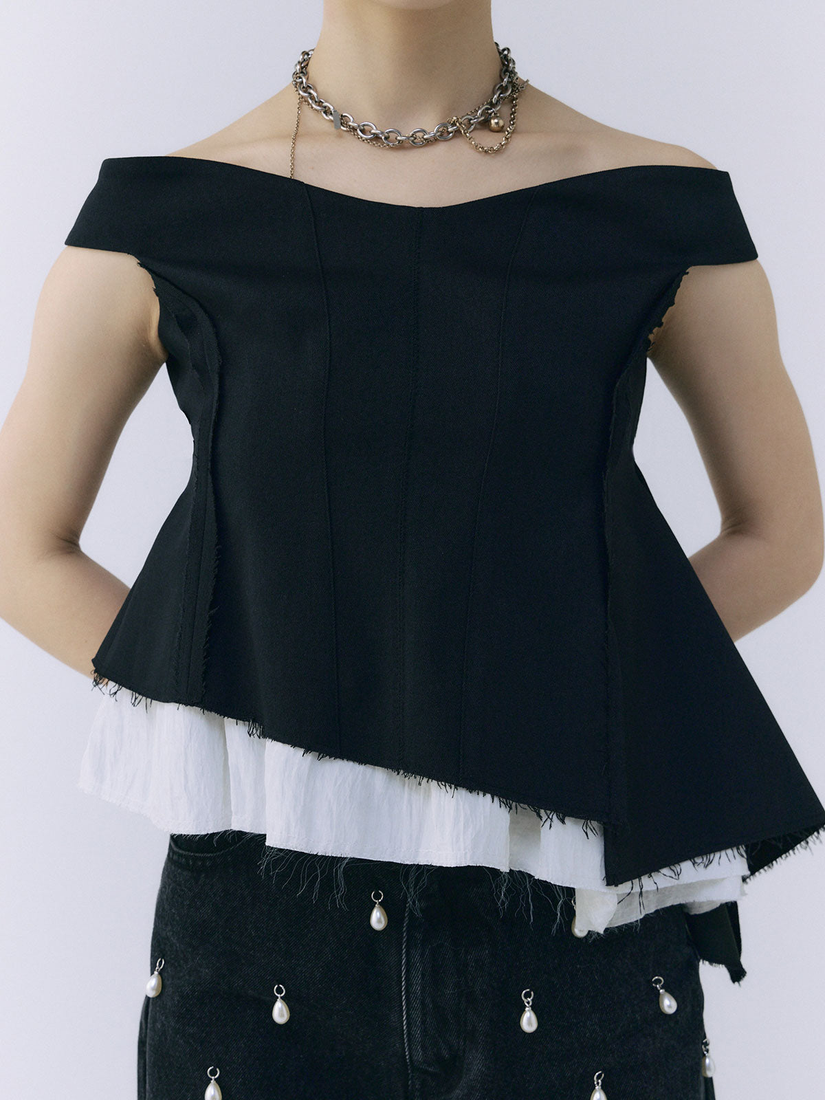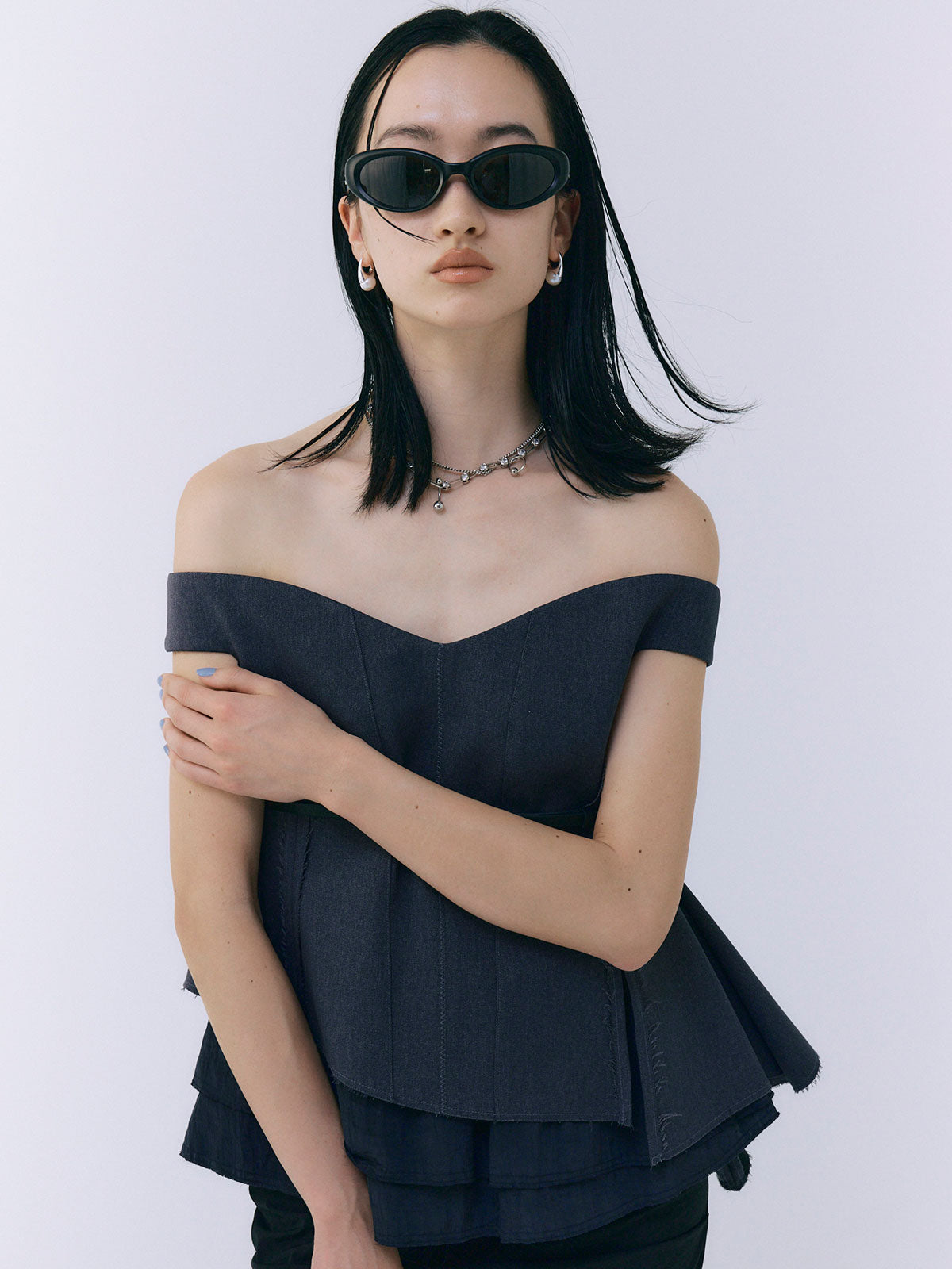 ボディラインを美しく魅せるペプラムブラウスはパネルラインの切り替えから裾に向かってふんわり広がるメリハリのあるシルエットです。
