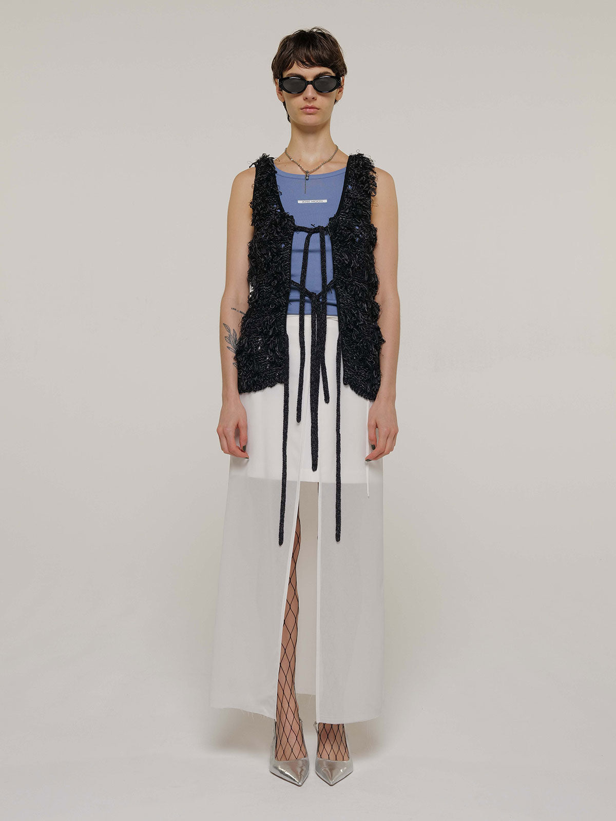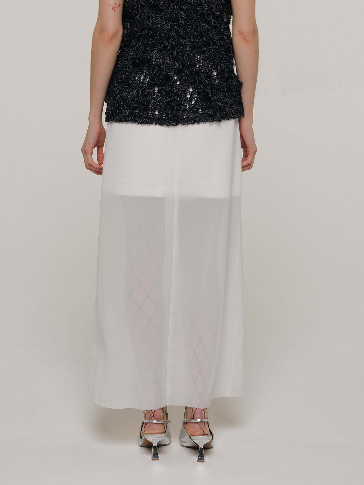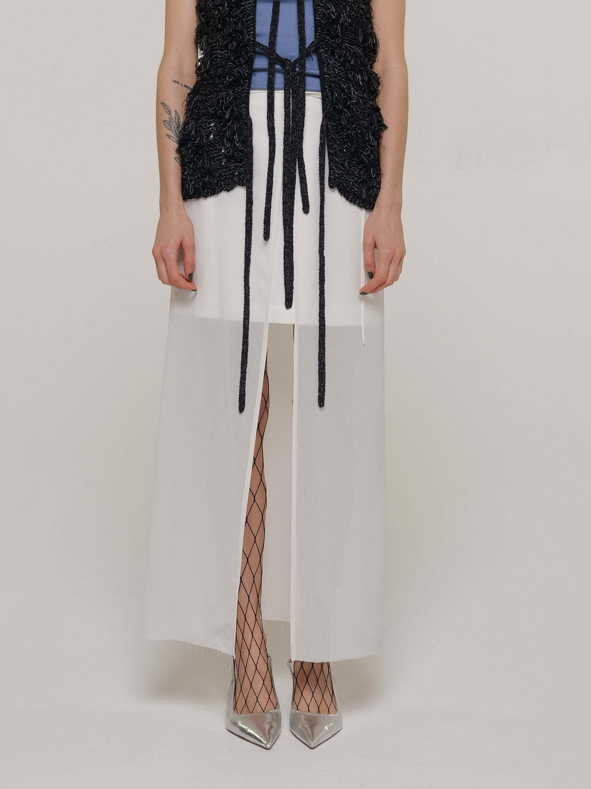 ボトムには異素材のミニスカートをレイヤードし、深めのスリットから覗くラインが、センシュアルかつストリートな印象を添えます。