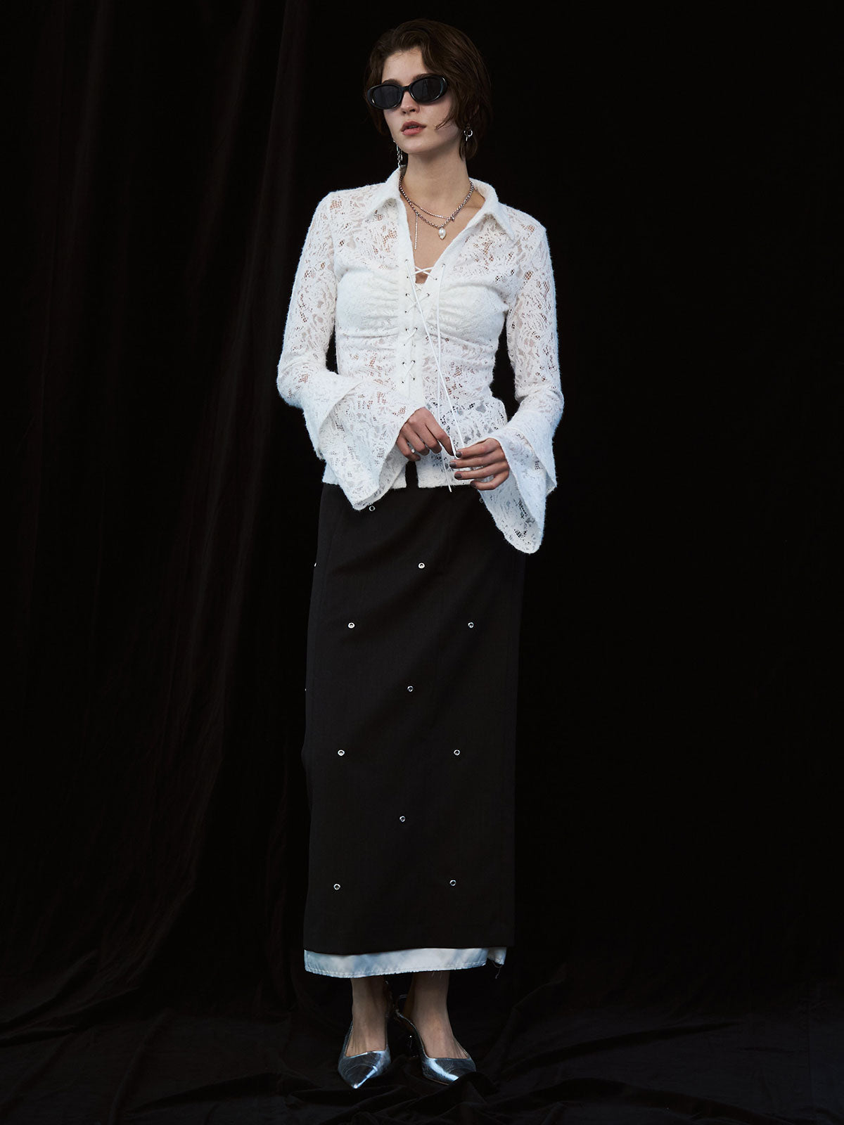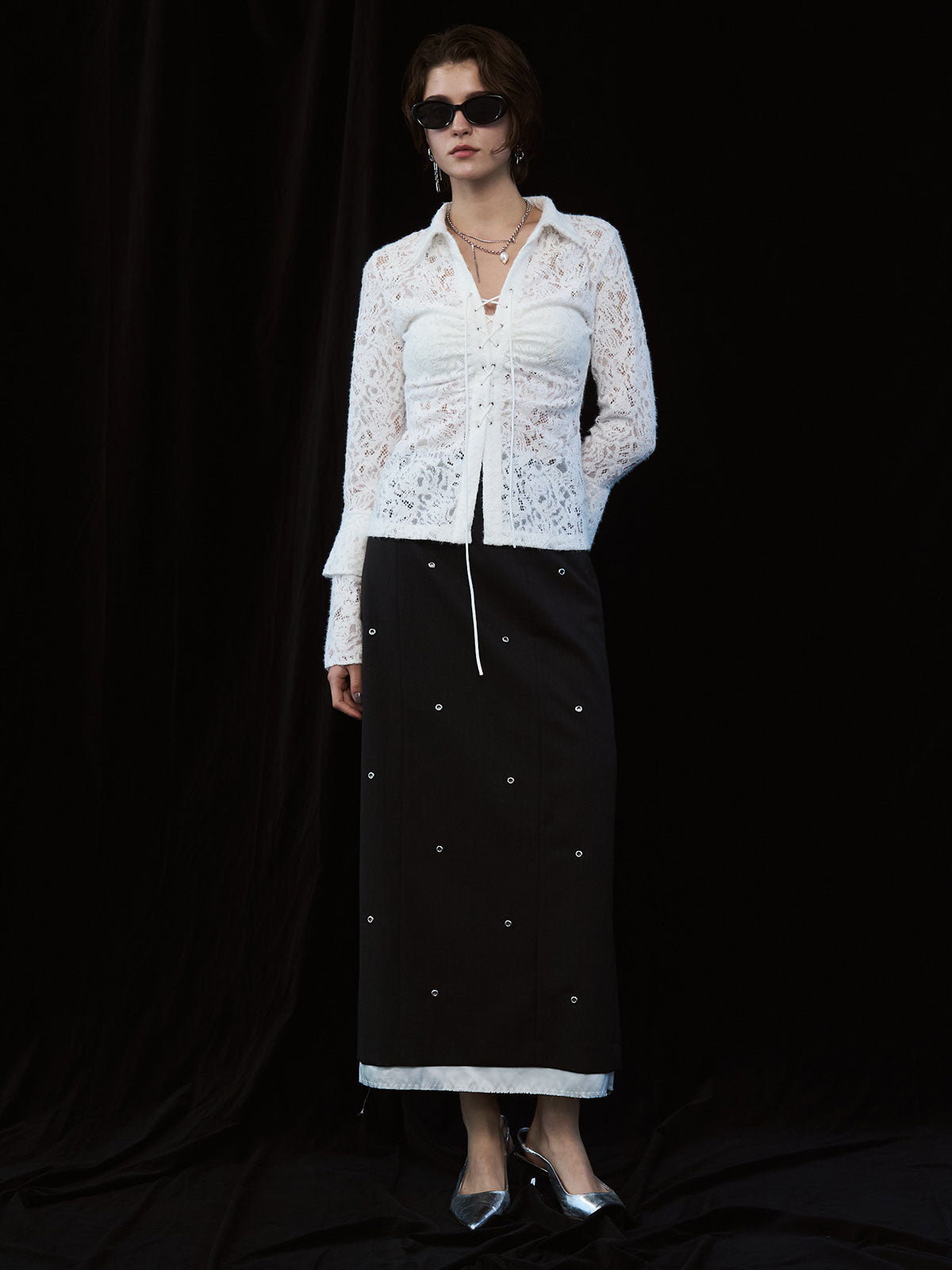 全体にハトメを打ち込み、ミニマルなシルエットにエッジをプラス。