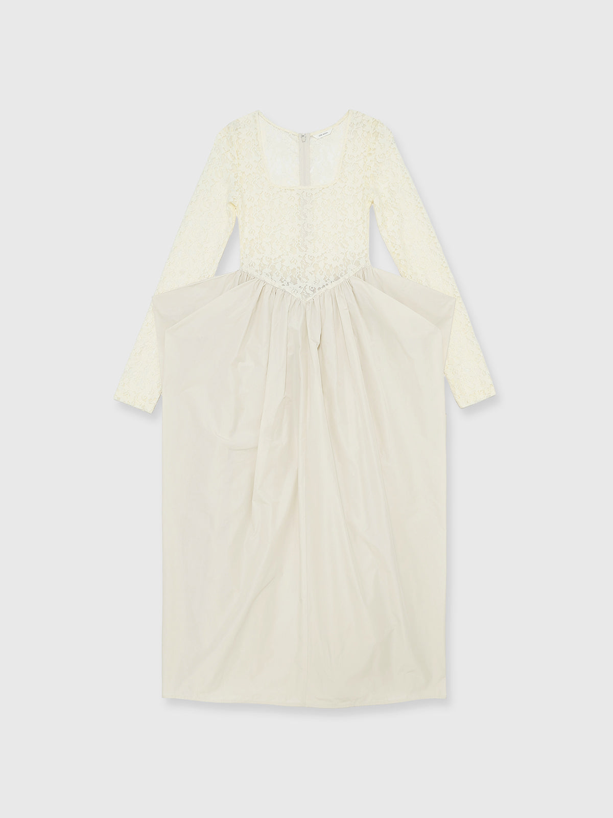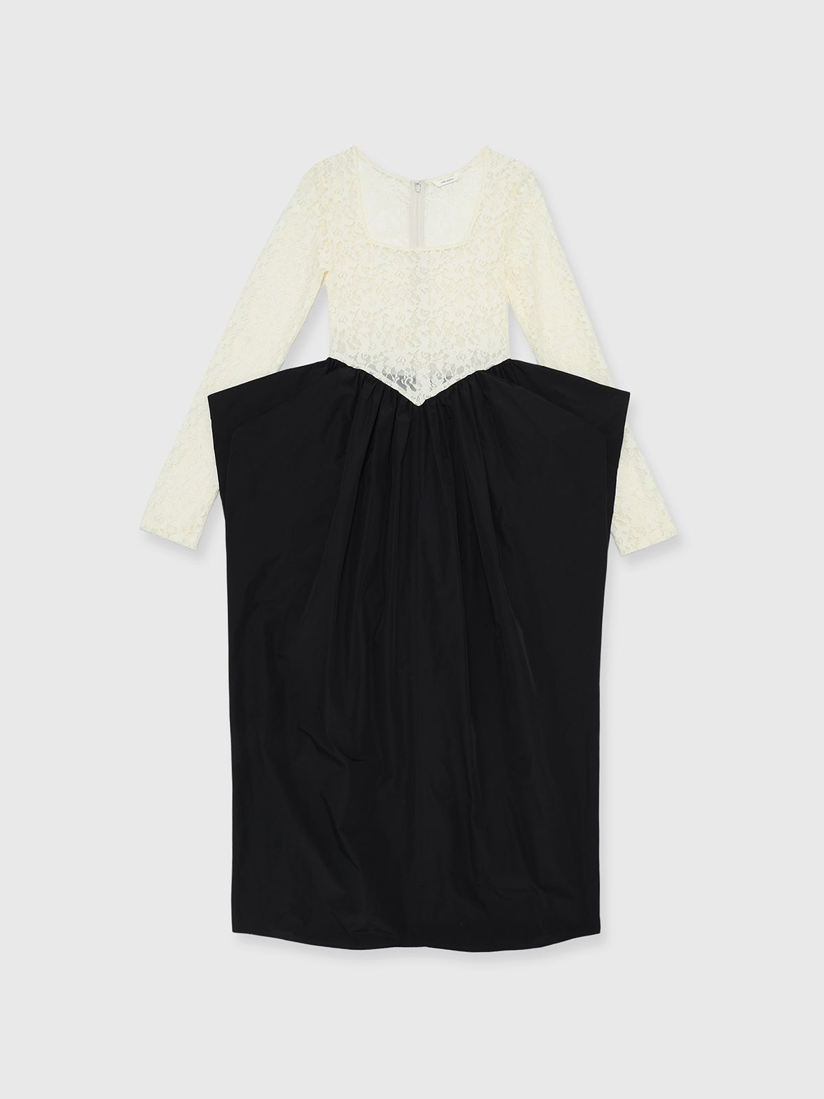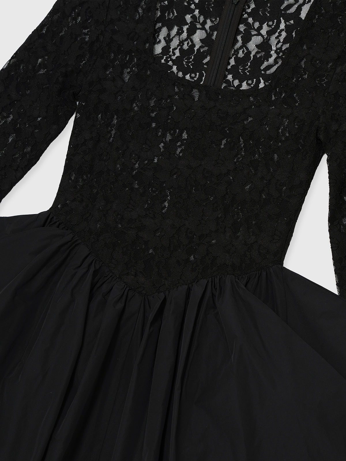 上見頃はしっかりとホールドした伸縮性のあるレース素材を使用しスカート部分は異素材でボリュームを持たせたワンピース。