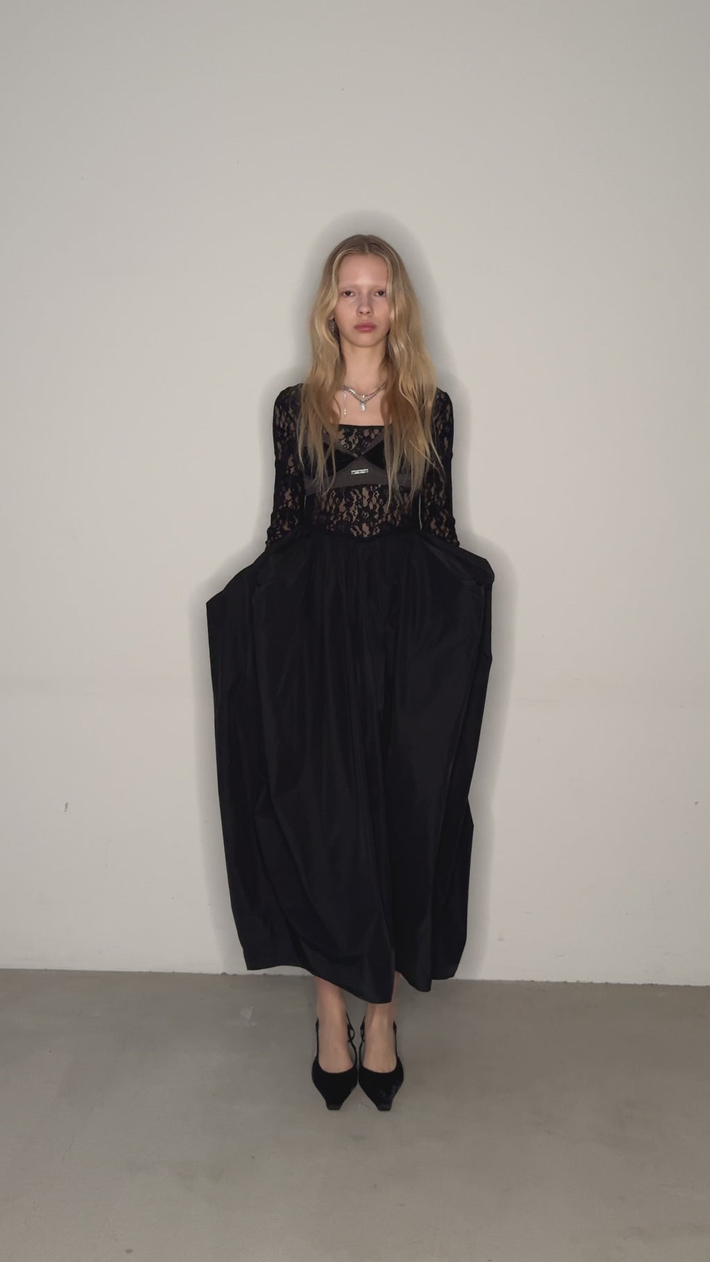 スカート部分は形状記憶タフタと特殊なタックで立体的なフォルムに導きます。