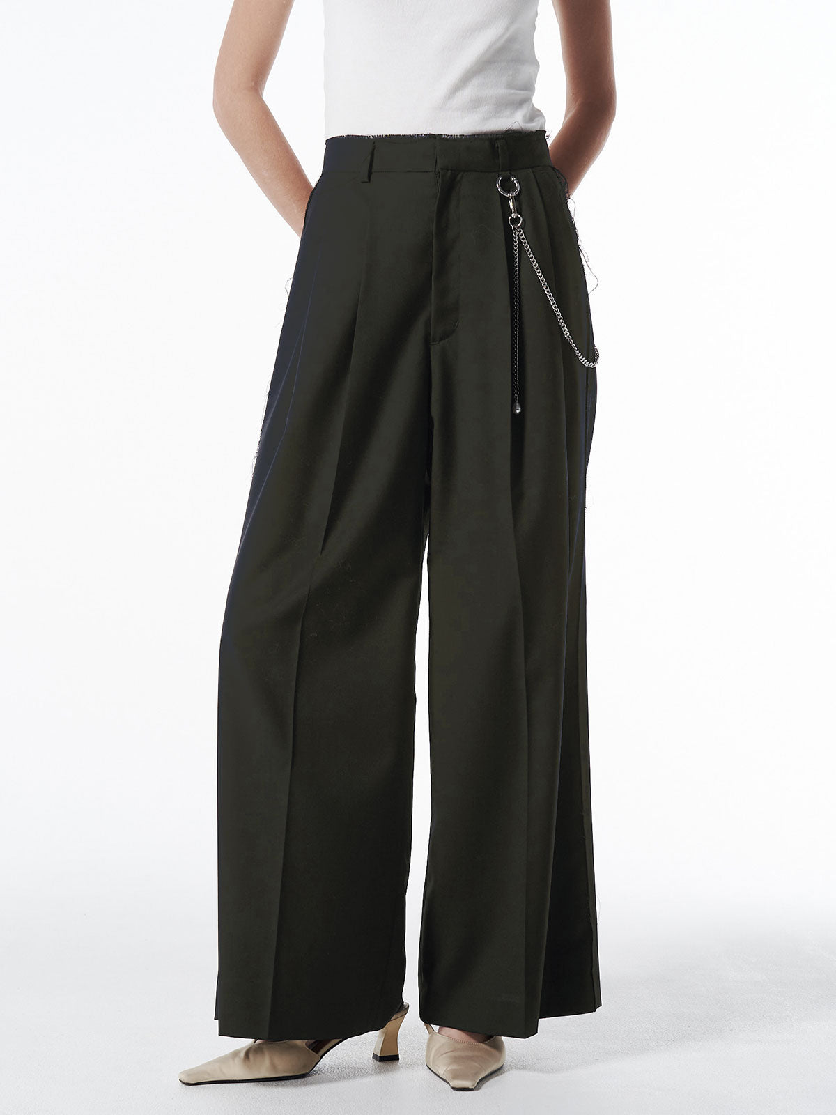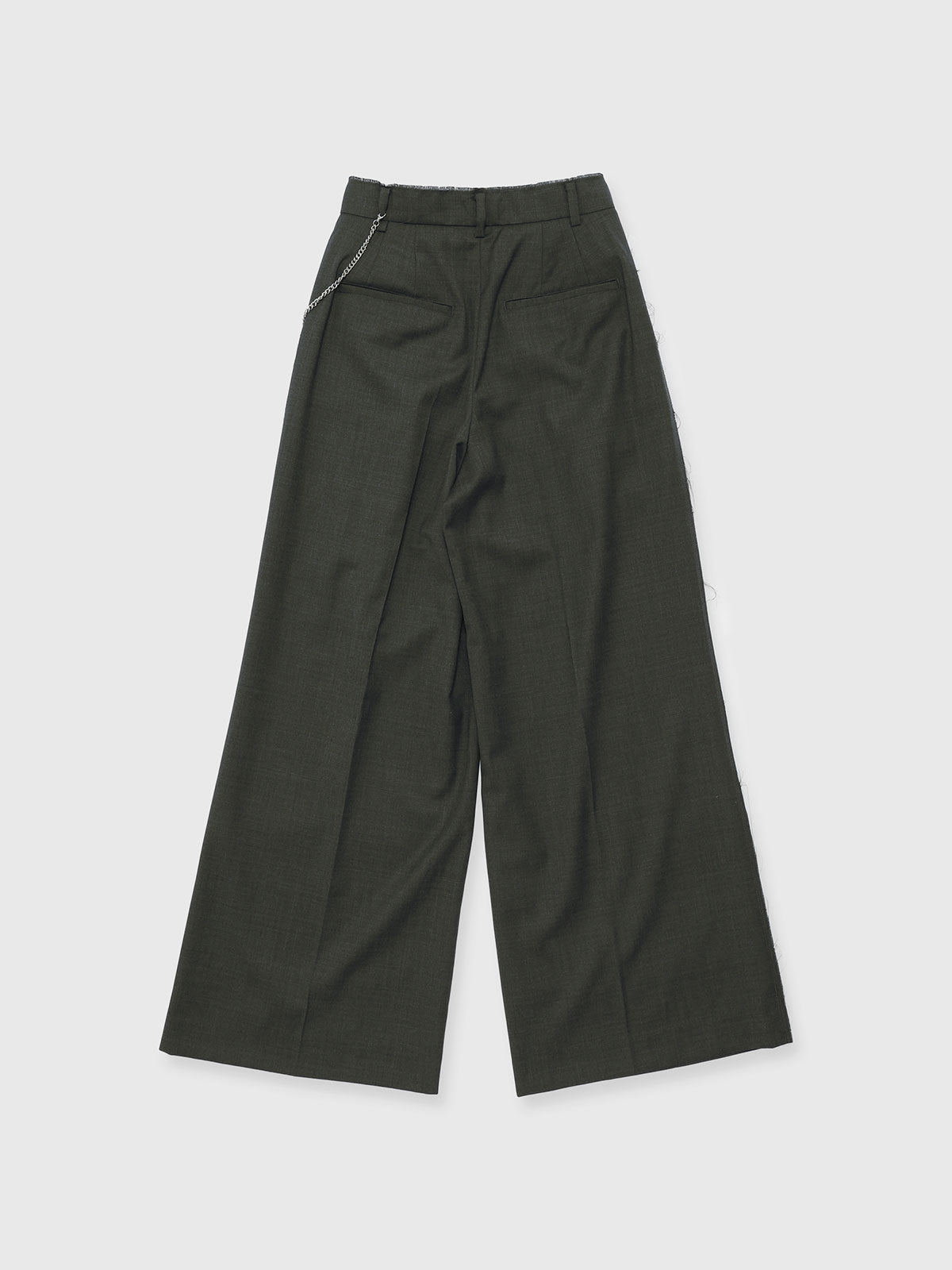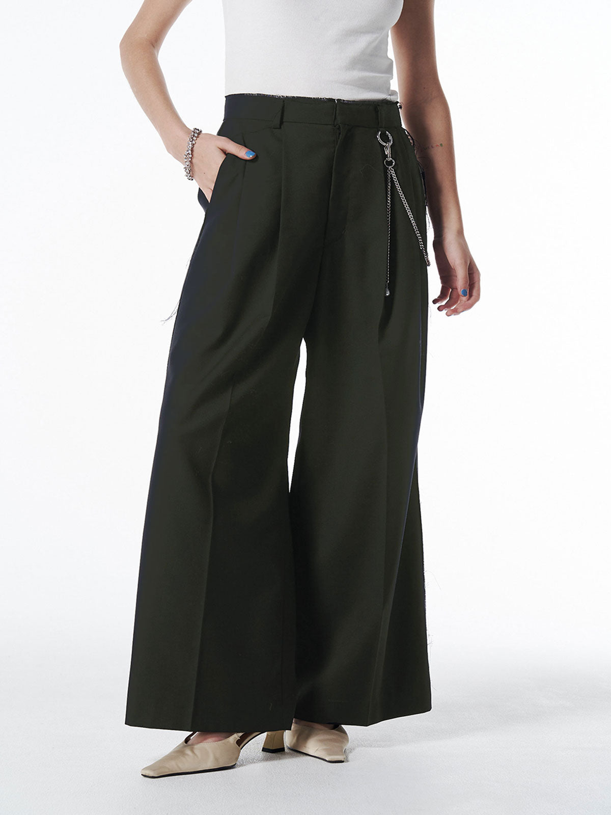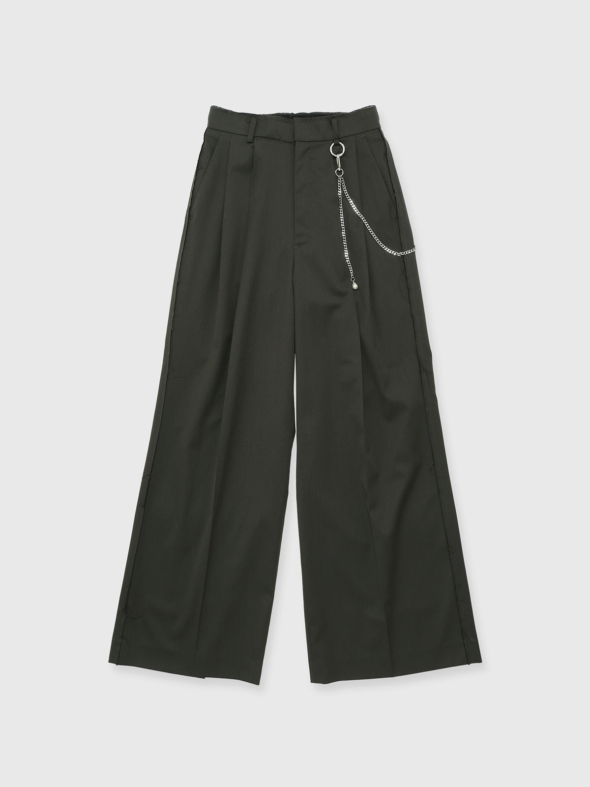 上質なウール素材を使用したシンプルなワイドパンツに、チェーンディテールをプラス。