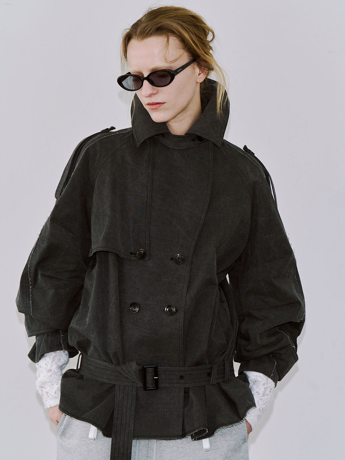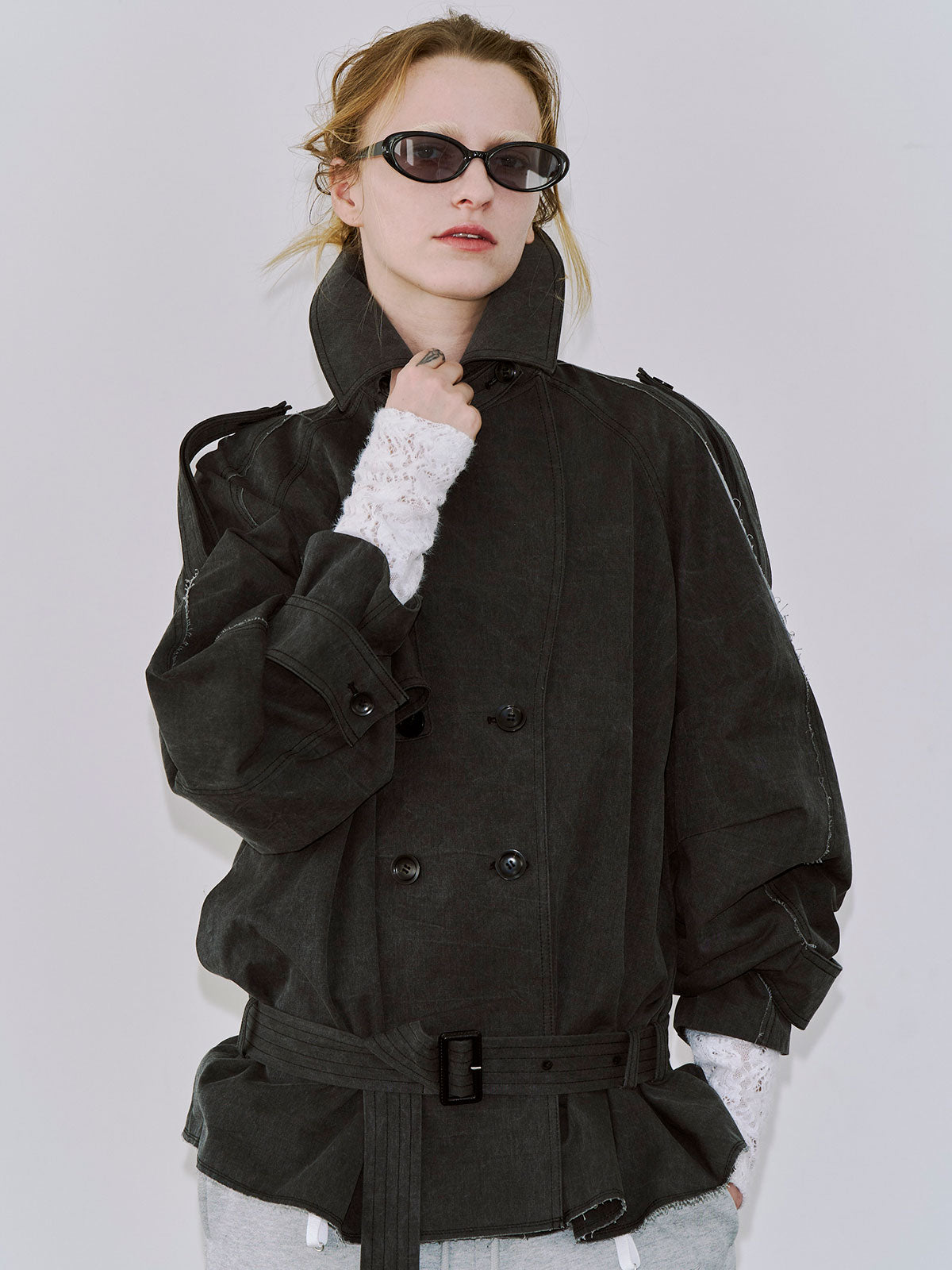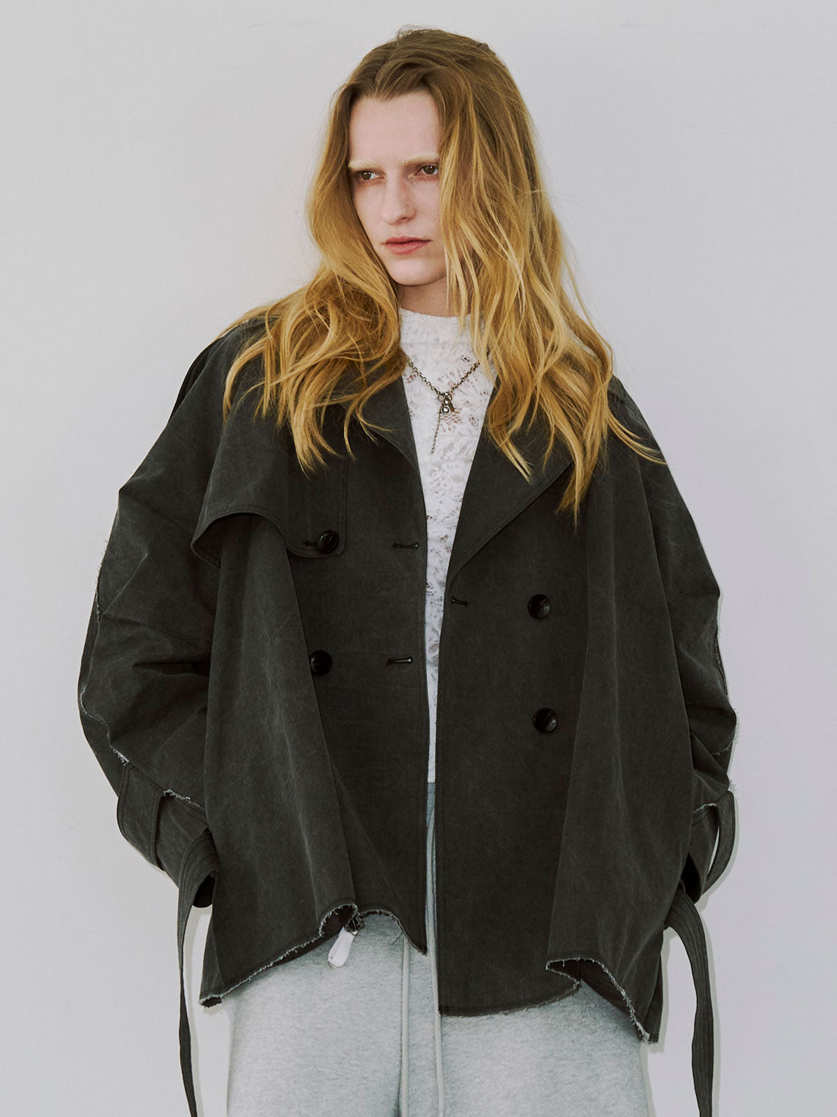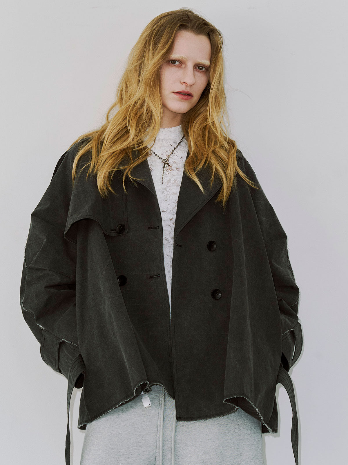 たっぷりとした見頃サイズと大きめの衿元はエッジの効いた佇まいを演出し