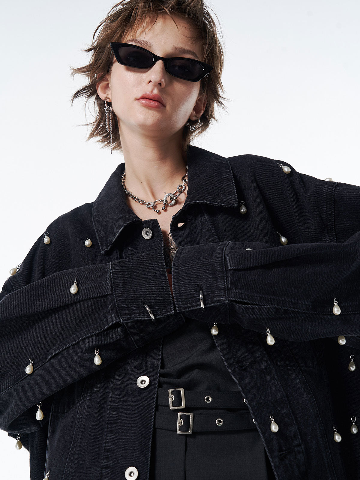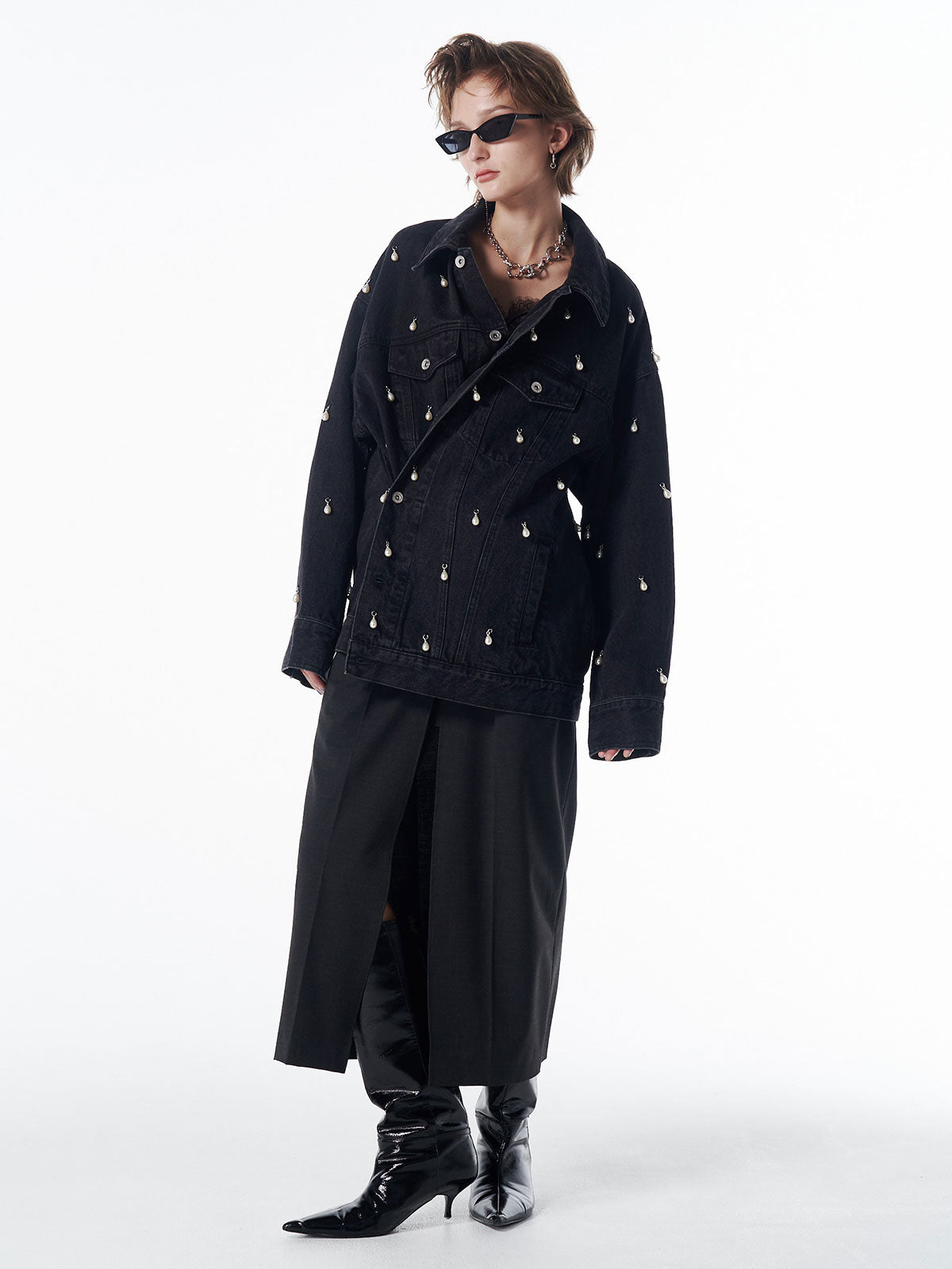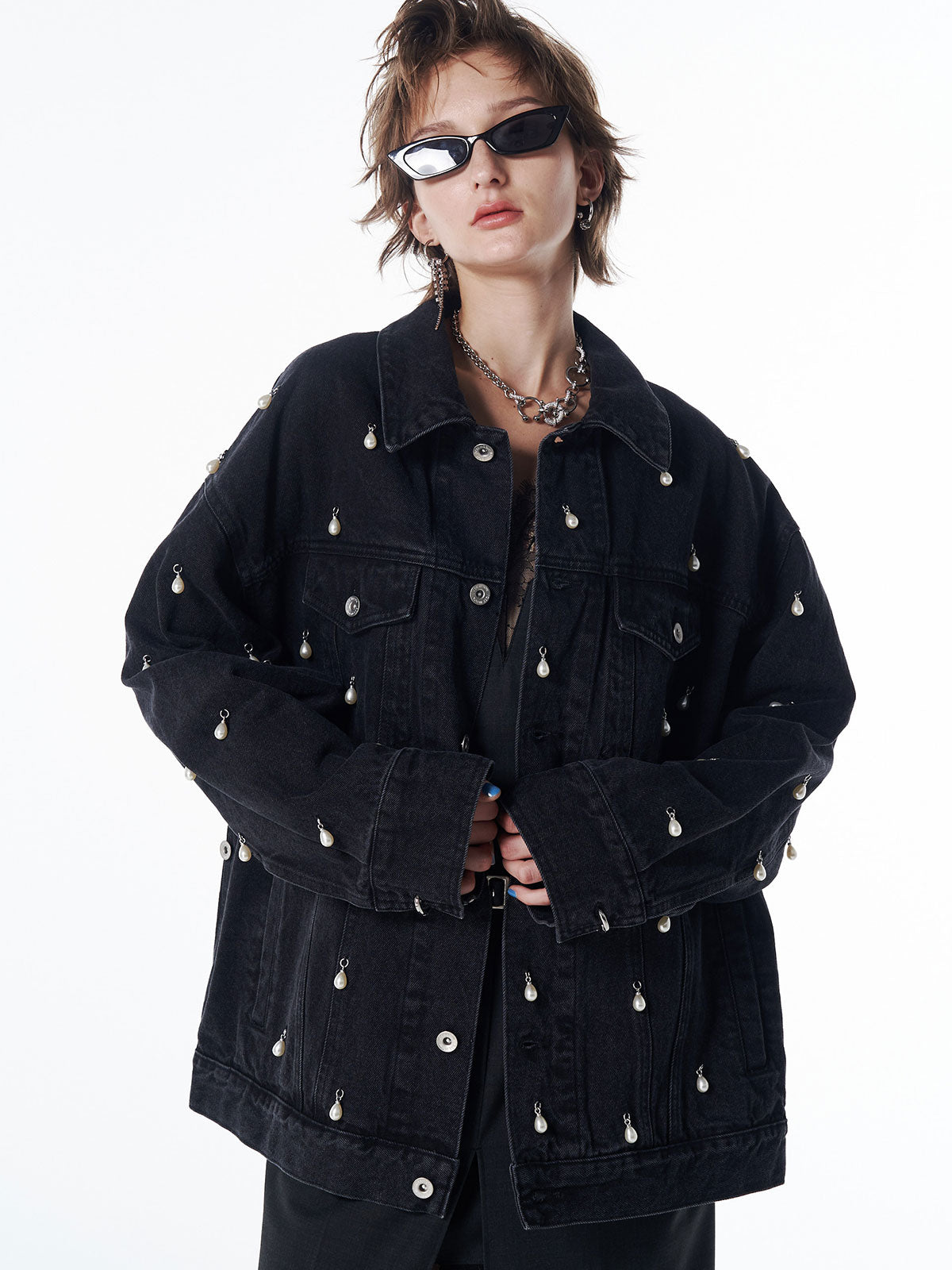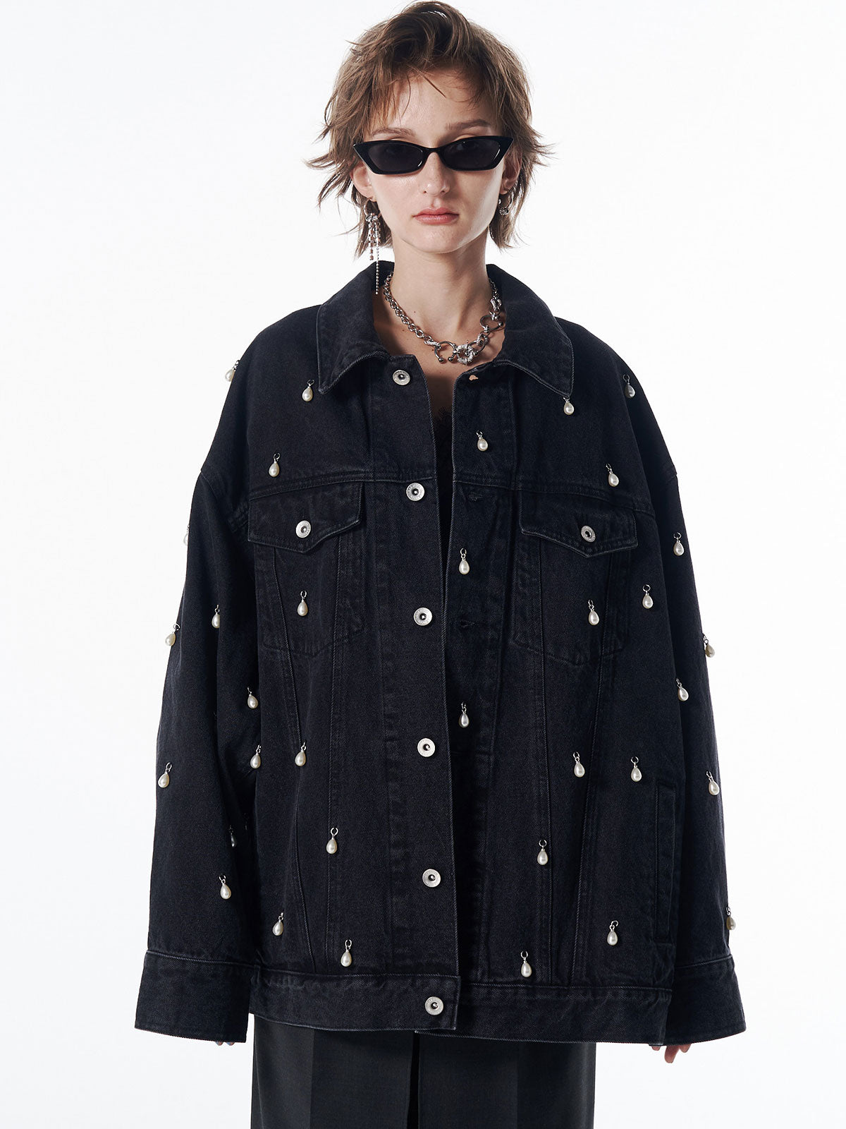オーバーサイズに仕上げたこのデニムジャケットは、リラックス感がありつつも、パールの輝きで一枚で存在感抜群。