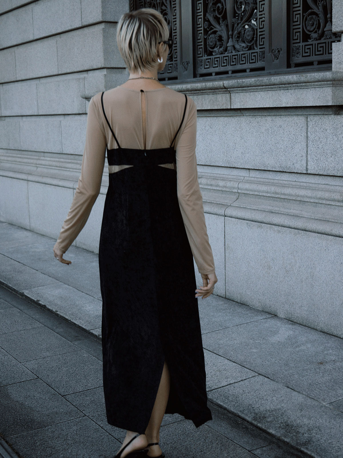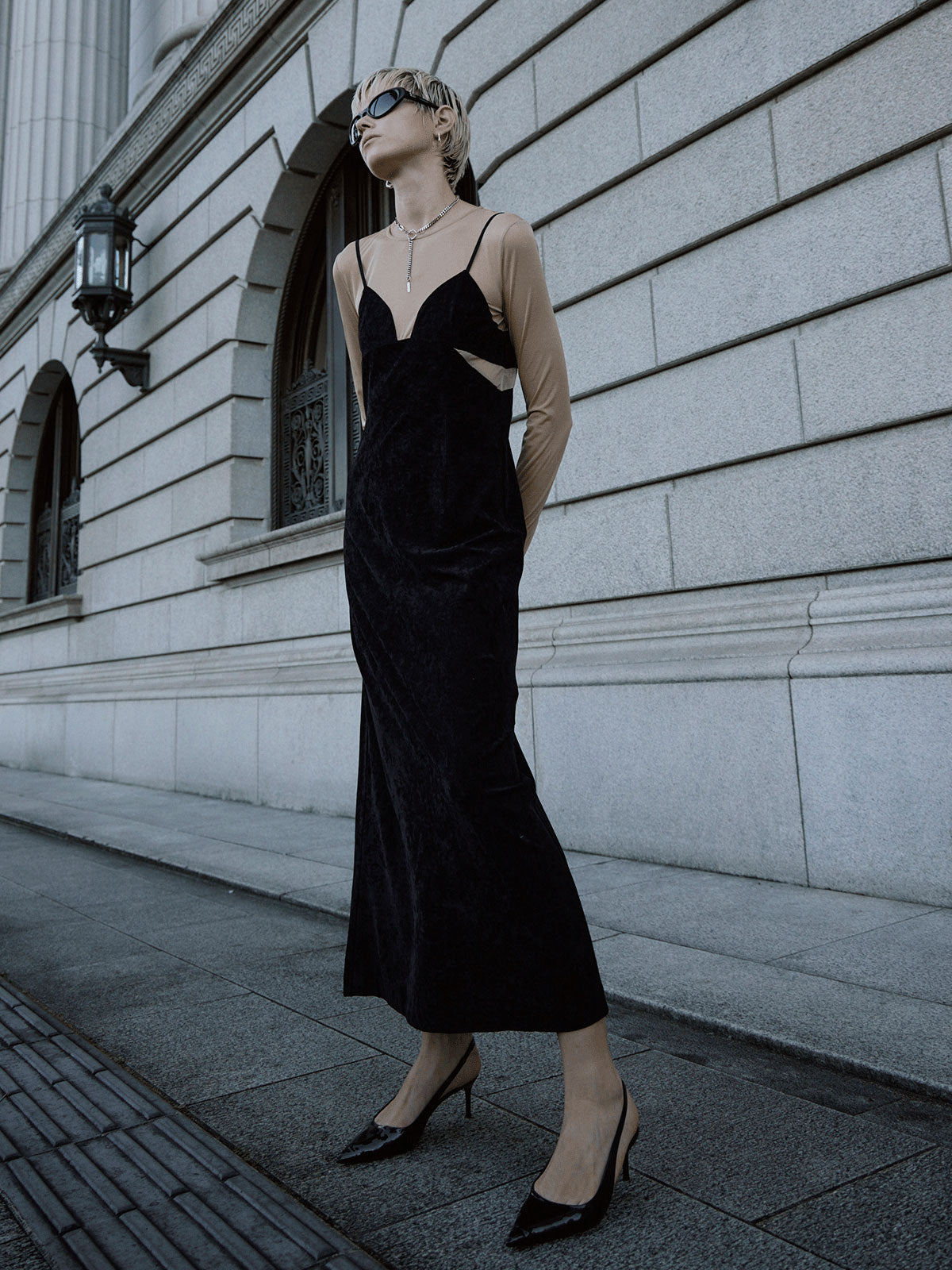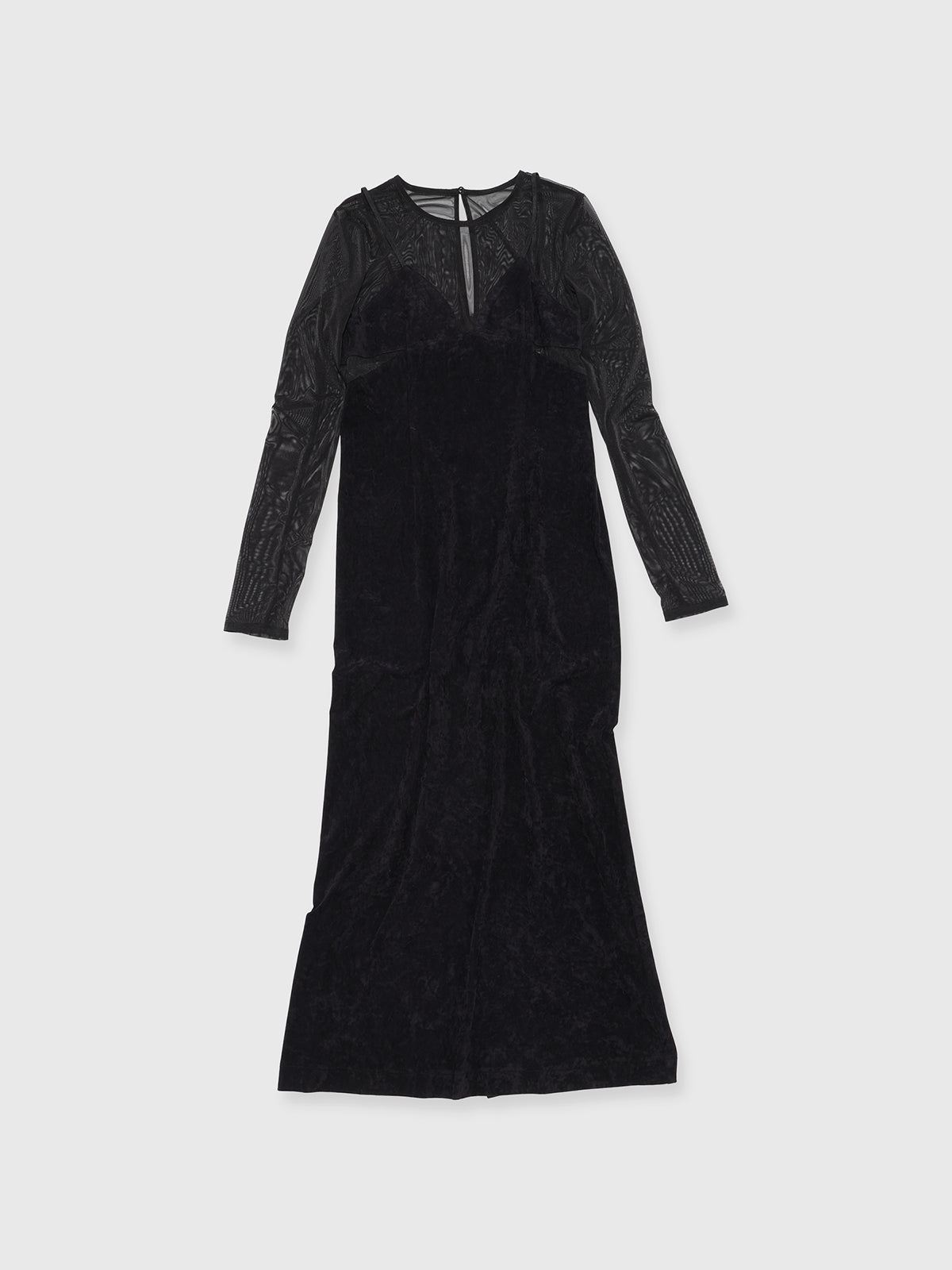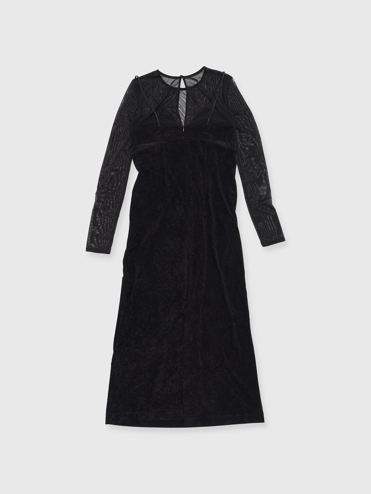 クラッシュベロアのトレンド感のある素材とシアー組み合わせたワンピース。