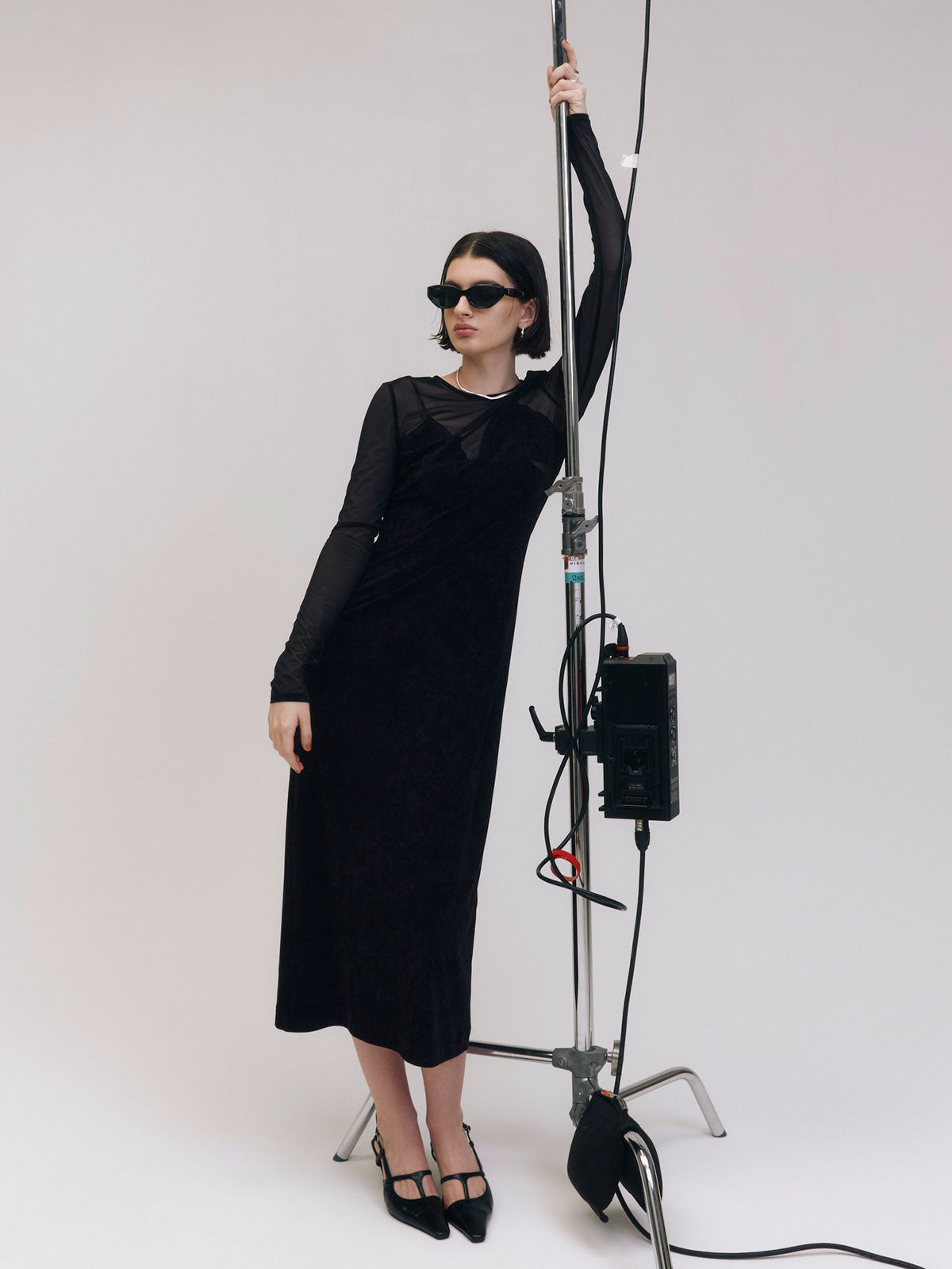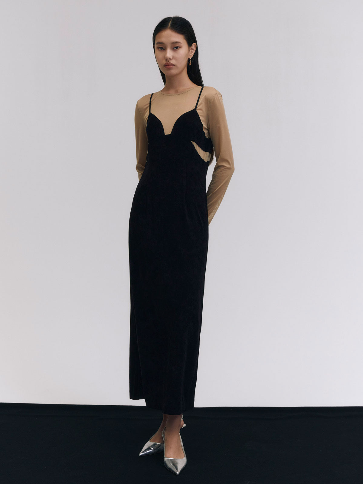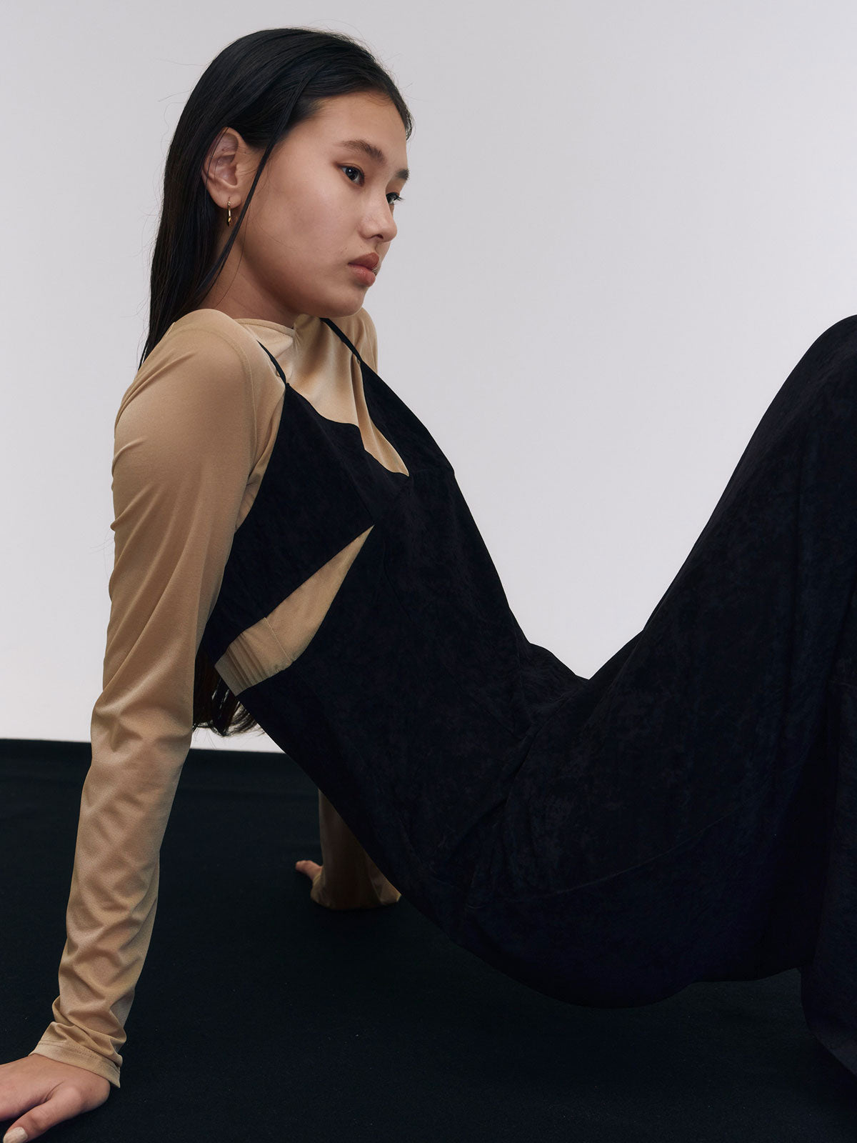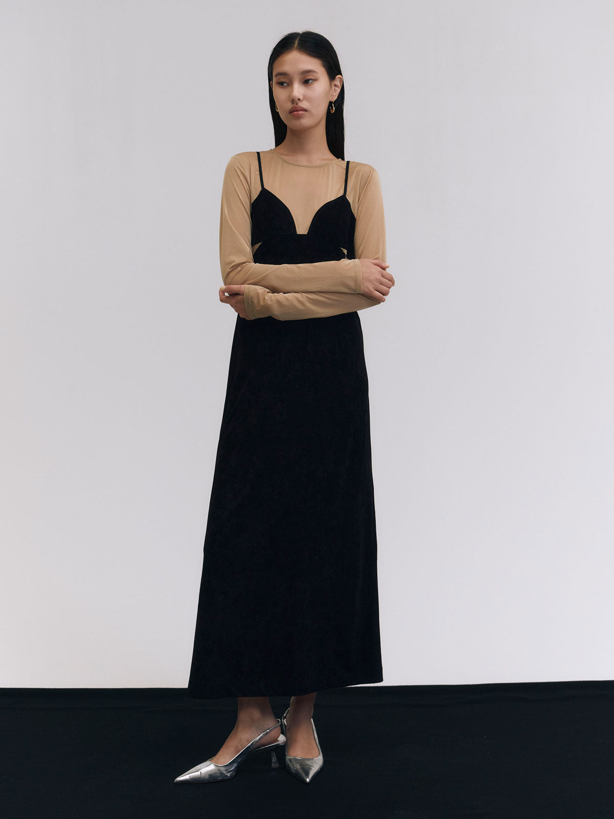 クラッシュベロアのトレンド感のある素材とシアー組み合わせたワンピース。