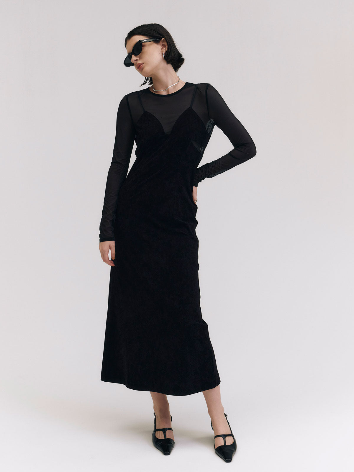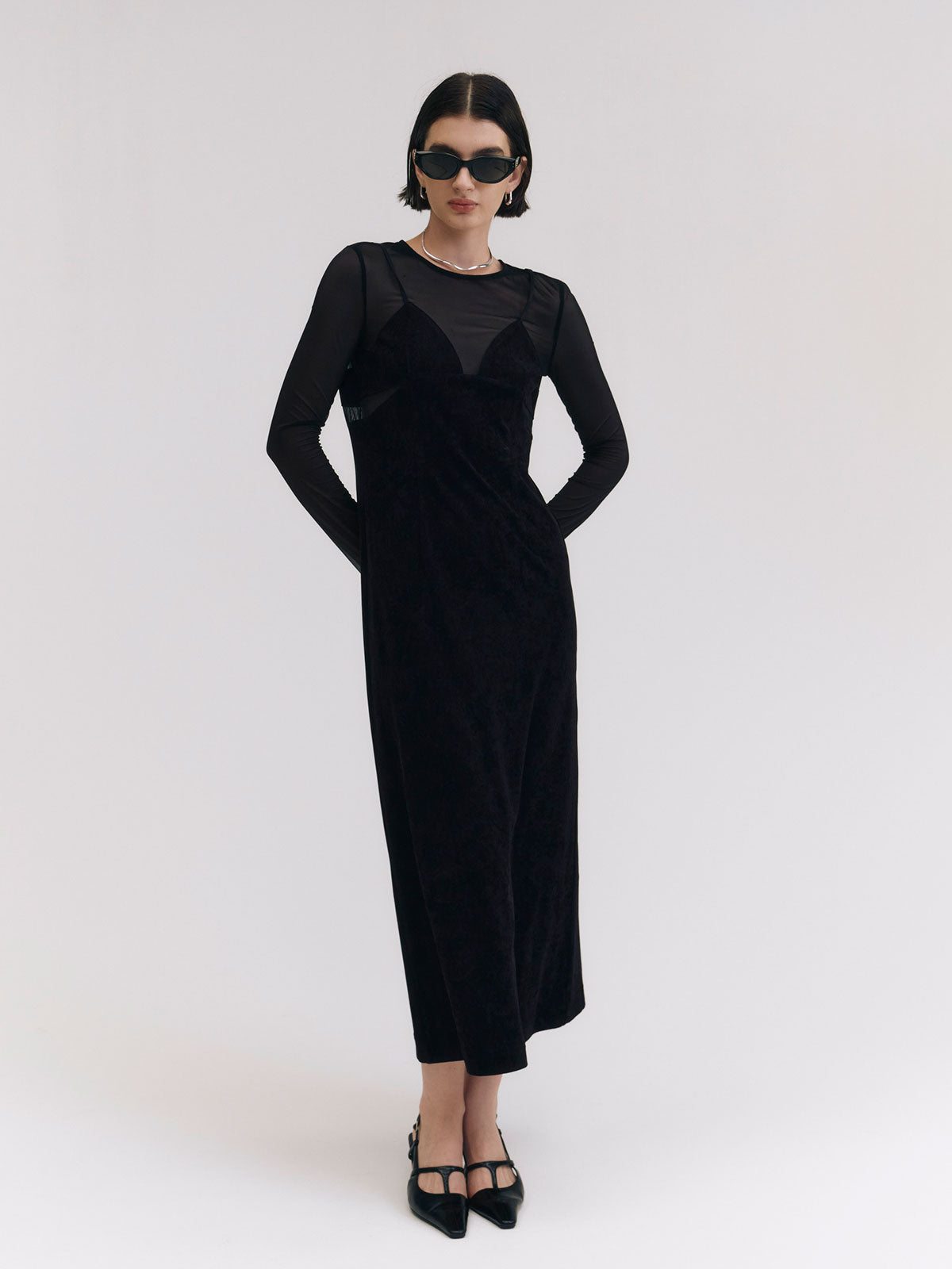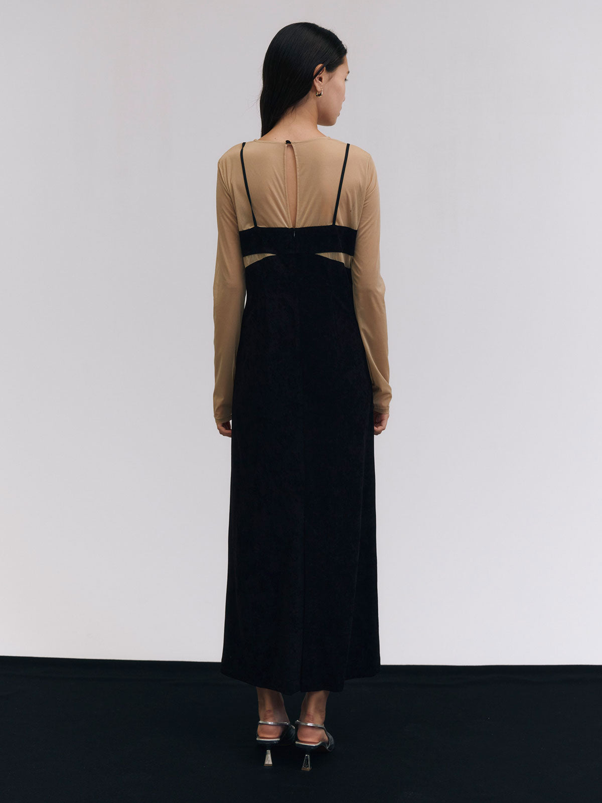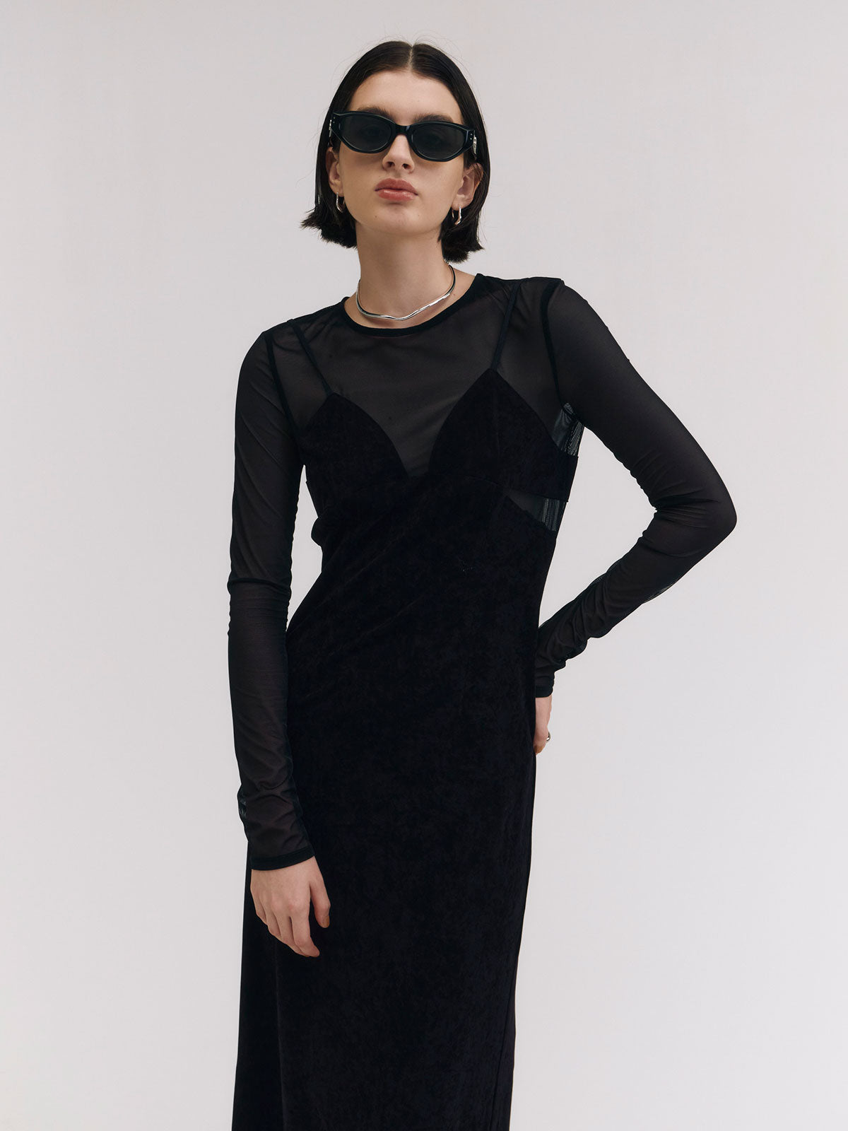 クラッシュベロアのトレンド感のある素材とシアー組み合わせたワンピース。