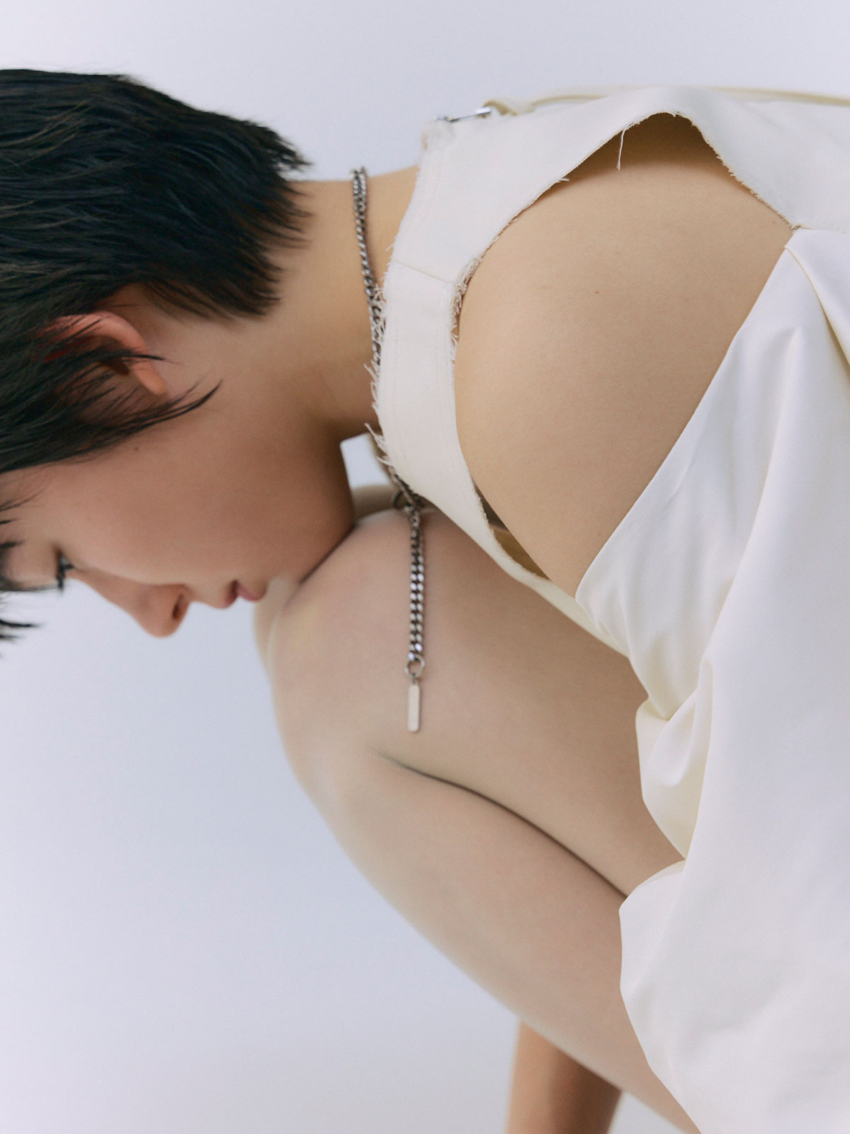 着丈を敢えて長めに仕上げミニワンピースのような雰囲気に。