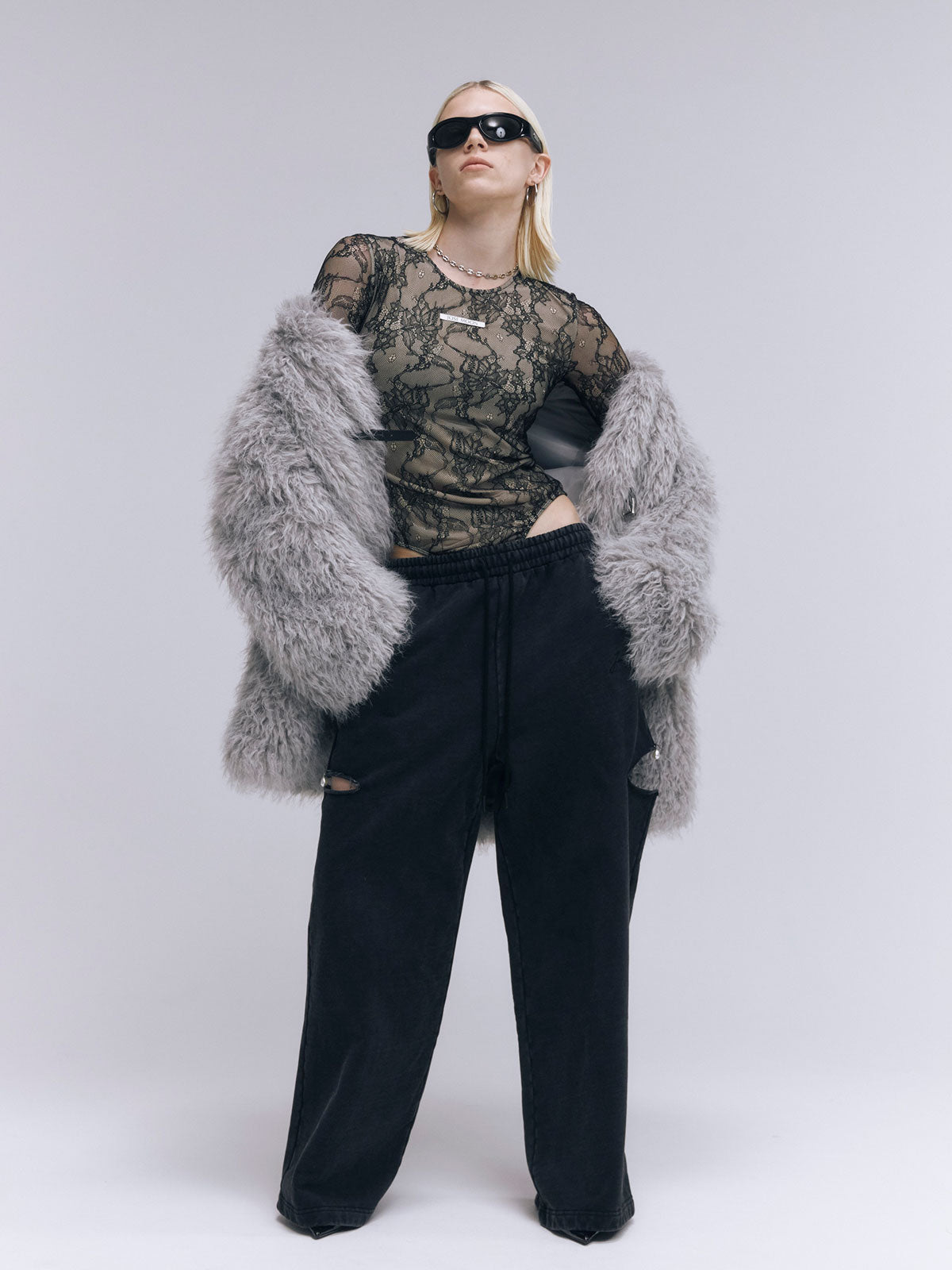 太めのシルエットのスリットから覗く足のラインを視覚的に細く見せ、肌見せすることでスウェットでも女性らしさのある印象に。
