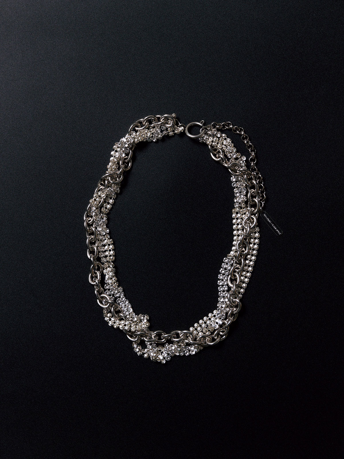 ブロンズやアンティークシルバー加工のチェーンやヴィンテージ素材に、彼女独自のセンスを加える事によって、コンテンポラリーでより魅力的なアクセサリーに仕上がっている。