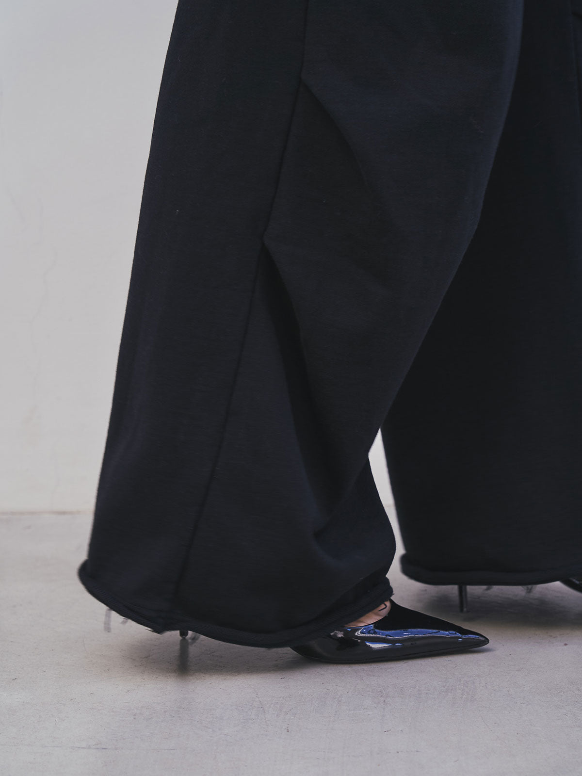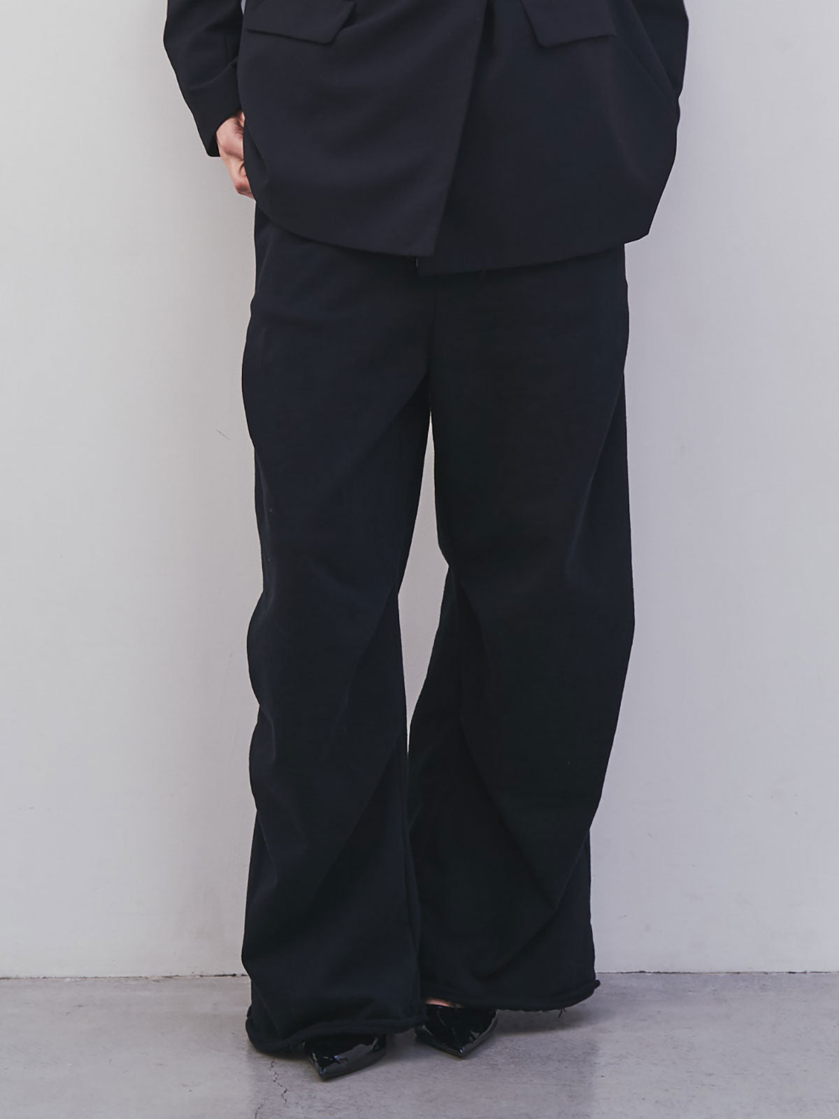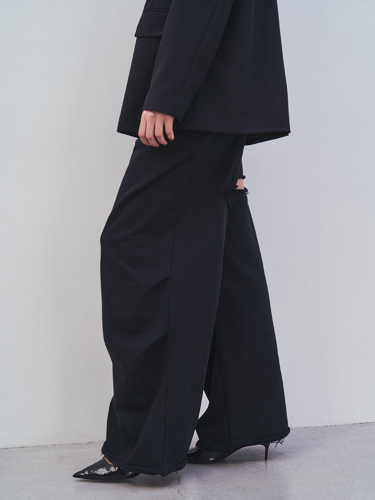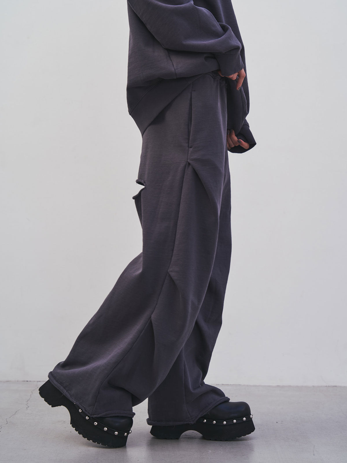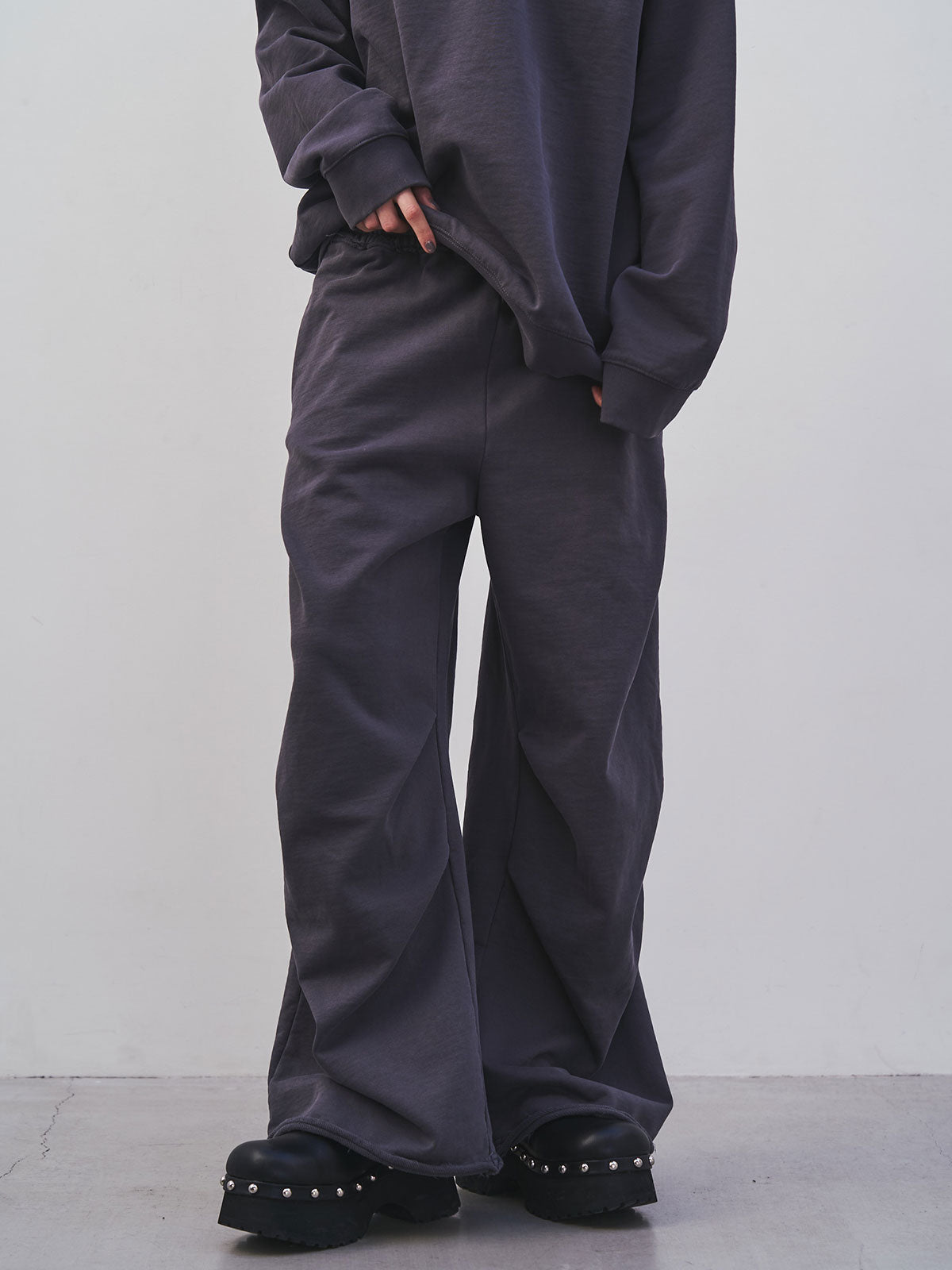 膝にタックを入れることで立体的なボリュームを生み出したスウェットパンツ。