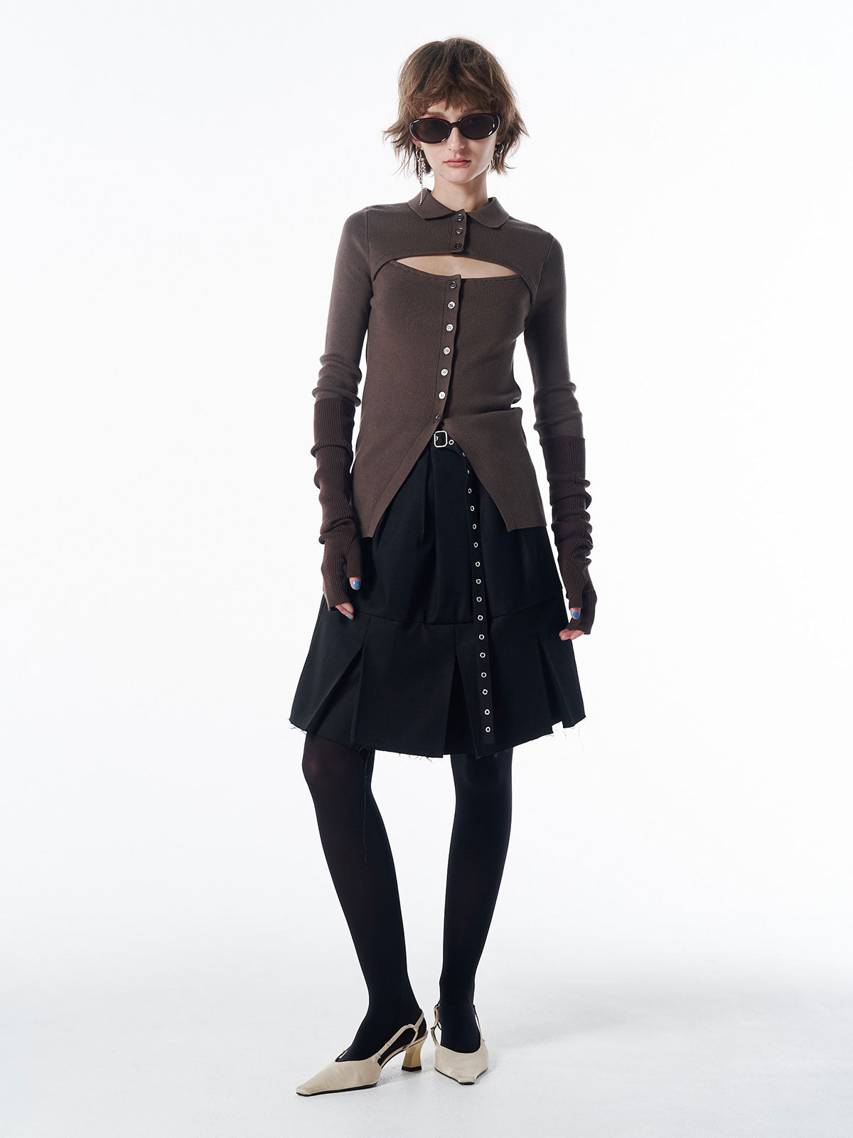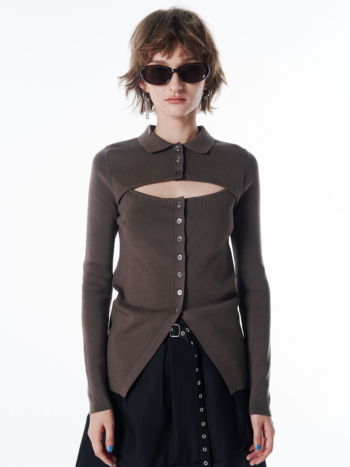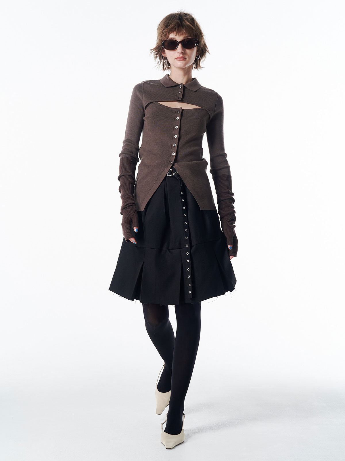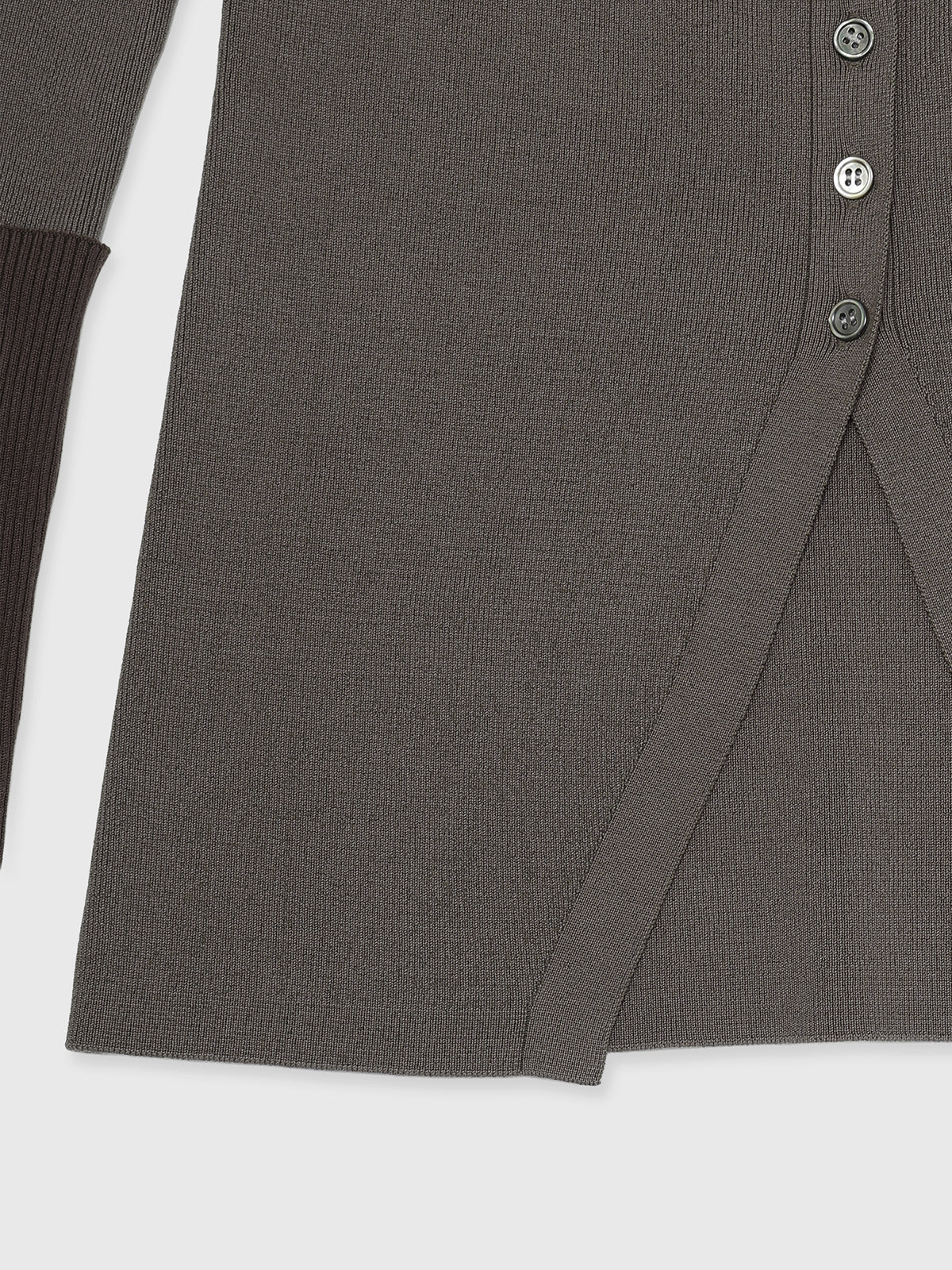 バスト部分に施したカッティングが目を引くニットはカーディガンとしても、トップスとしても着用いただけます。