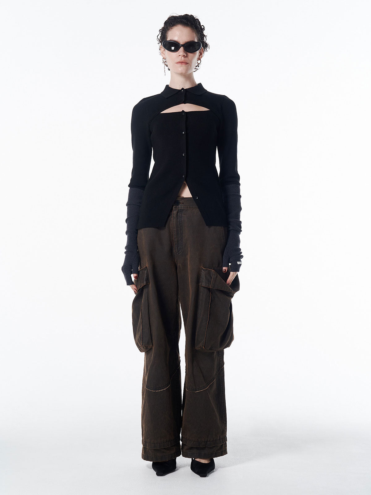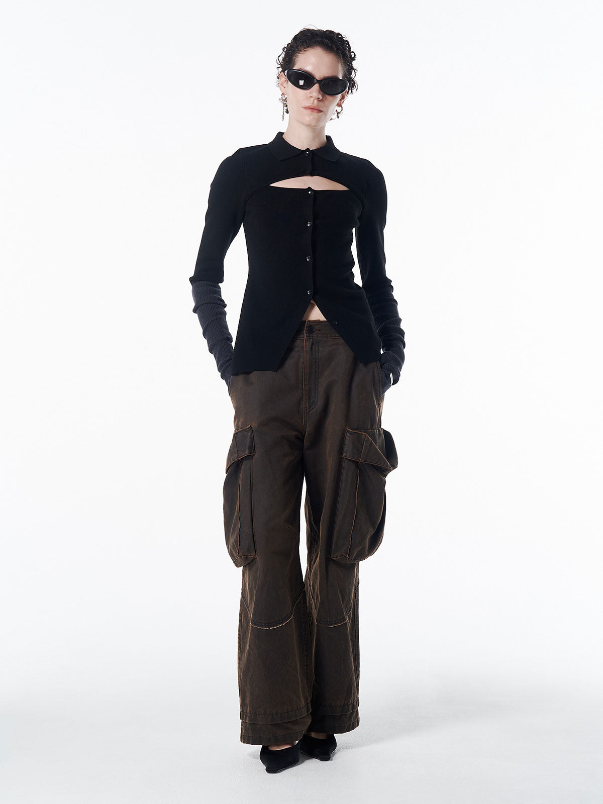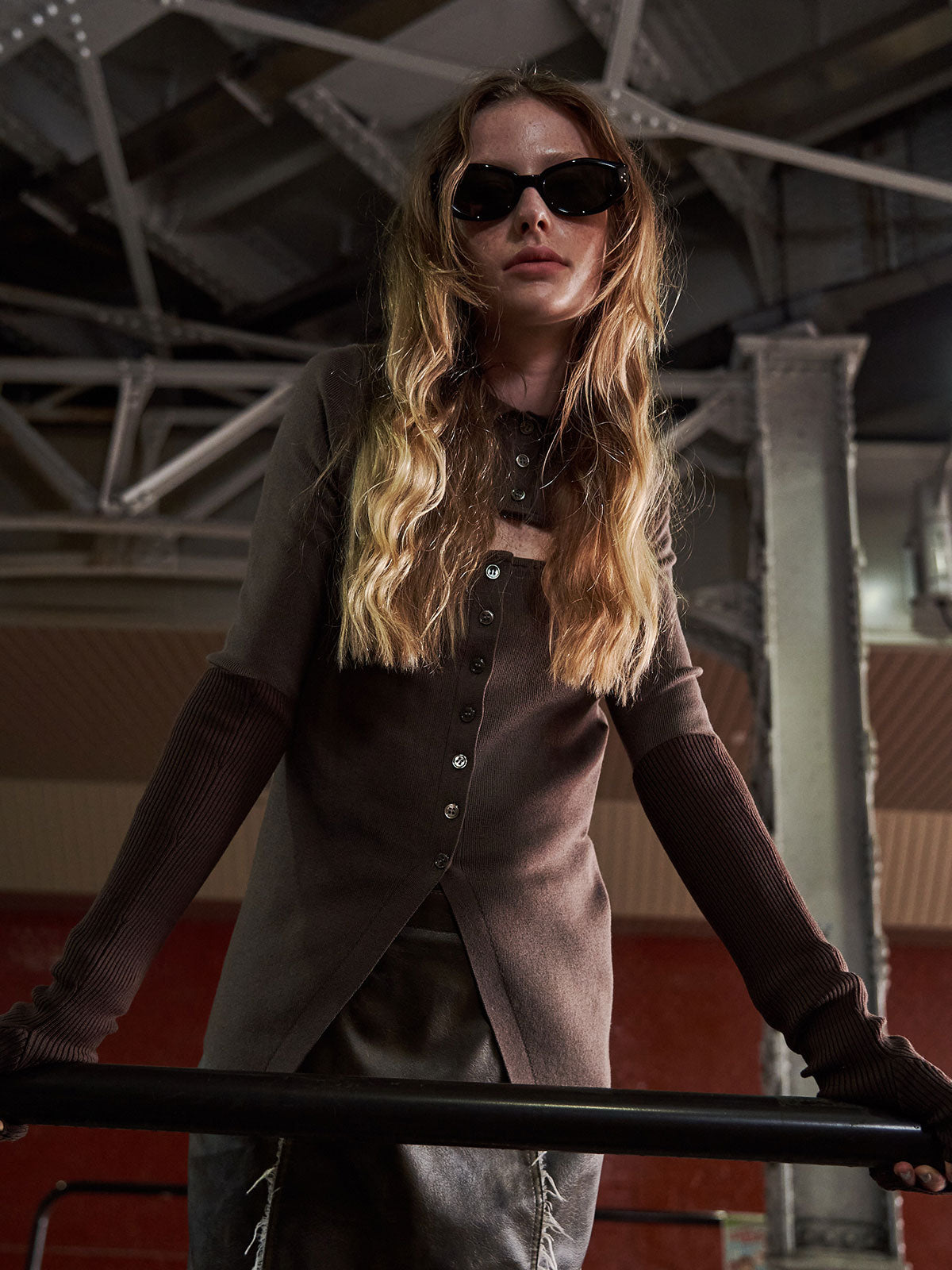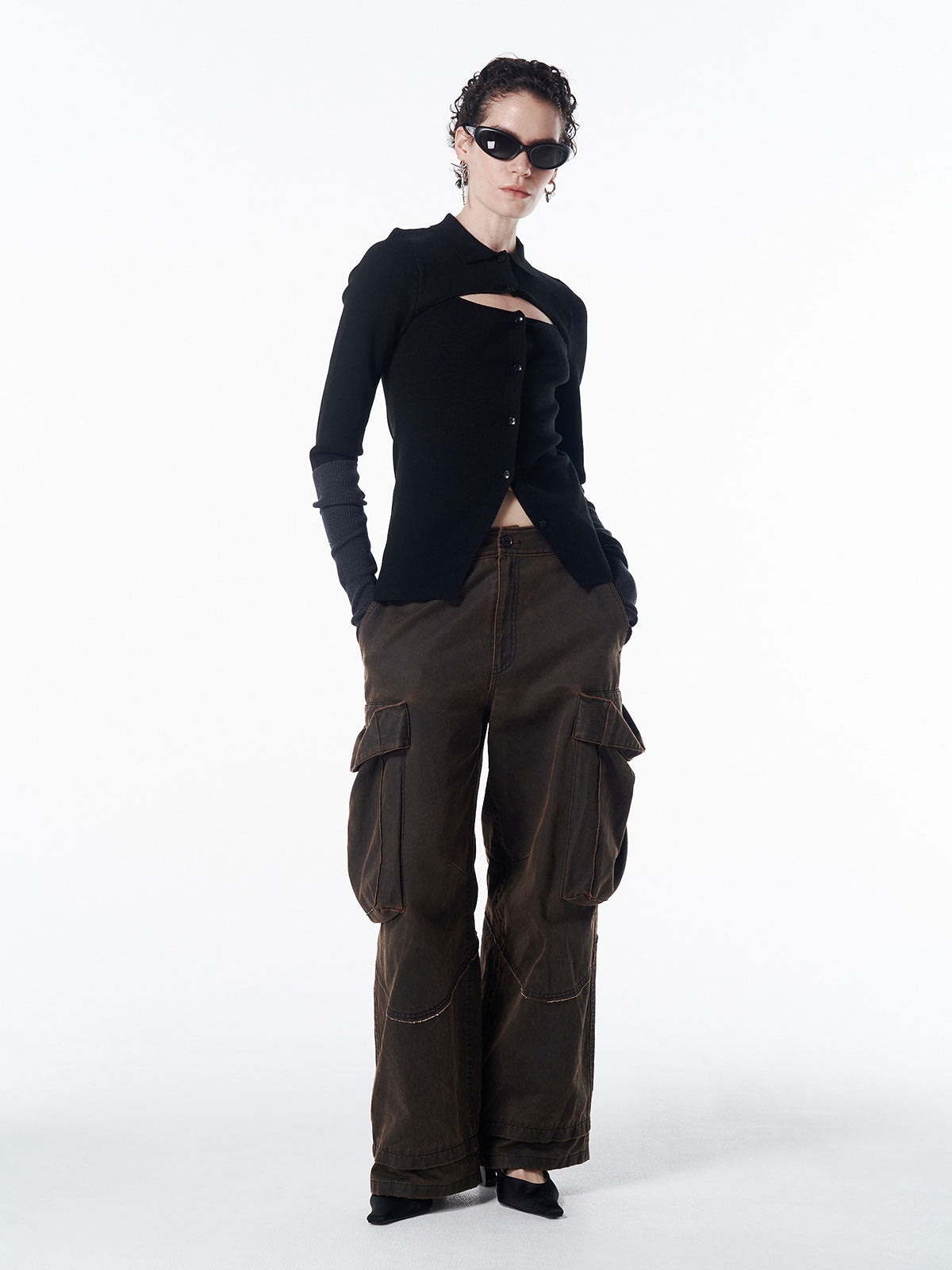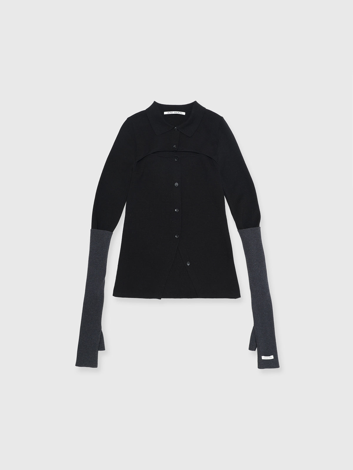 バスト部分に施したカッティングが目を引くニットはカーディガンとしても、トップスとしても着用いただけます。