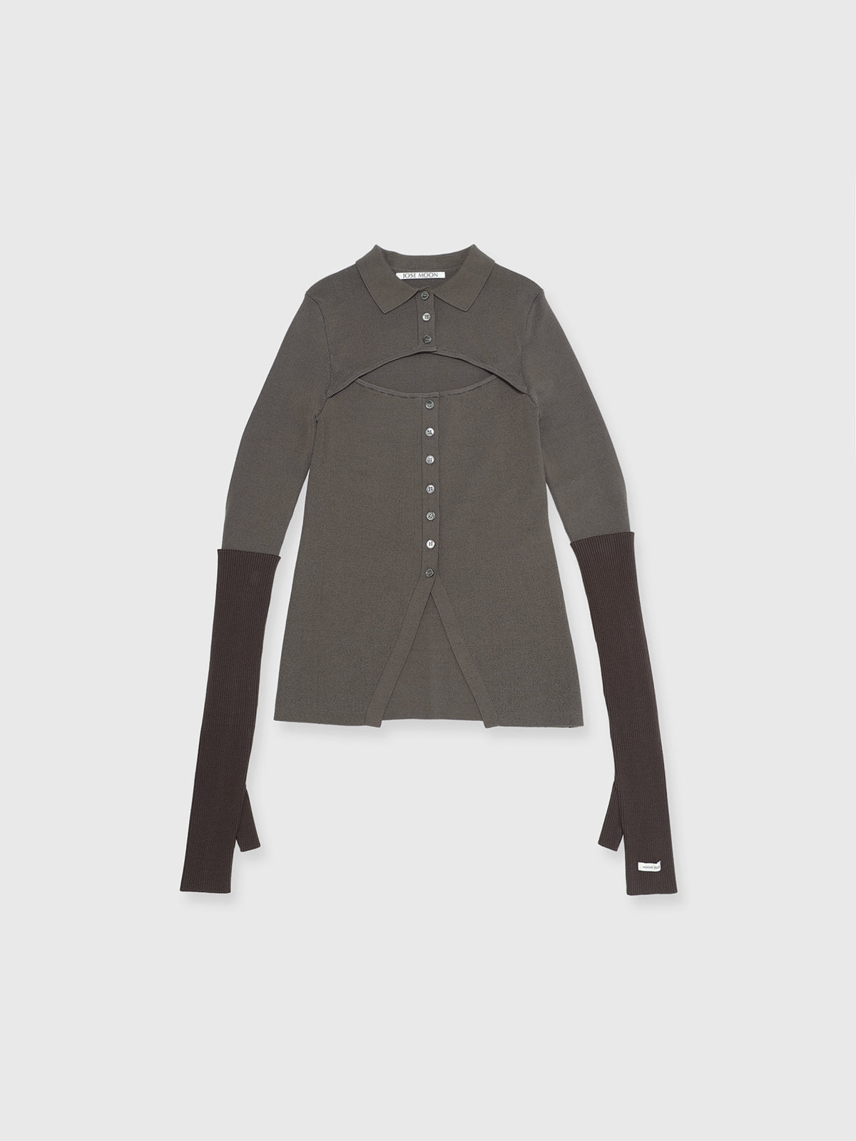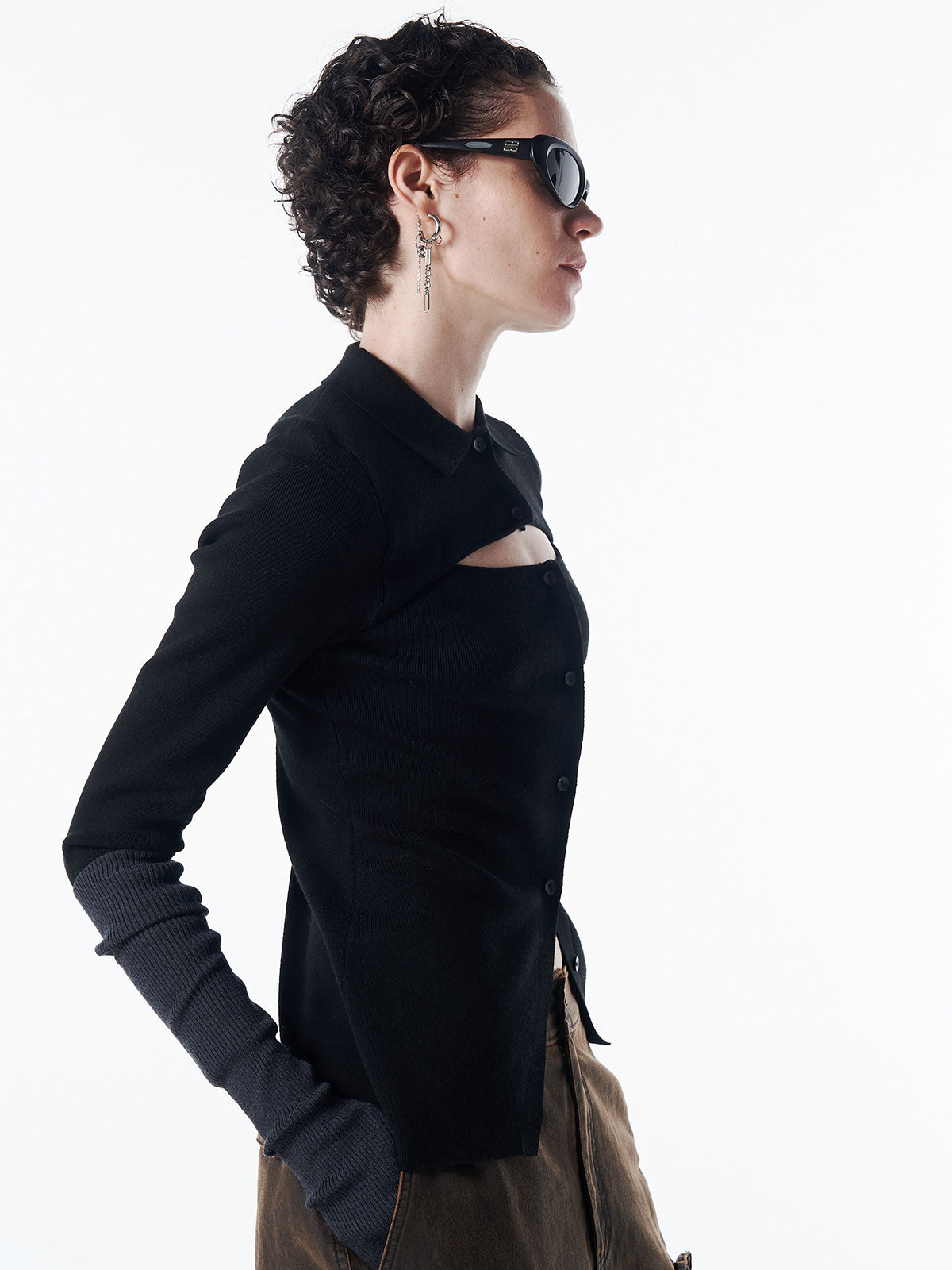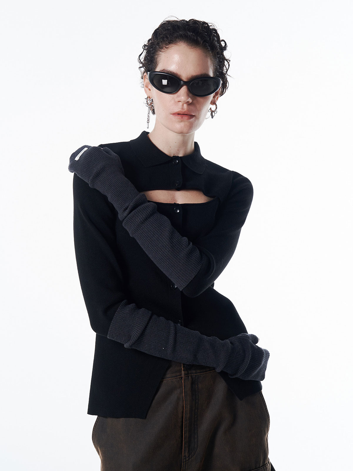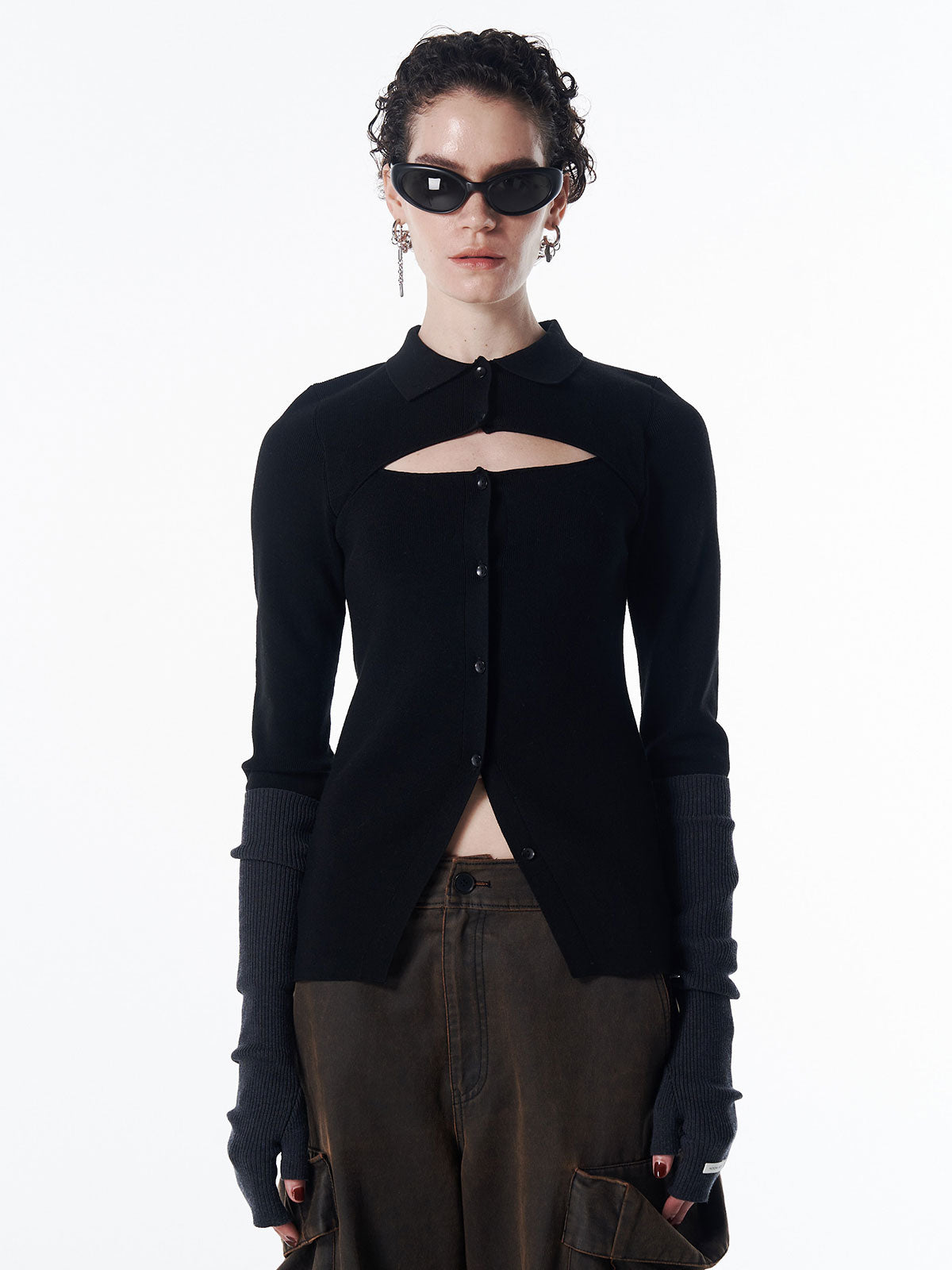 バスト部分に施したカッティングが目を引くニットはカーディガンとしても、トップスとしても着用いただけます。