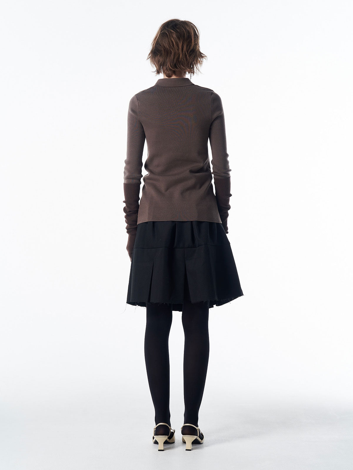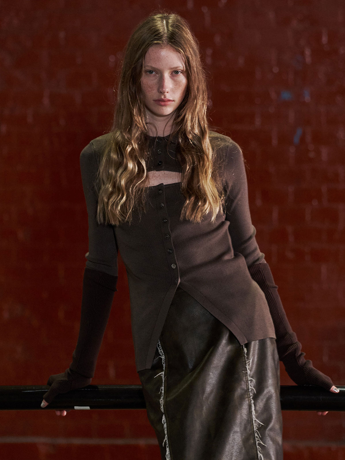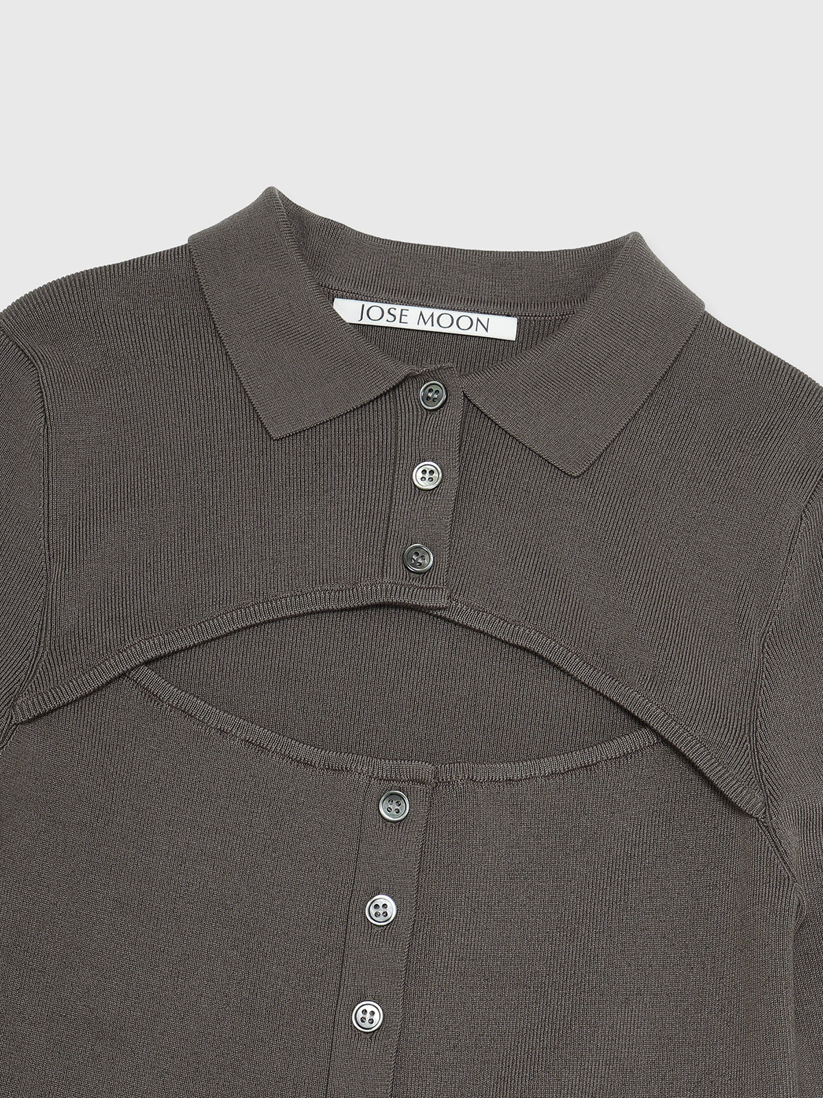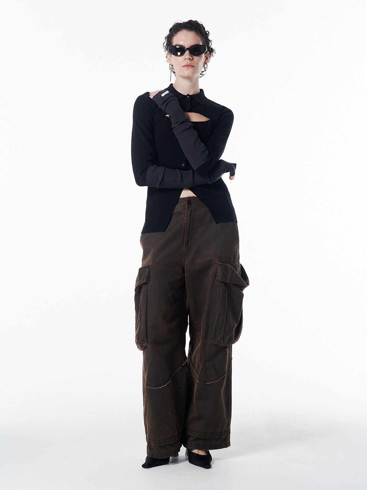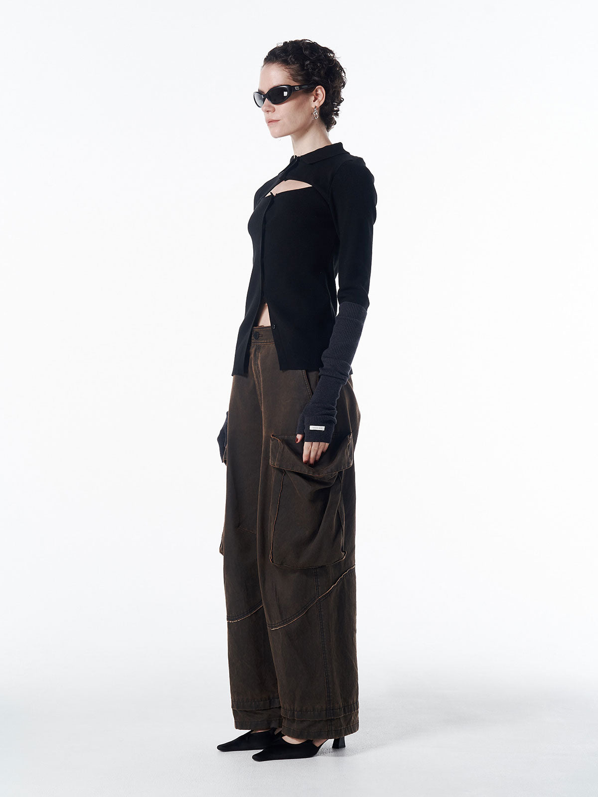 バスト部分に施したカッティングが目を引くニットはカーディガンとしても、トップスとしても着用いただけます。
