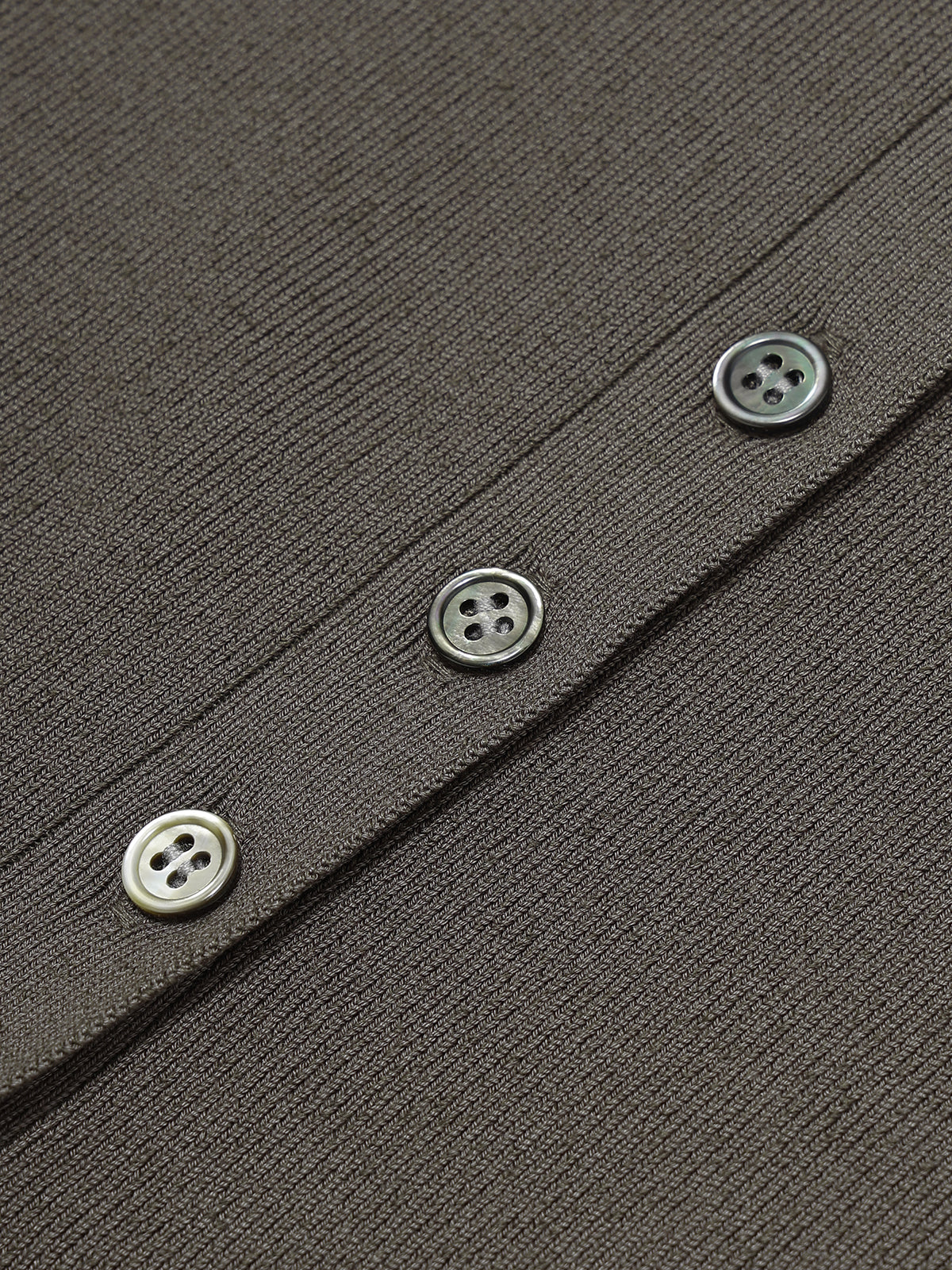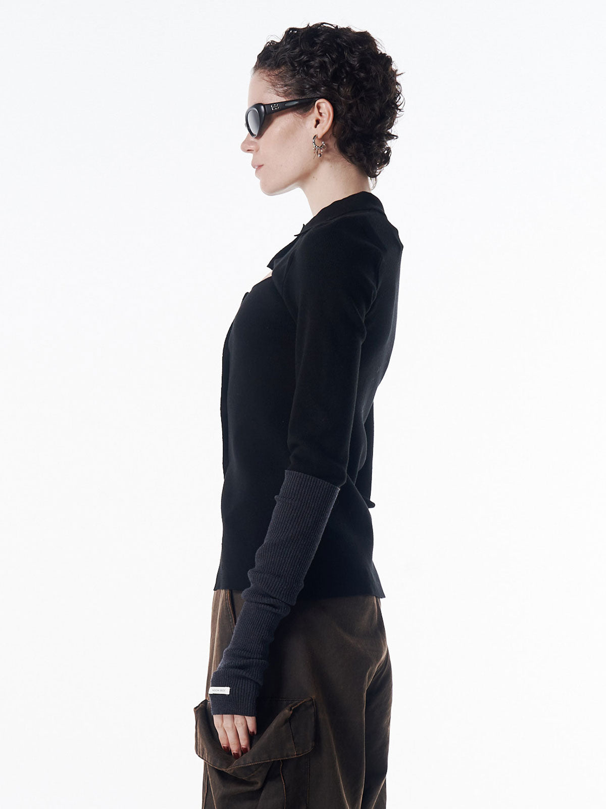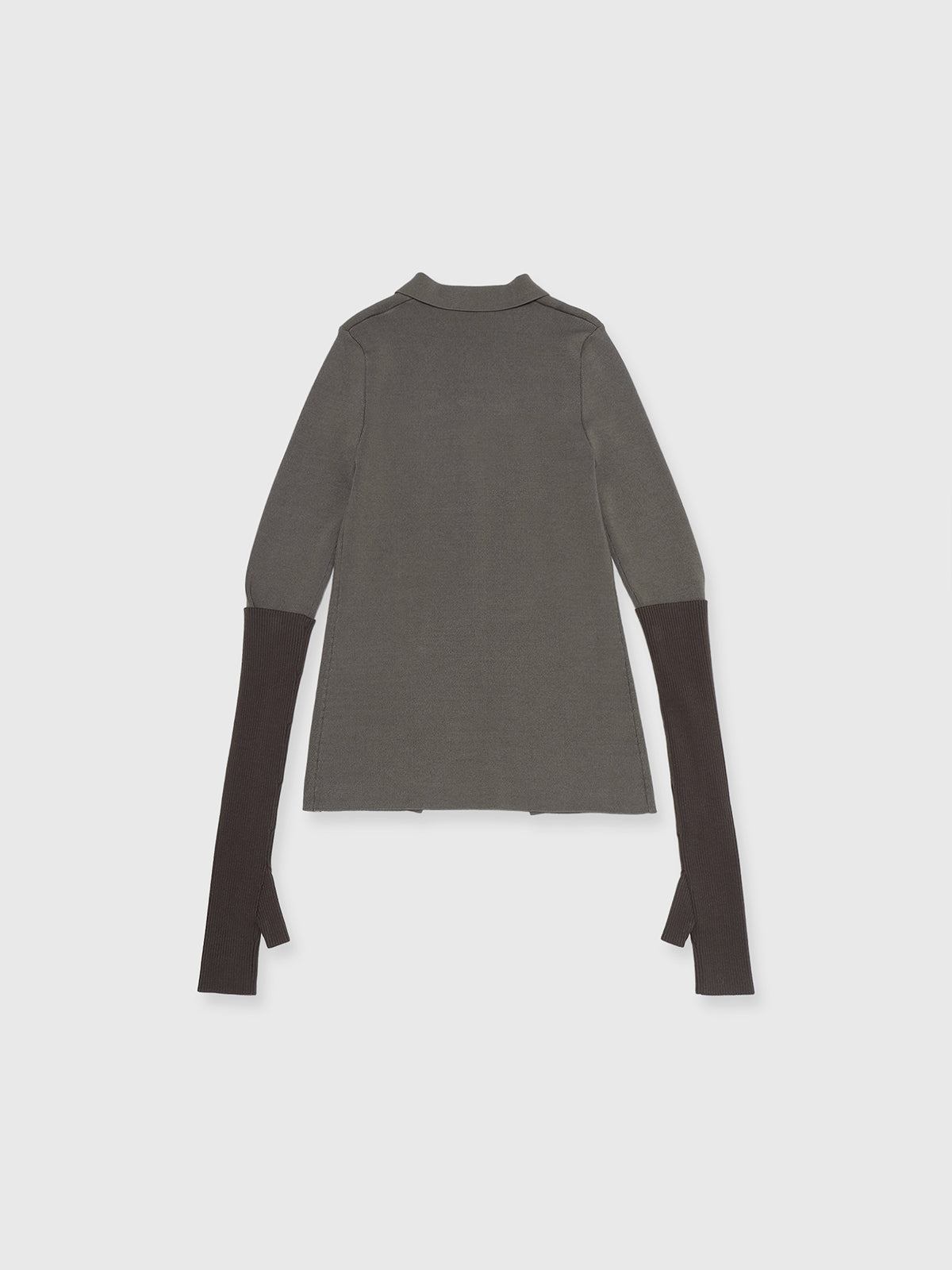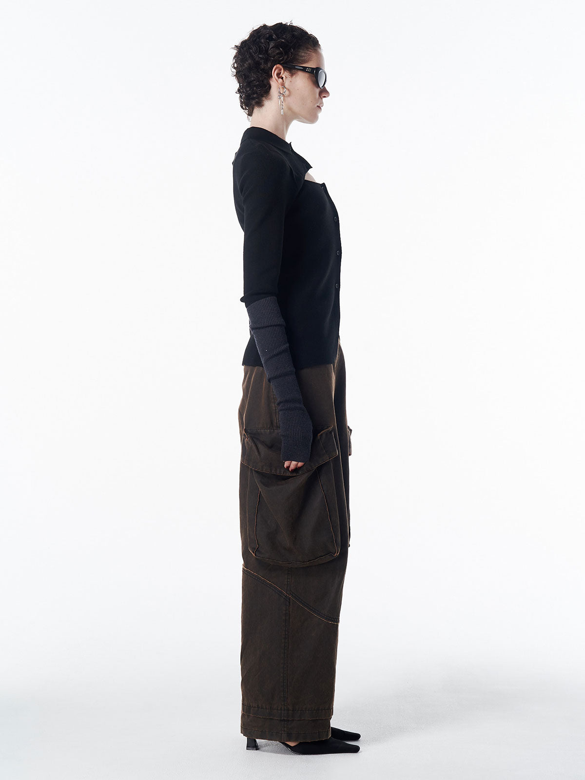 バスト部分に施したカッティングが目を引くニットはカーディガンとしても、トップスとしても着用いただけます。