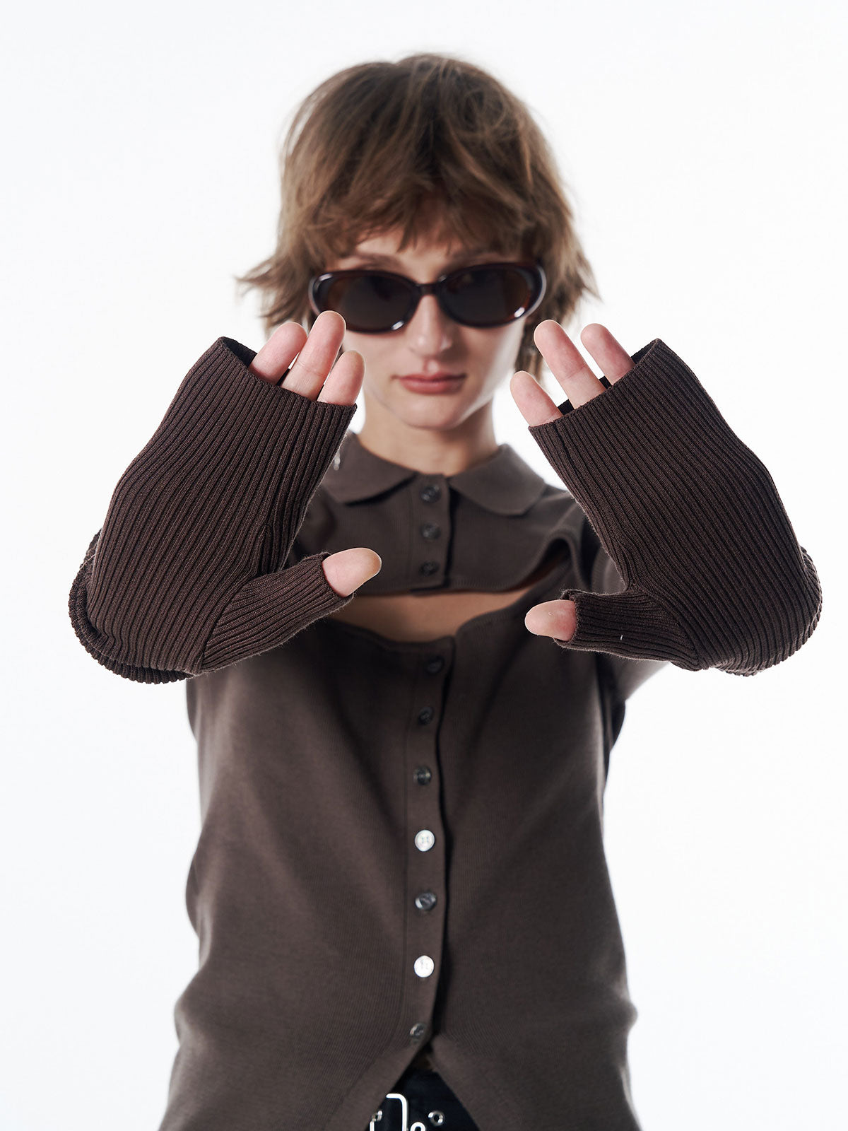 同系で編み上げたアームウォーマーが着こなしに新しい雰囲気を加えてくれます。