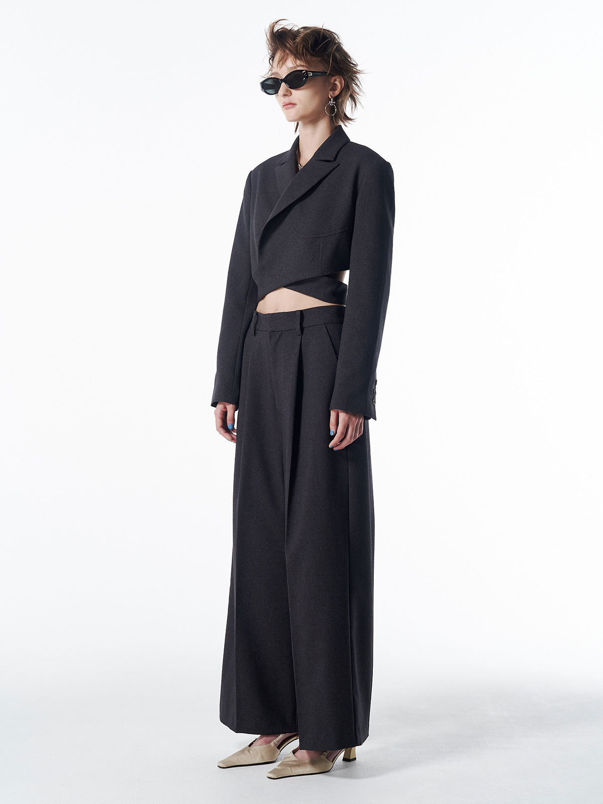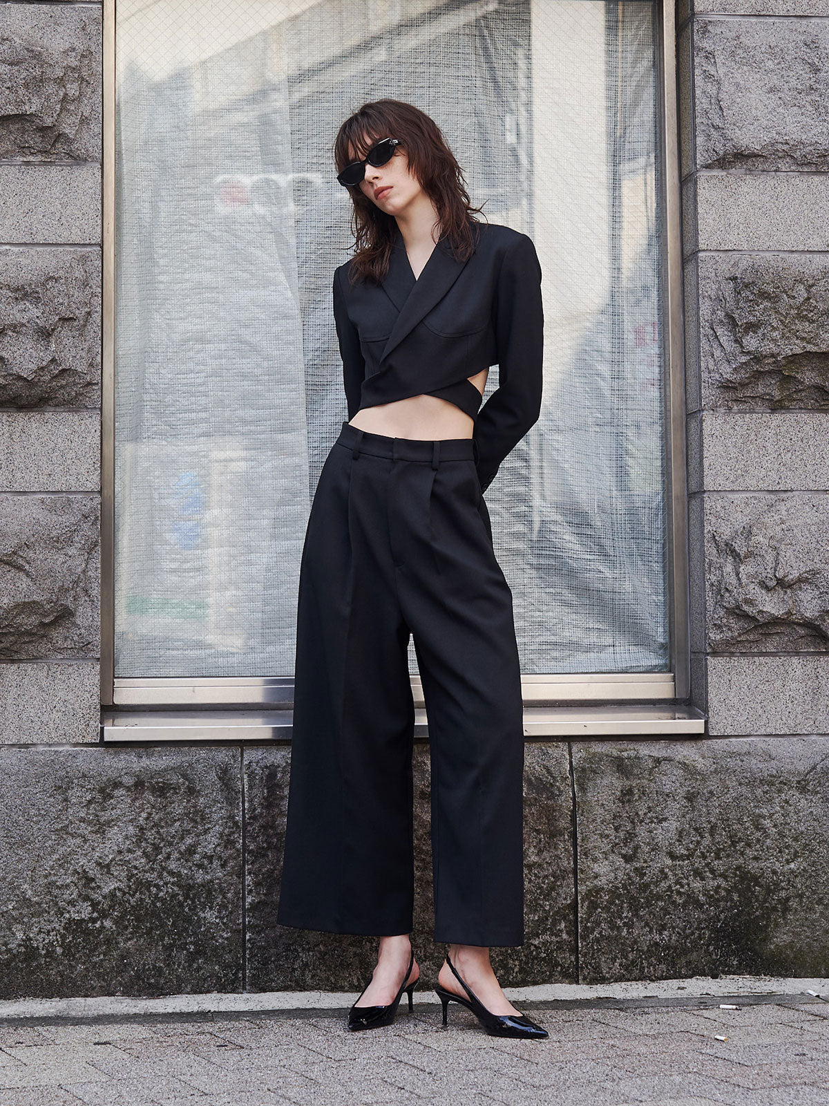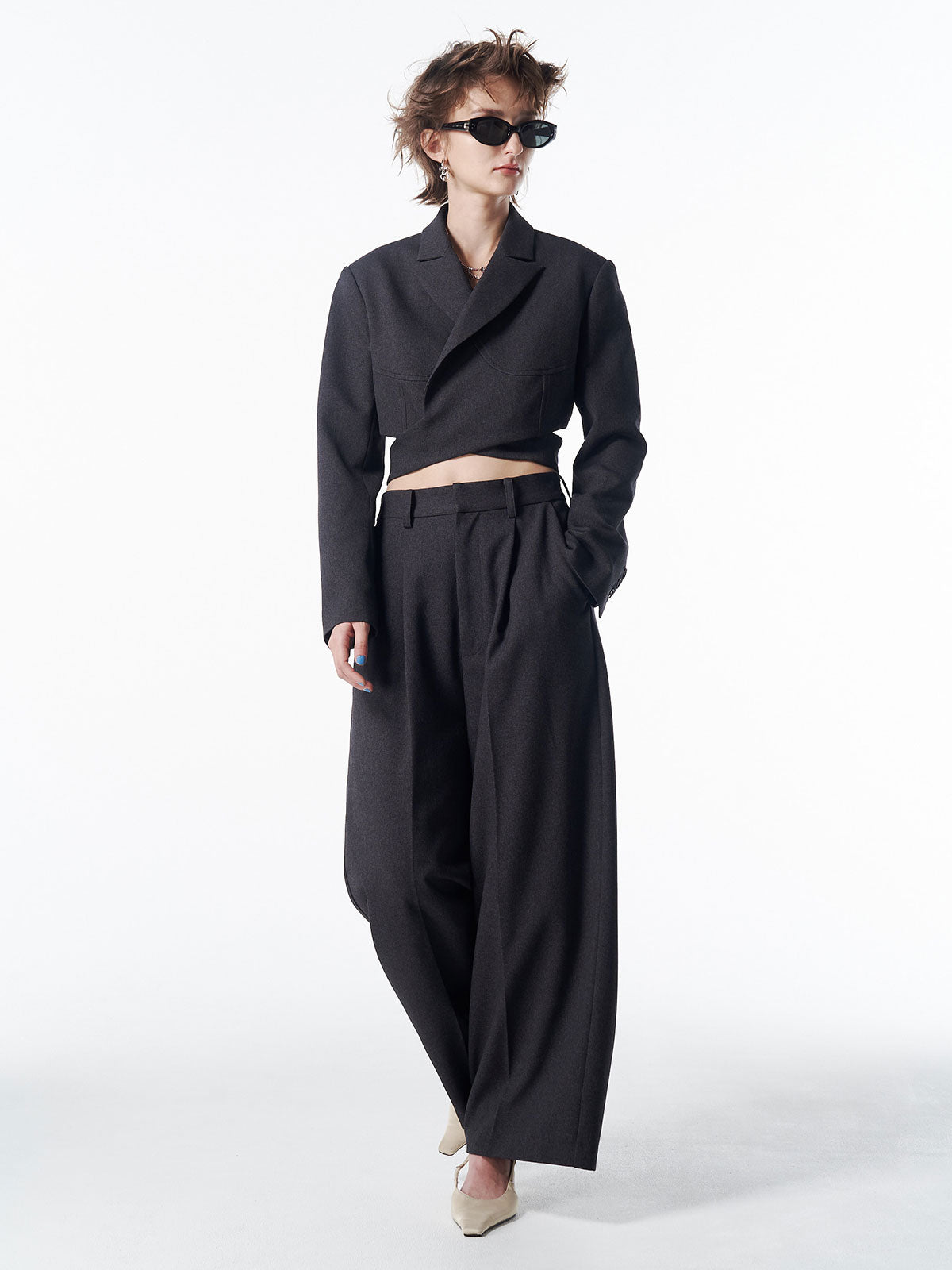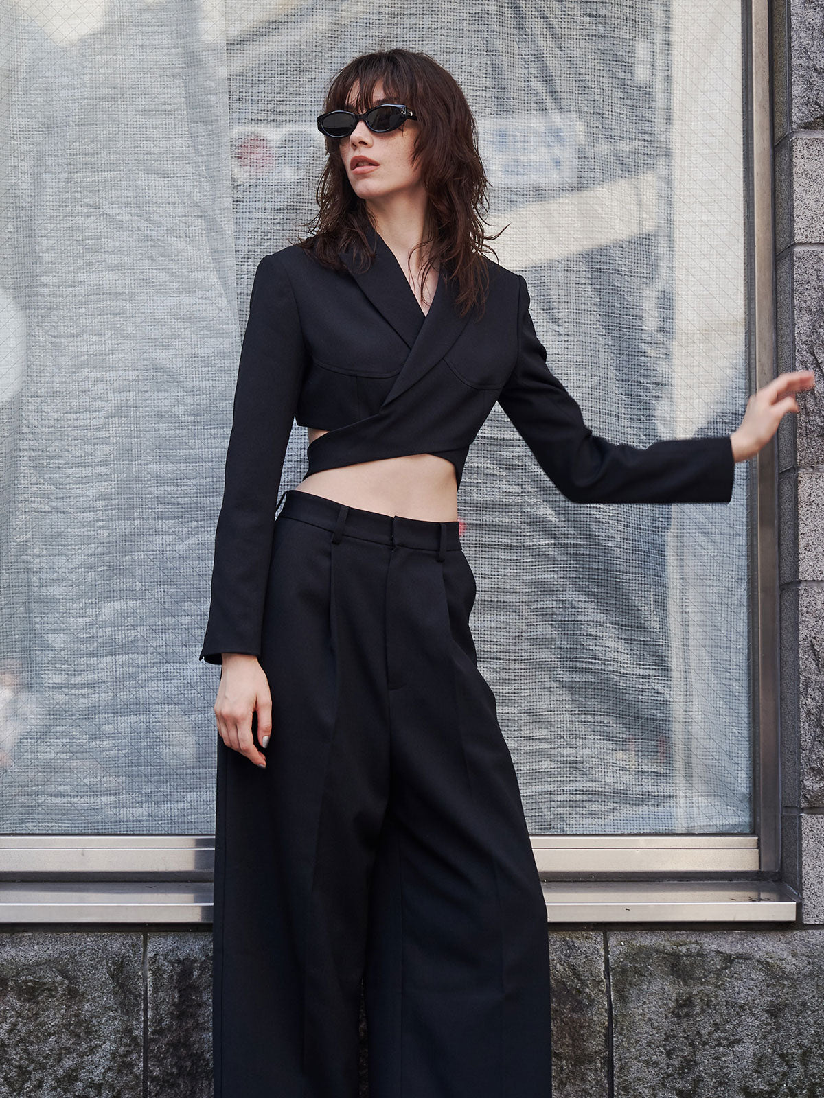 エッジの効いたテキスタイルですが深めの股上と脚のラインを拾わないワイドシルエットでリラックスした着心地が叶います。