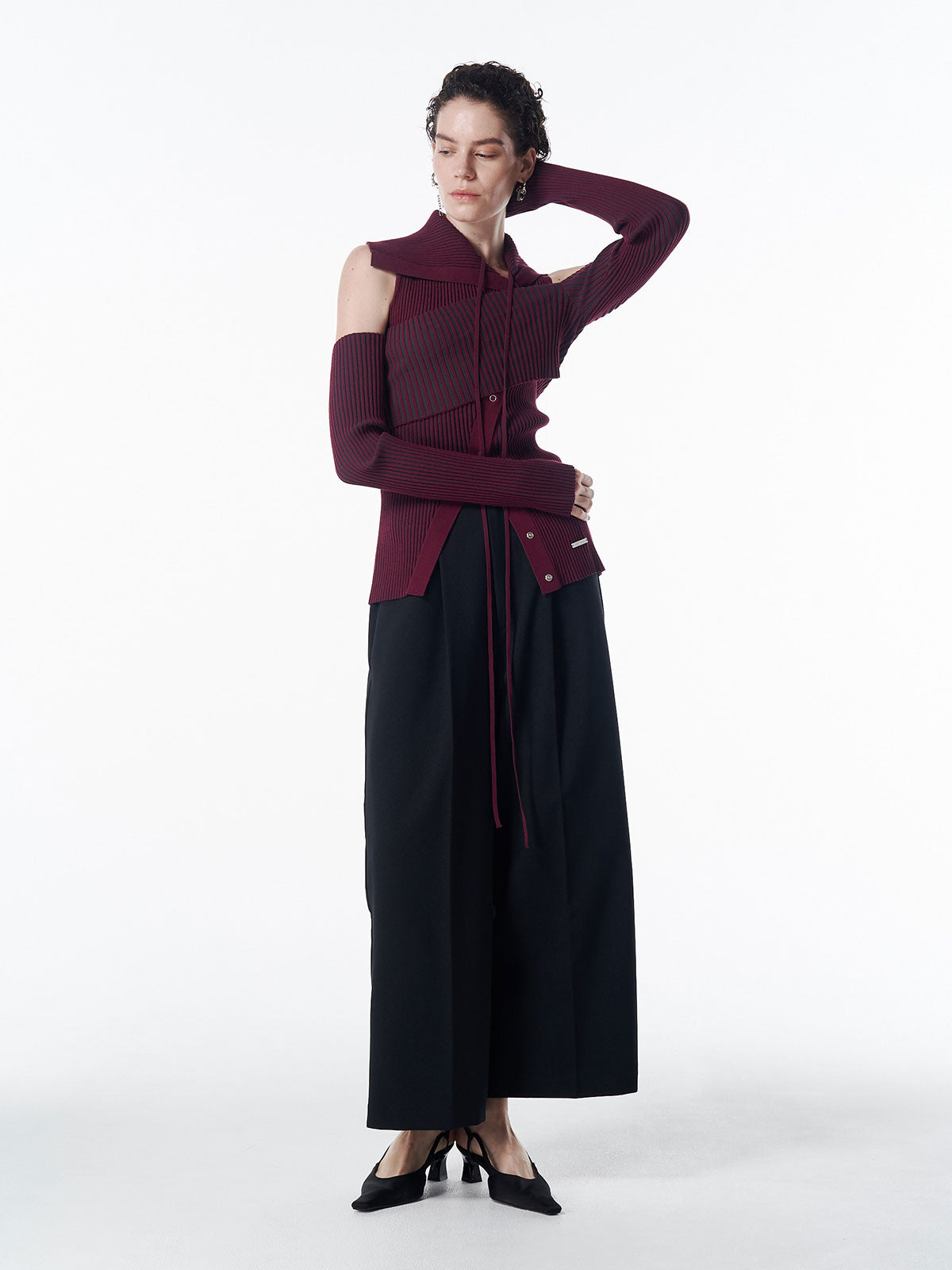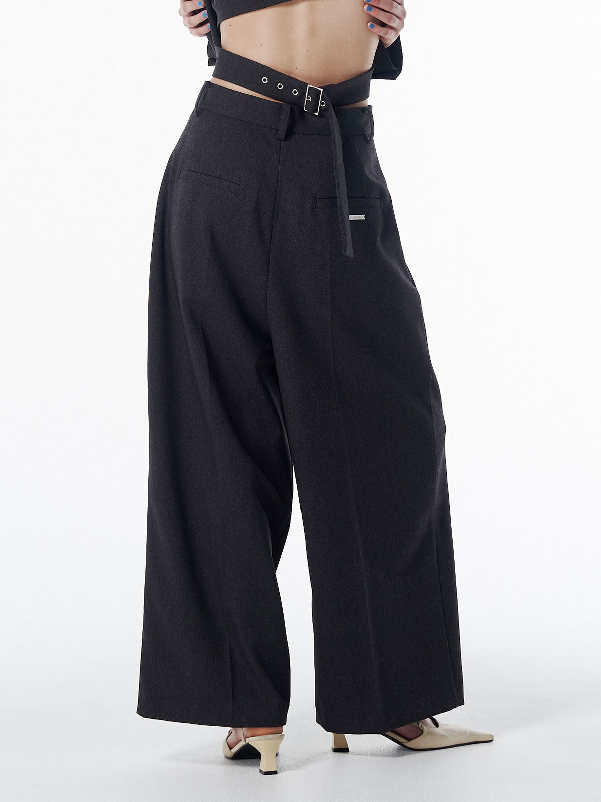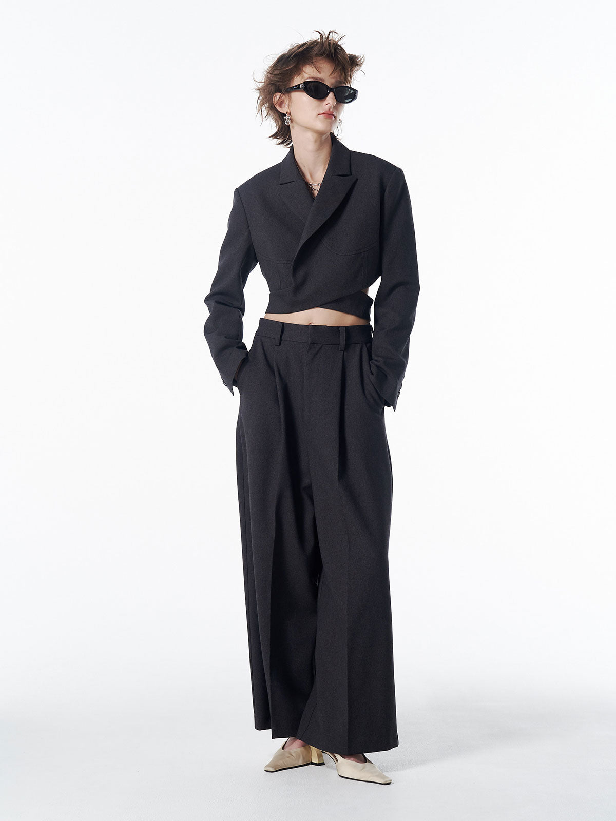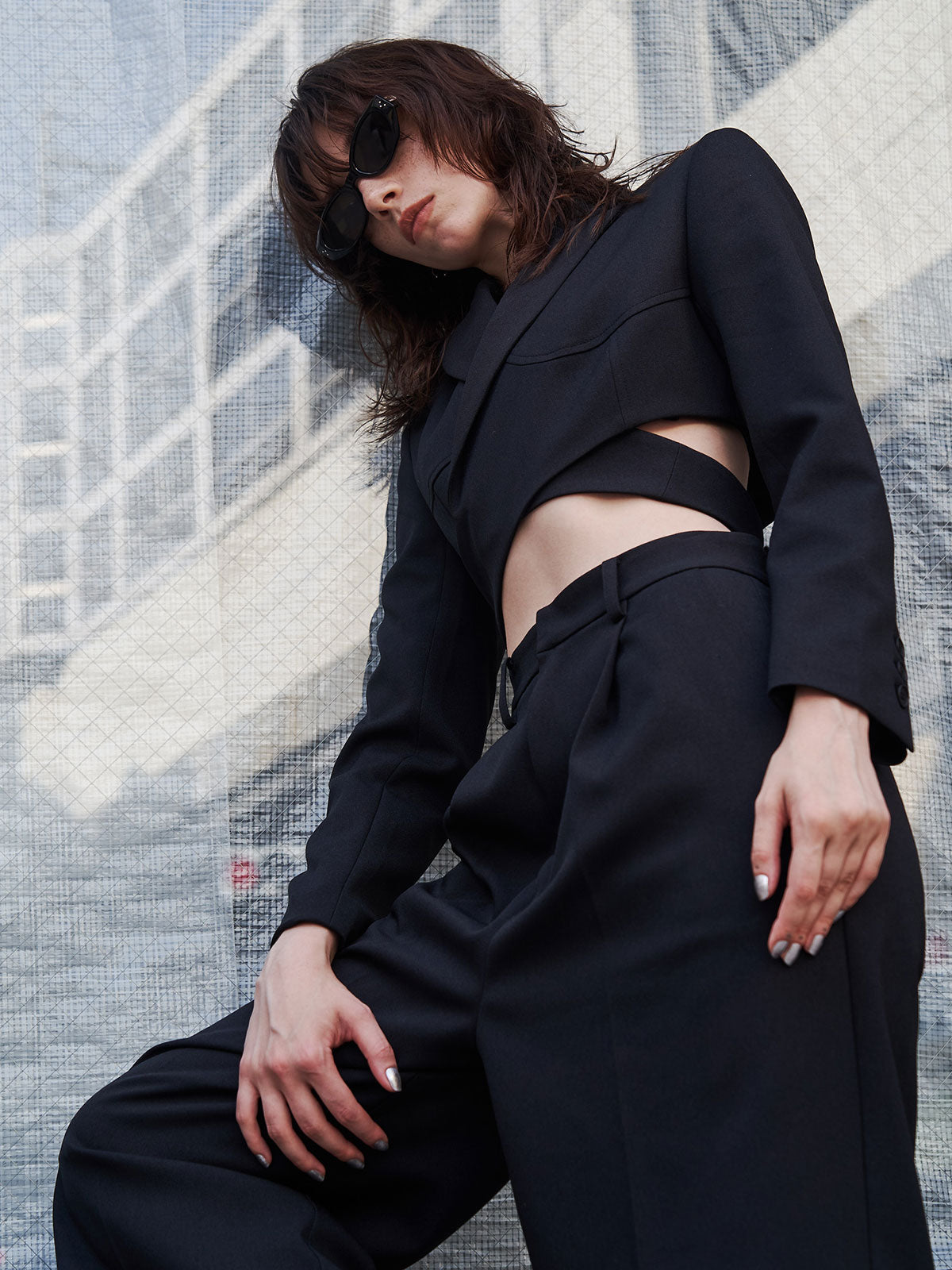 エッジの効いたテキスタイルですが深めの股上と脚のラインを拾わないワイドシルエットでリラックスした着心地が叶います。