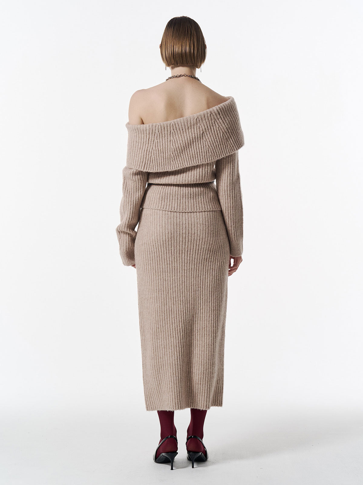 ボディラインを包み込むようなリラックスフィットでありながら縦のラインを美しく強調するリブ編みによって、シルエットはすっきりとシャープに演出。