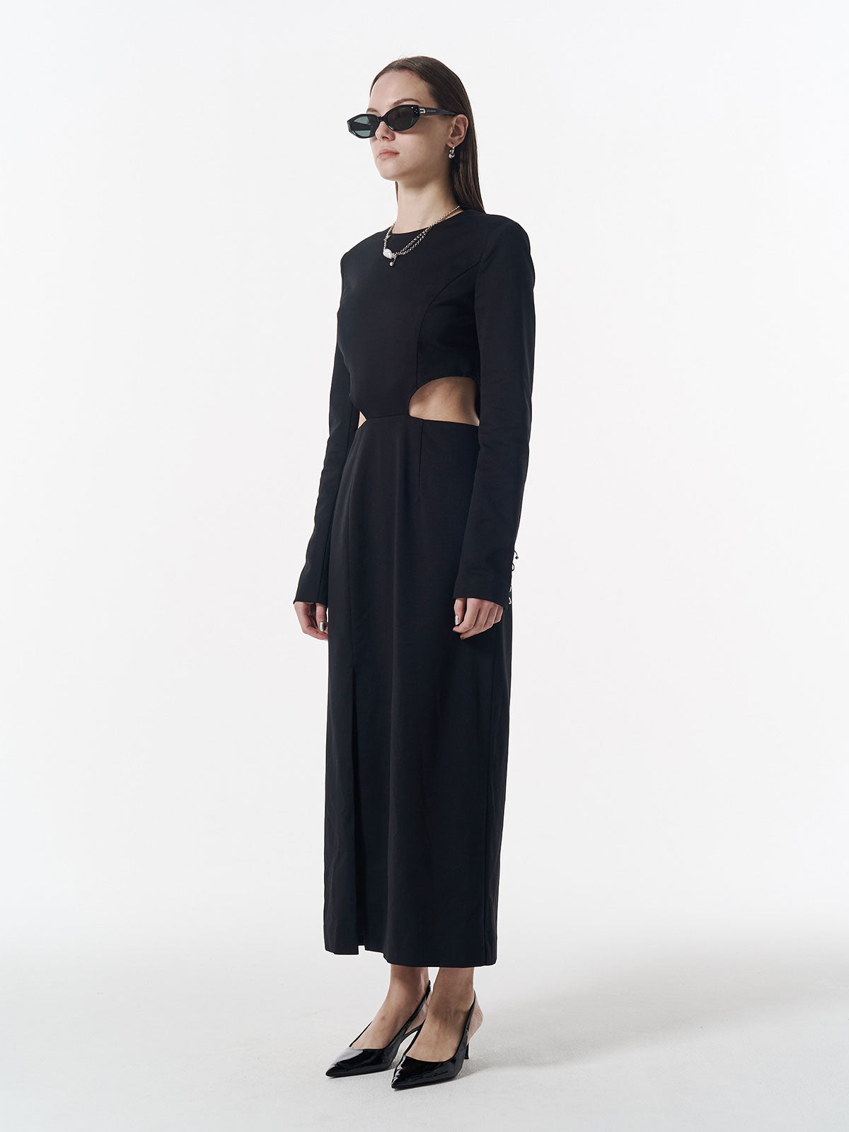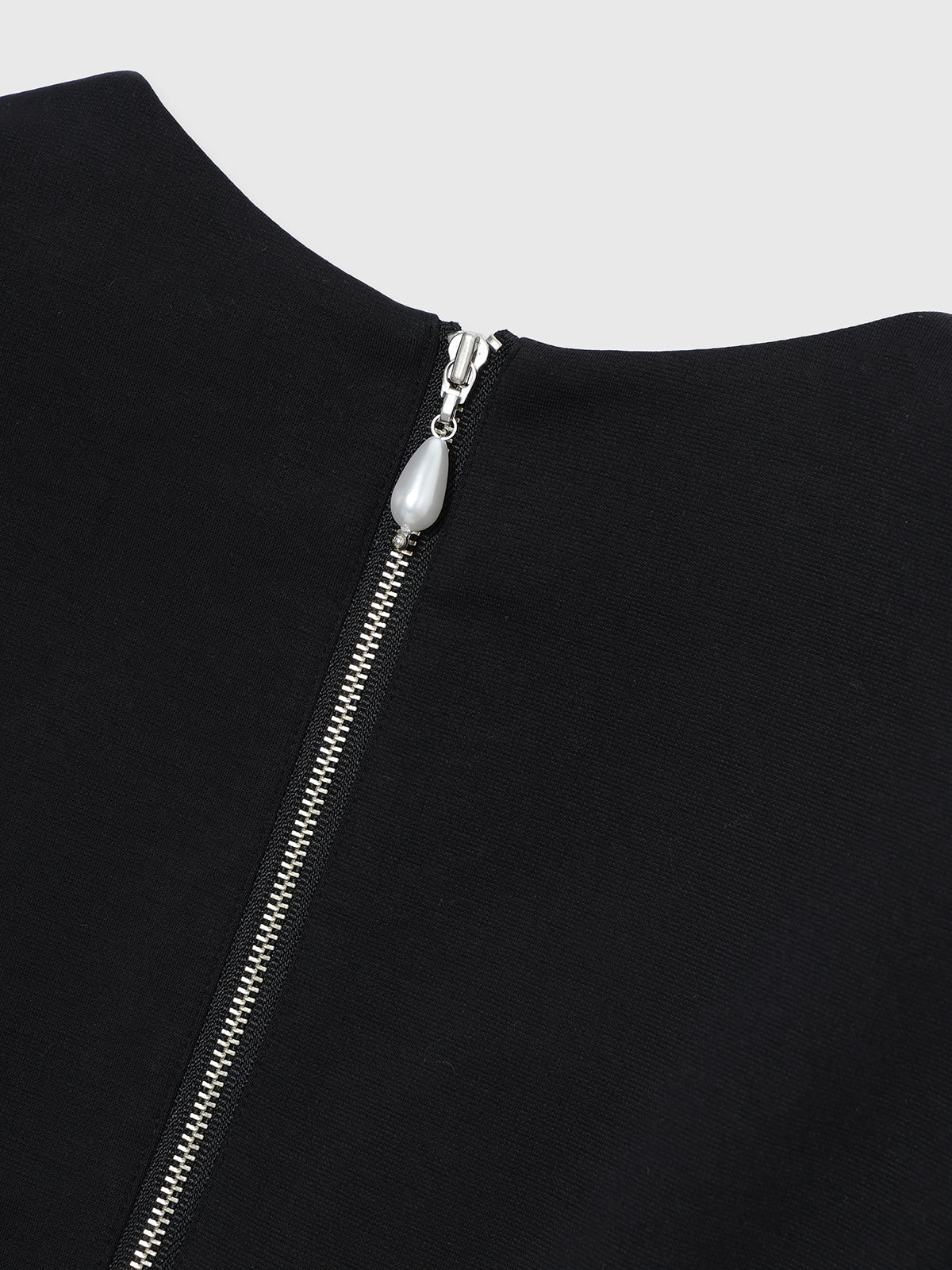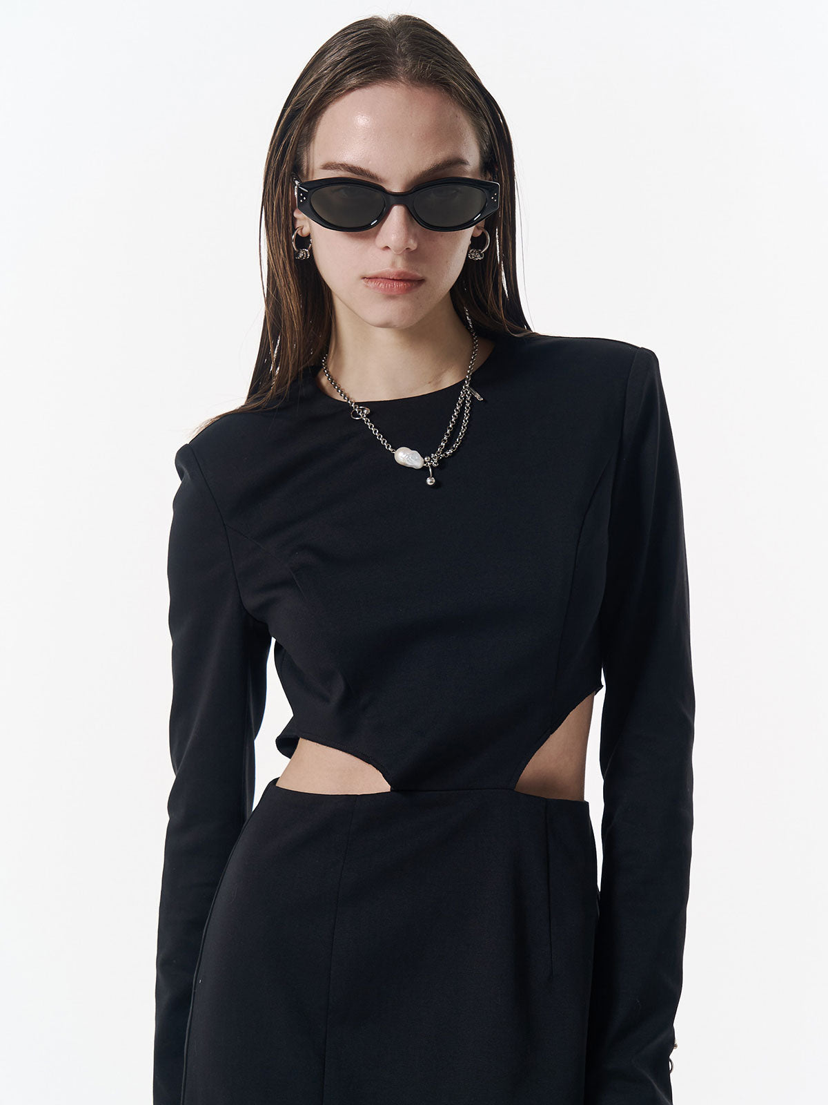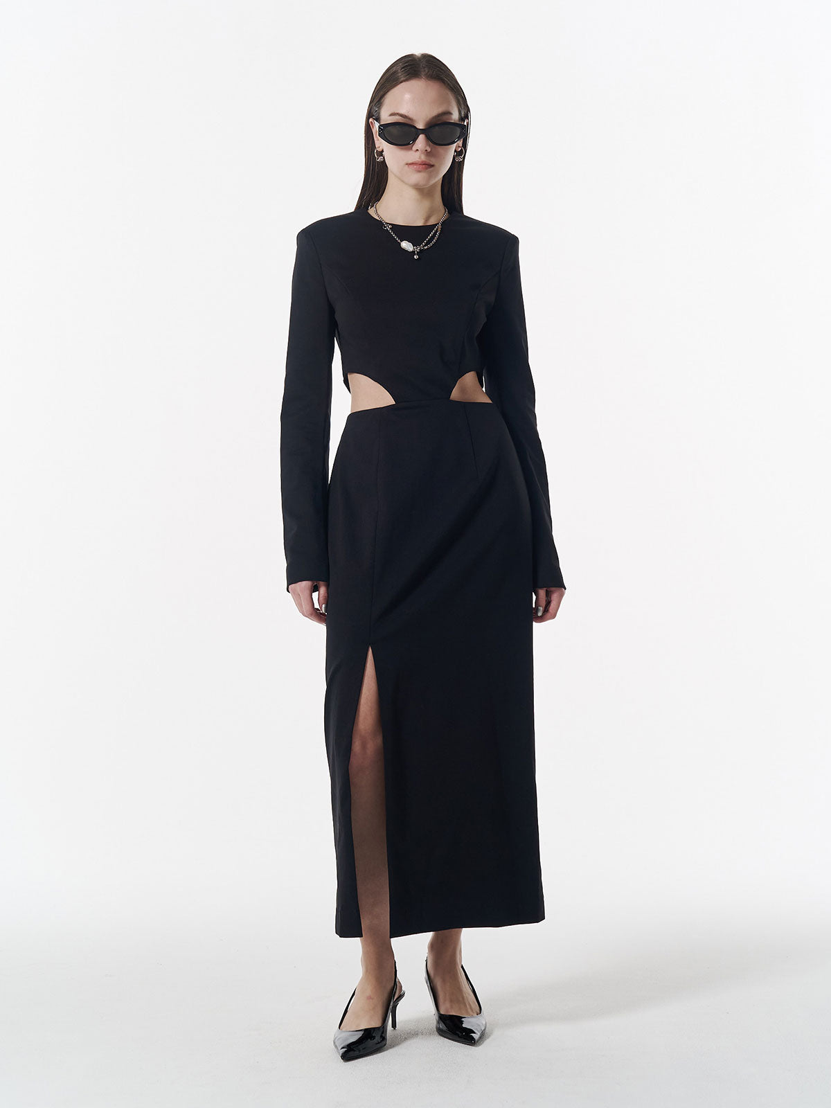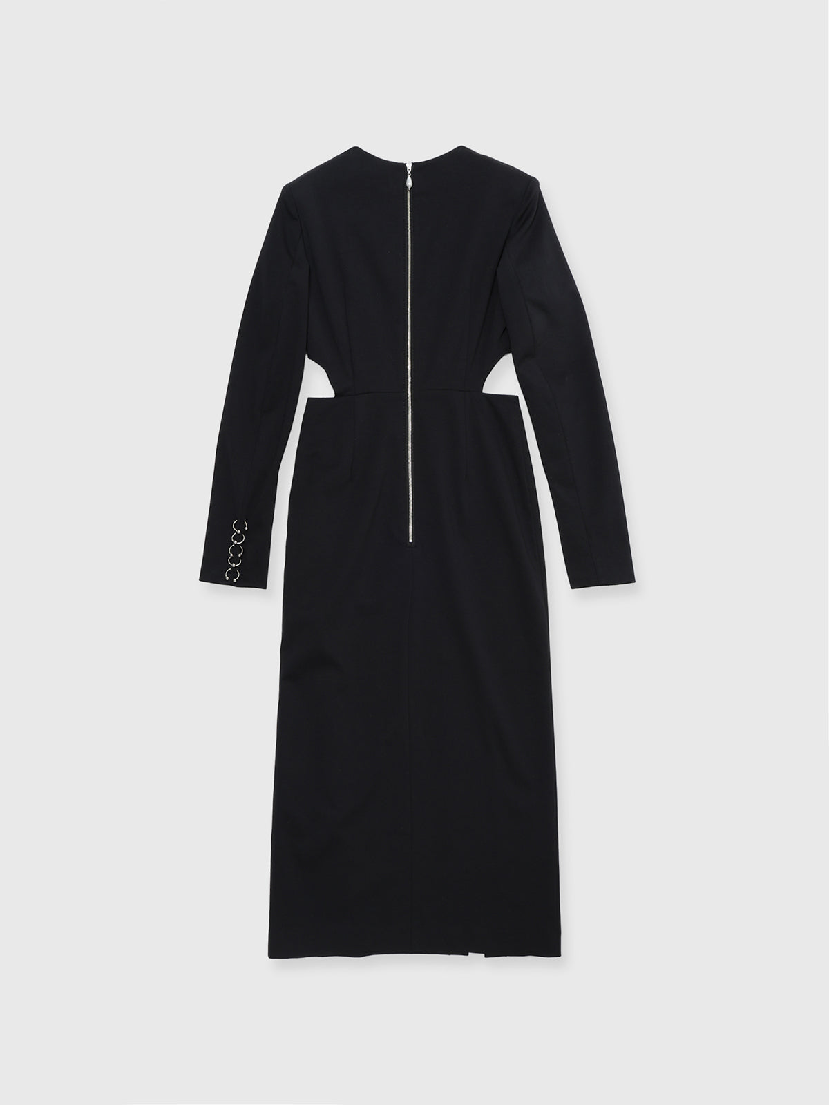 サイドに施したカッティングが程よく肌をのぞかせ、ハイネックの端正さとのコントラストでモードレディな印象に。