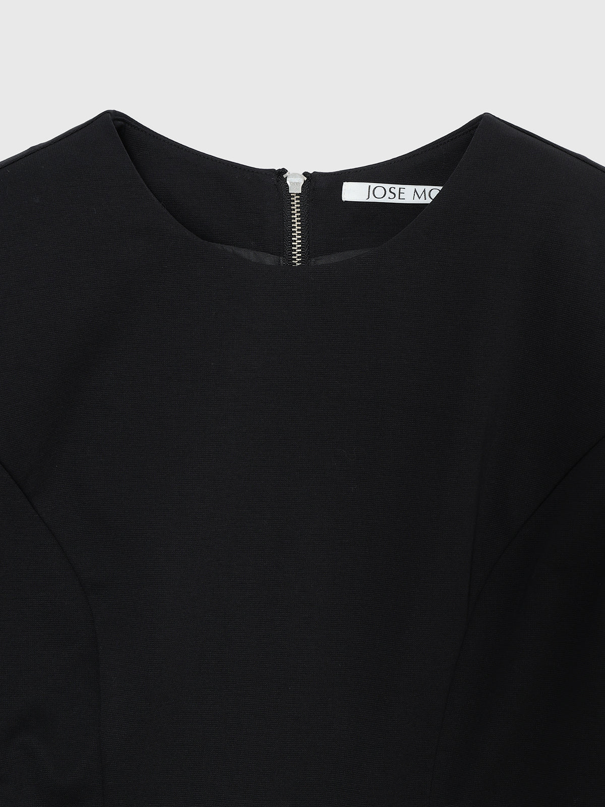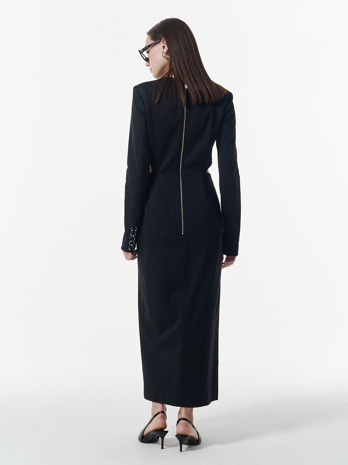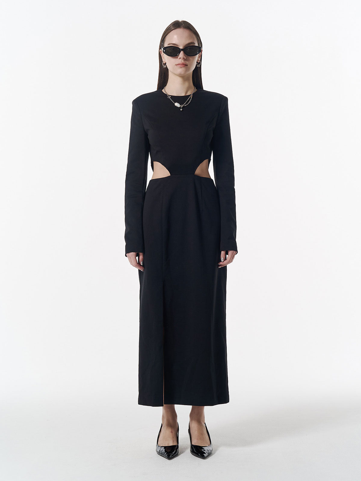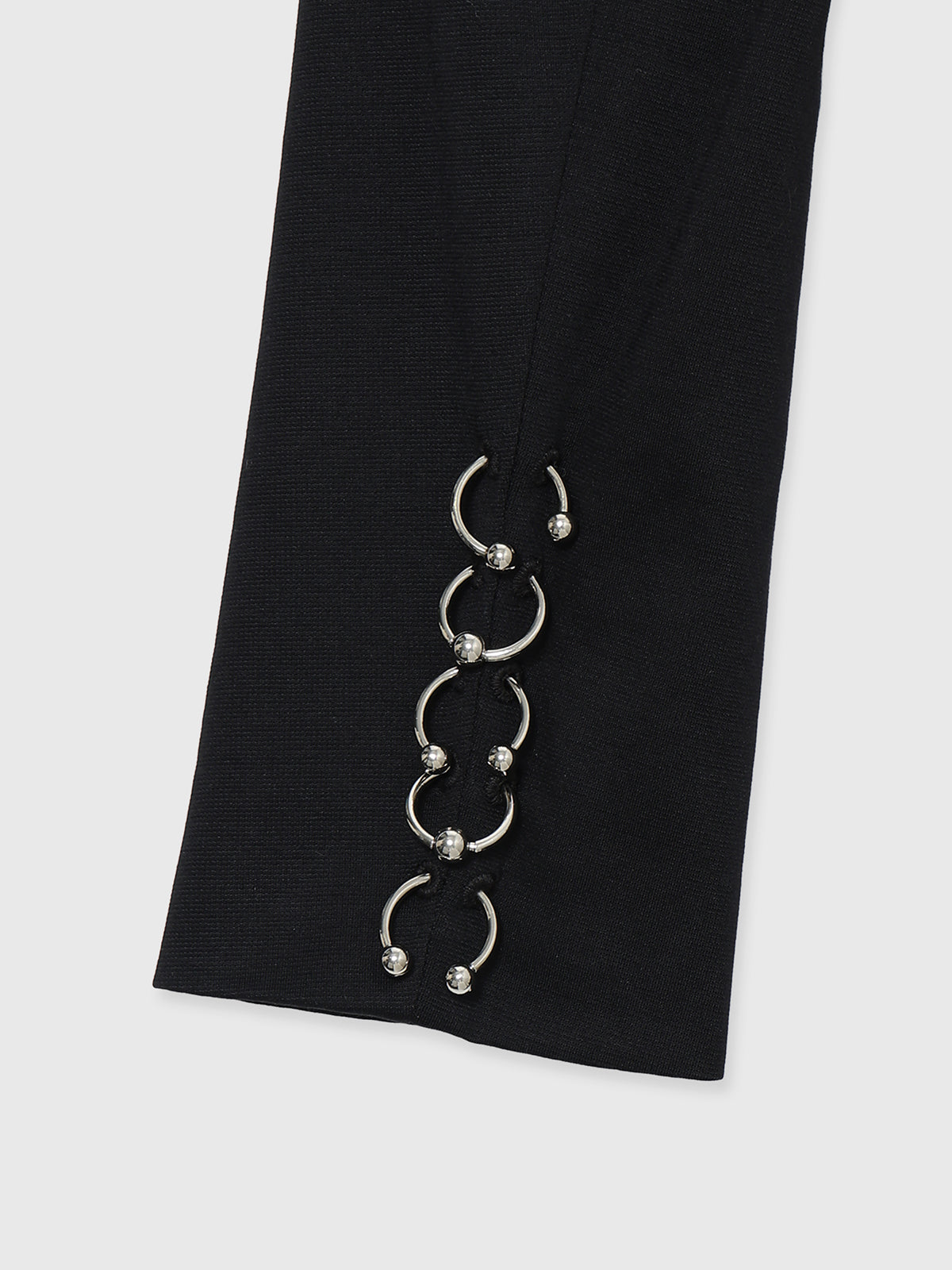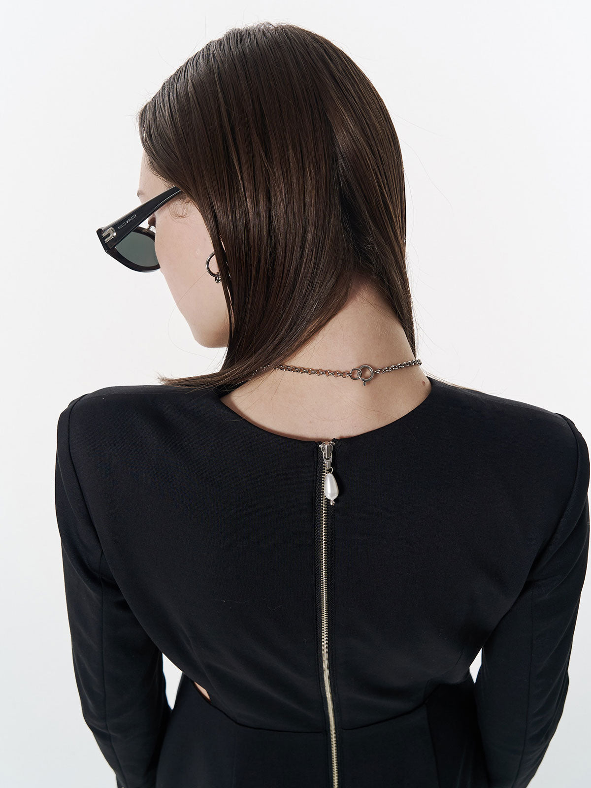 サイドに施したカッティングが程よく肌をのぞかせ、ハイネックの端正さとのコントラストでモードレディな印象に。