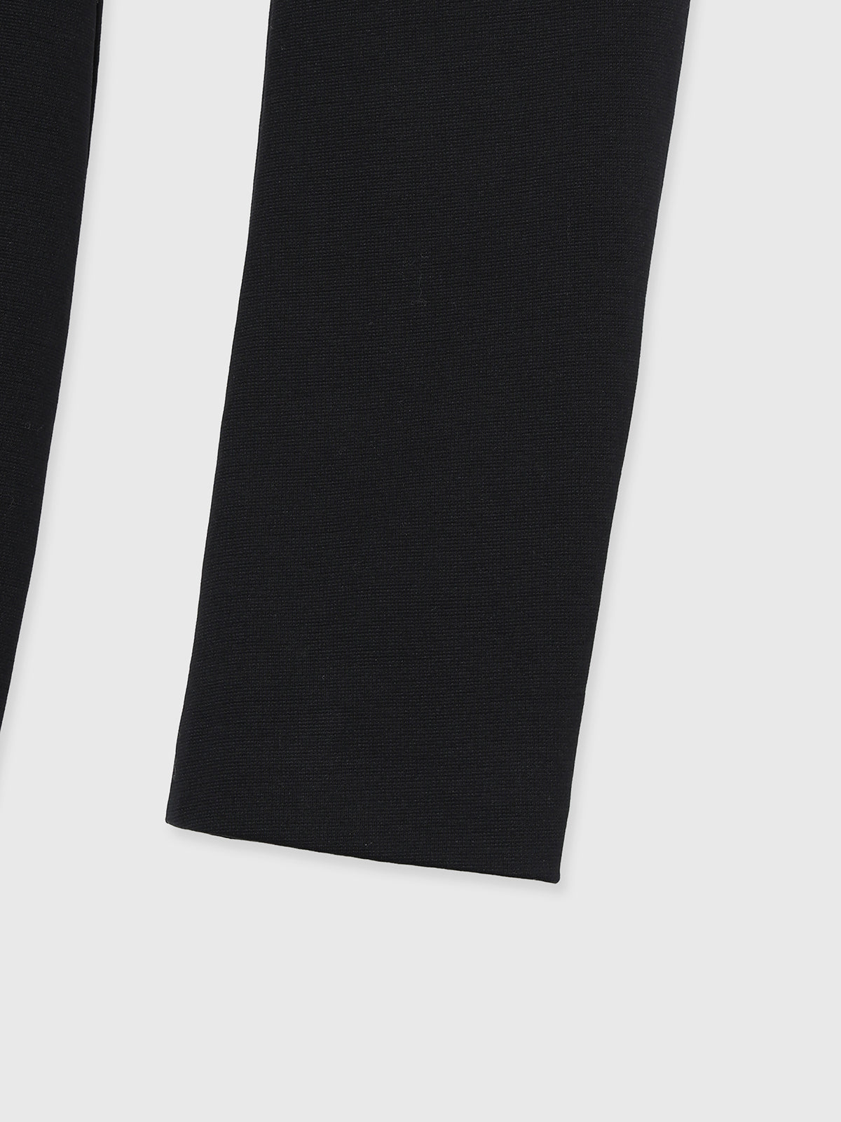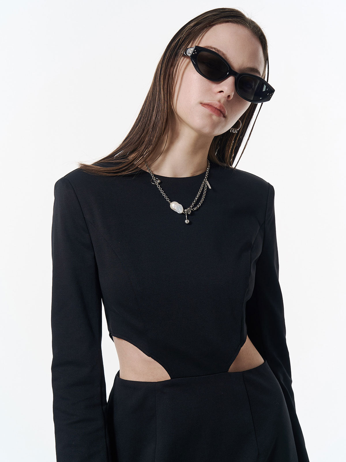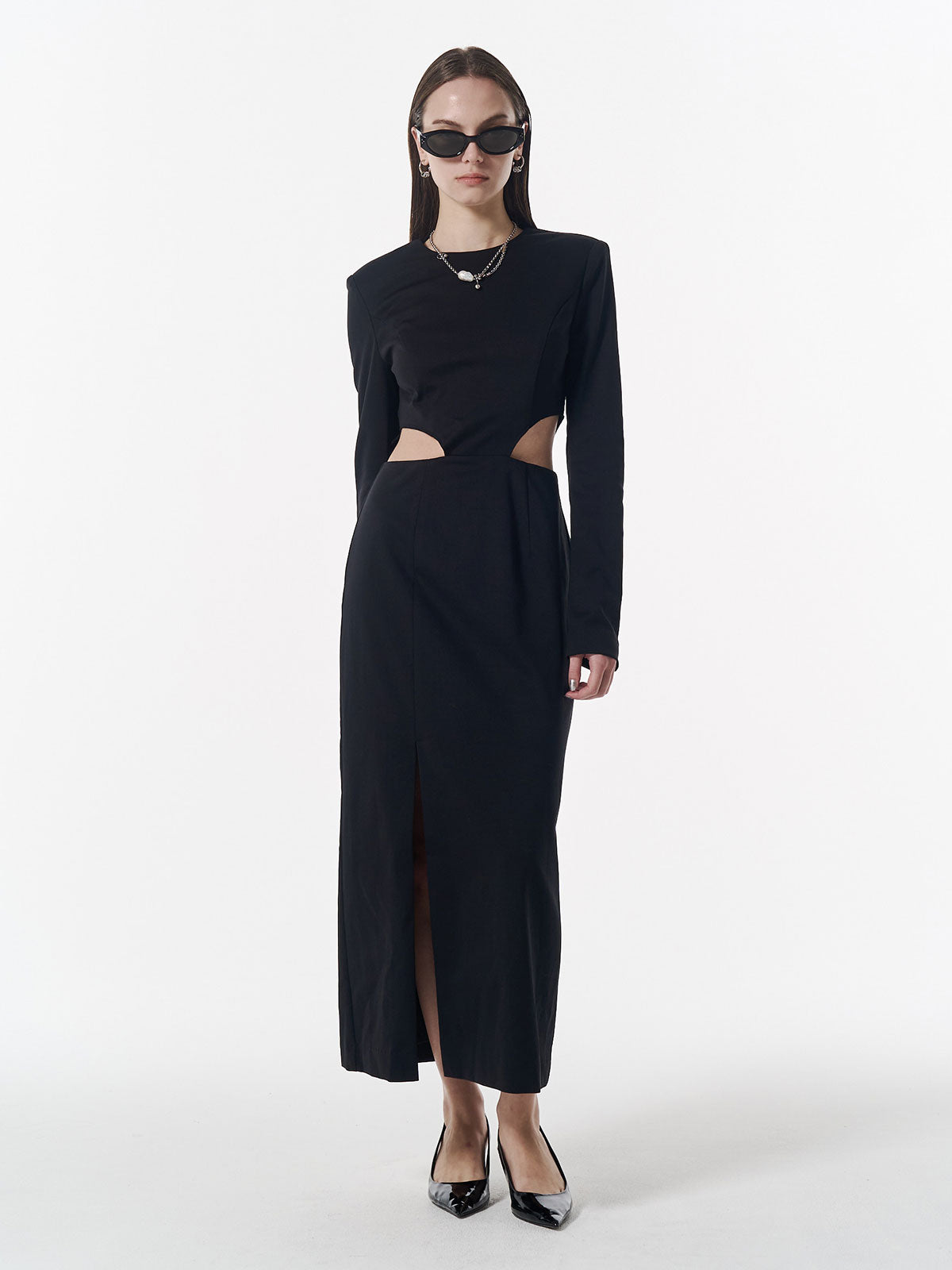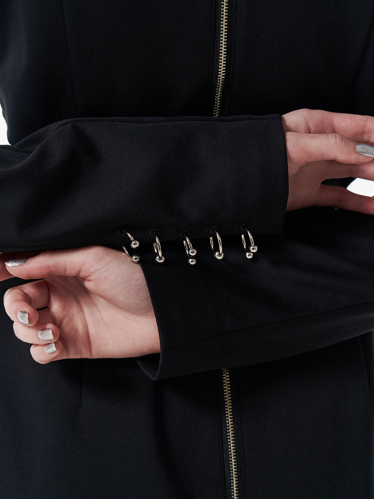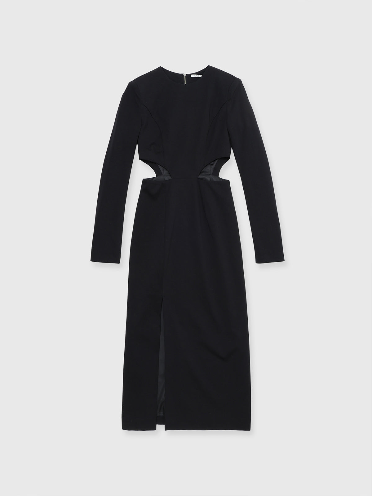 サイドに施したカッティングが程よく肌をのぞかせ、ハイネックの端正さとのコントラストでモードレディな印象に。