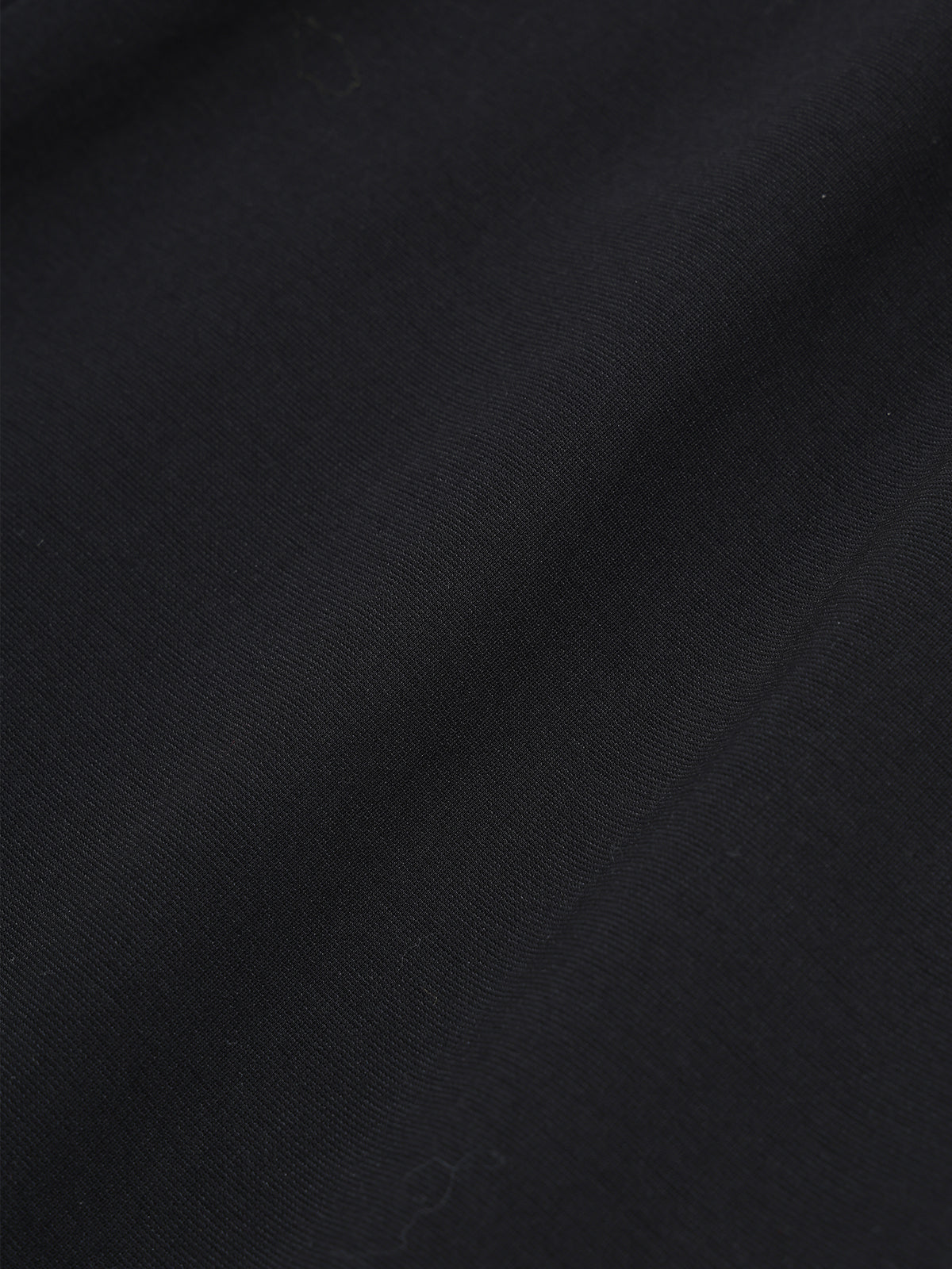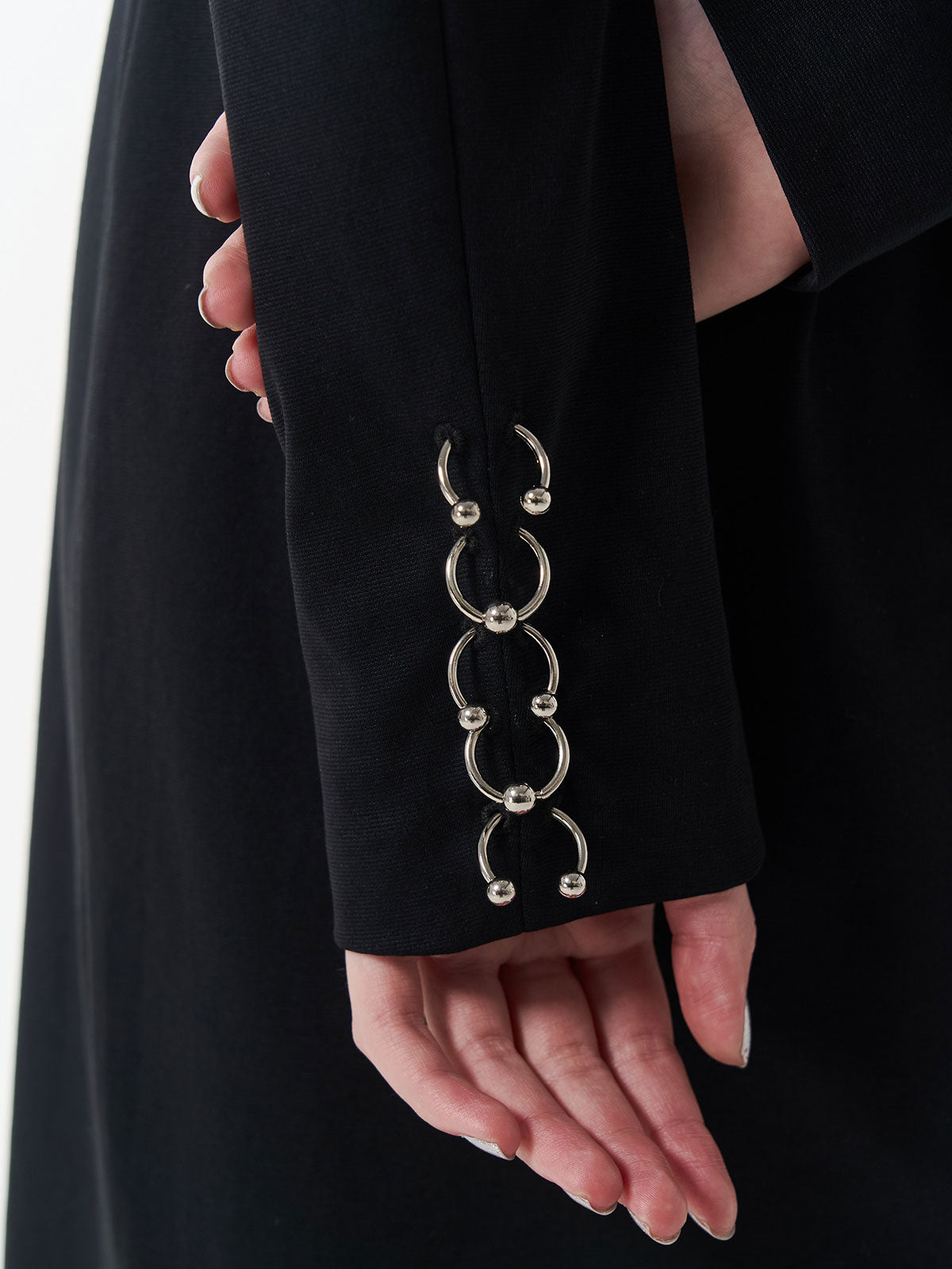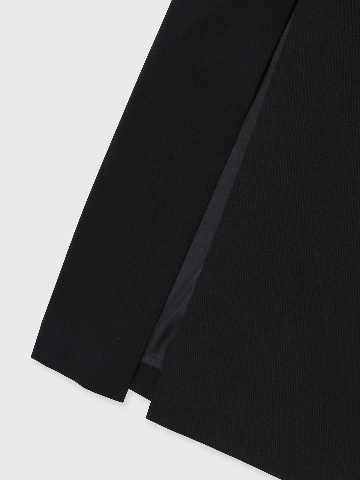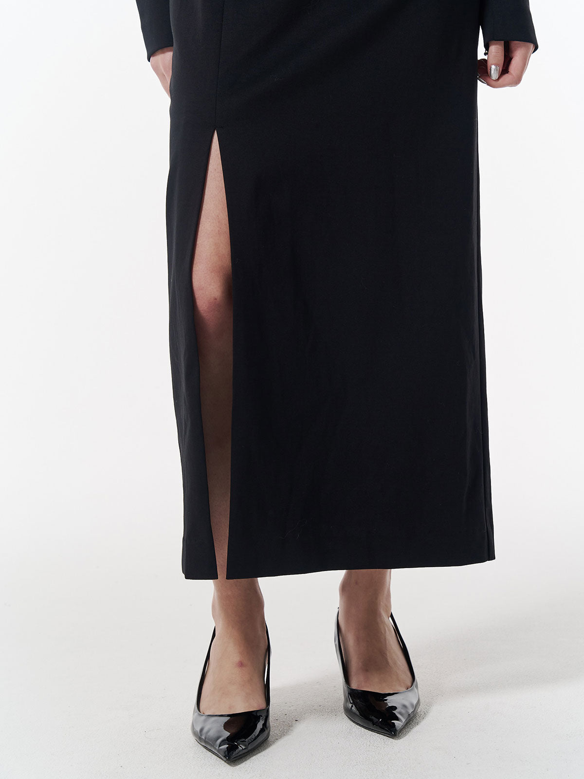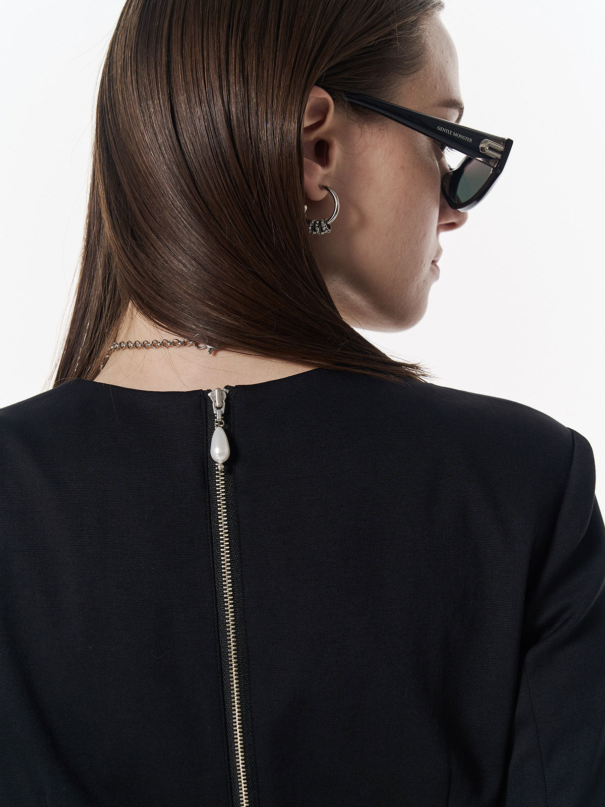 サイドに施したカッティングが程よく肌をのぞかせ、ハイネックの端正さとのコントラストでモードレディな印象に。