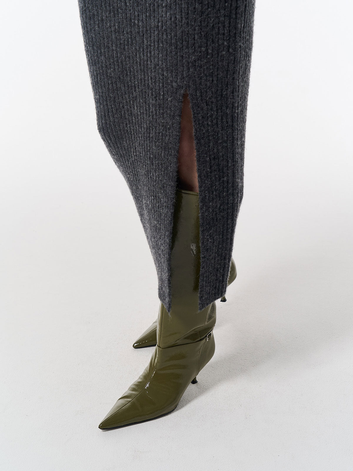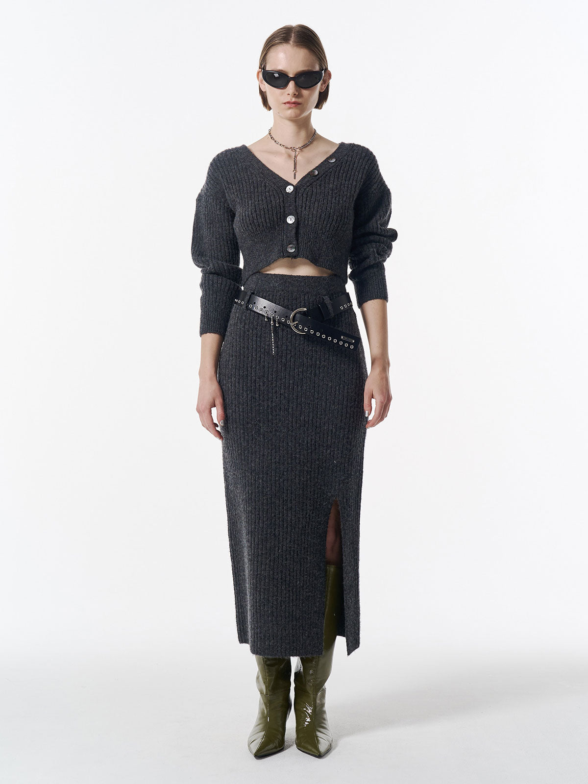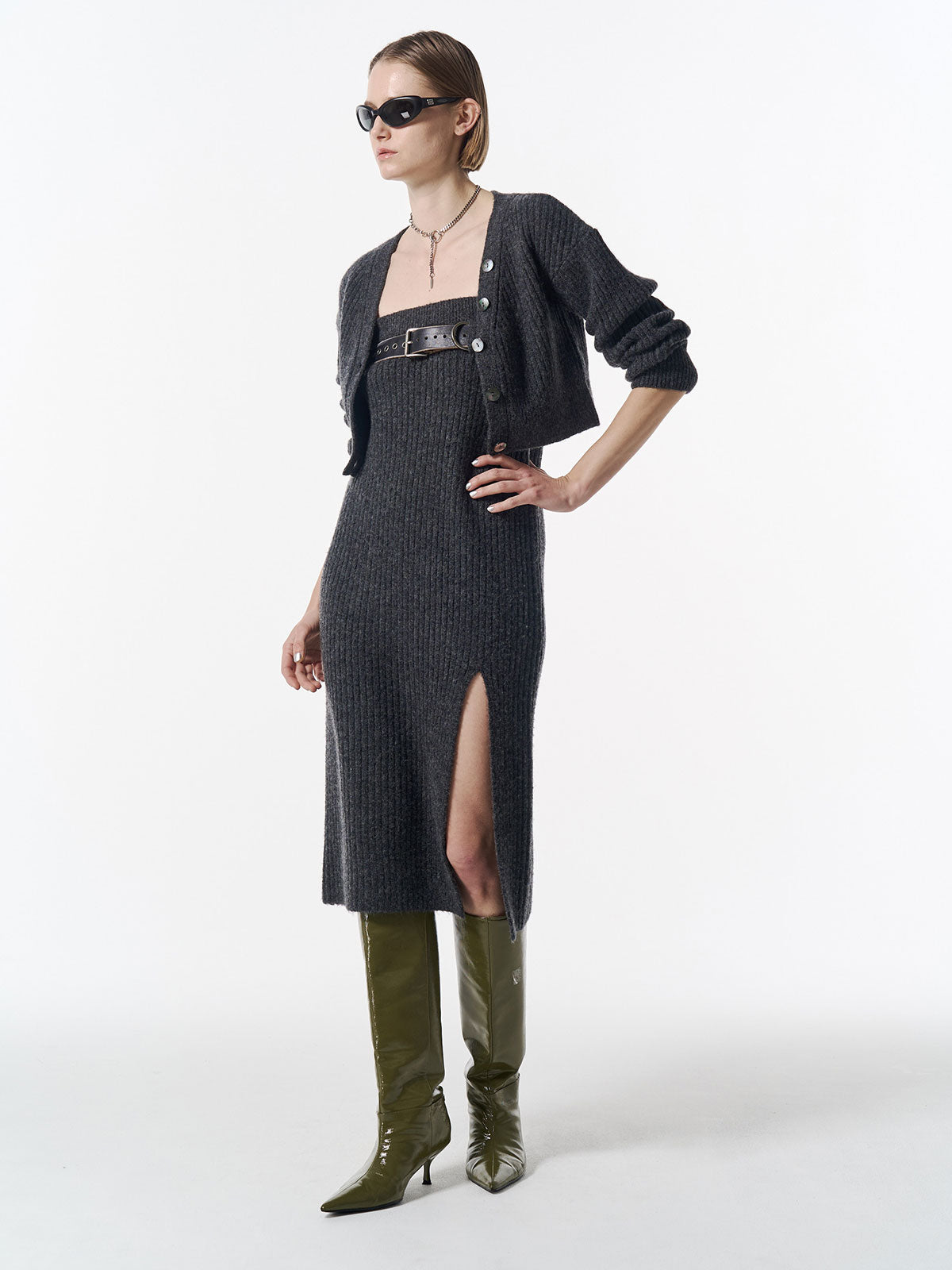 ワンピースは深めのスリットと胸周りのゴム仕様で実用性がありながら、リブ編みが生み出すタテラインでスタイルアップに導きます。