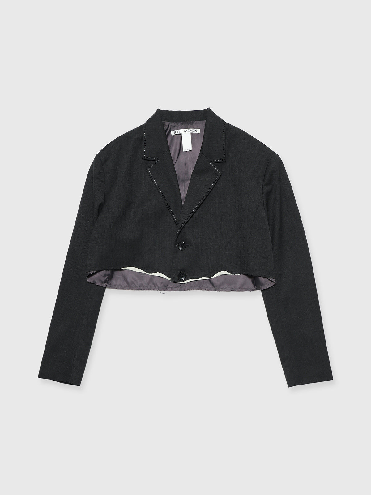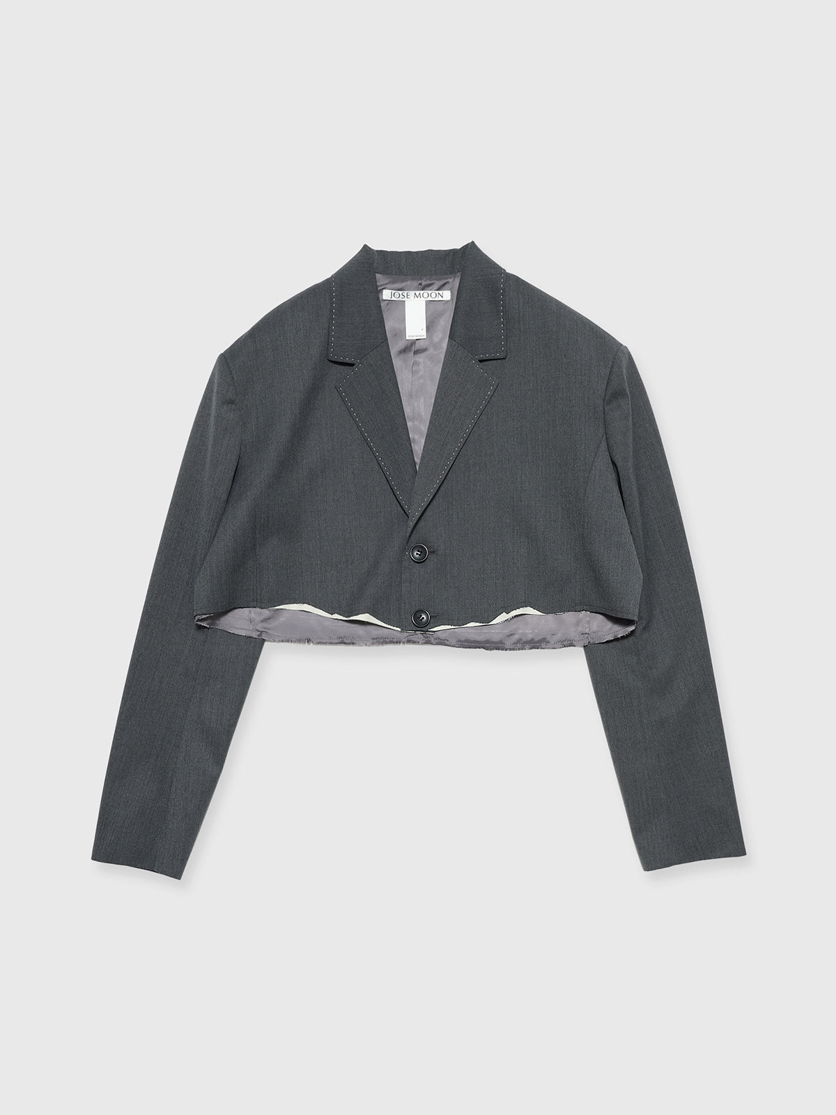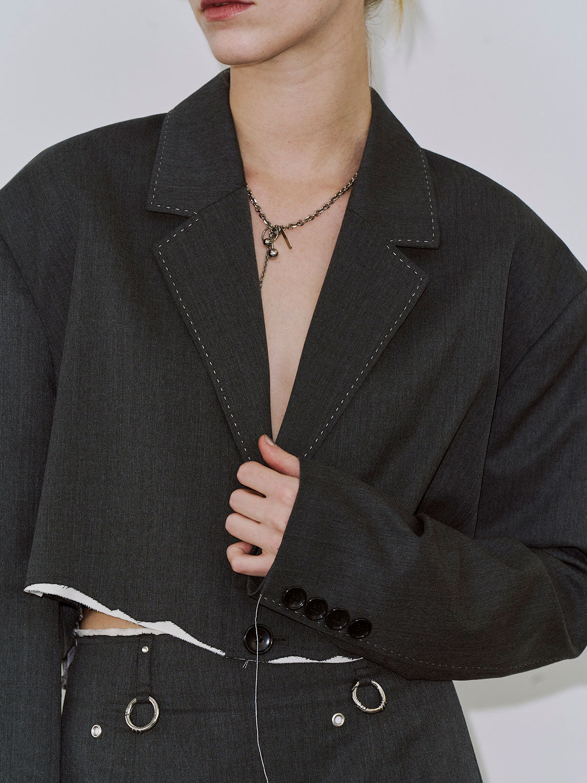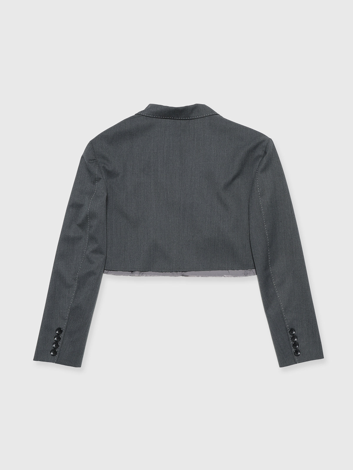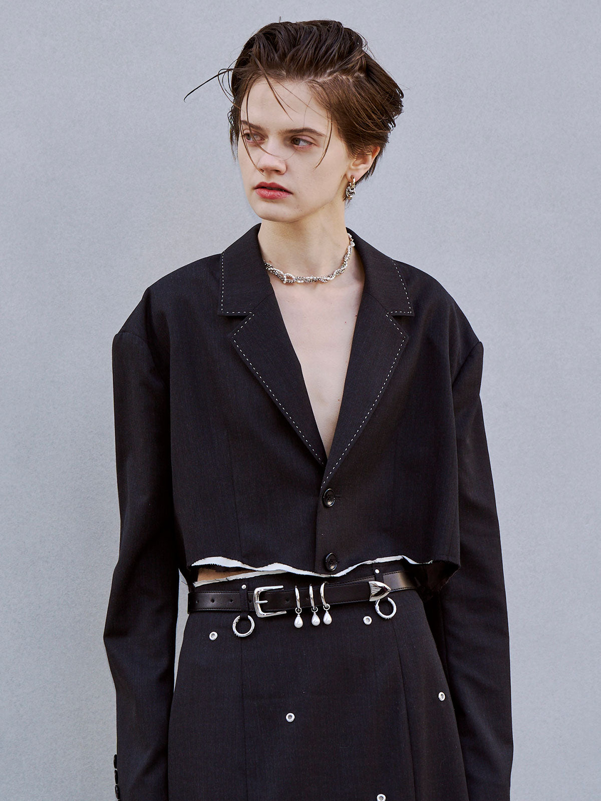 オーバージャケットを大胆にカッティングしたような、ショート丈のモードジャケット。