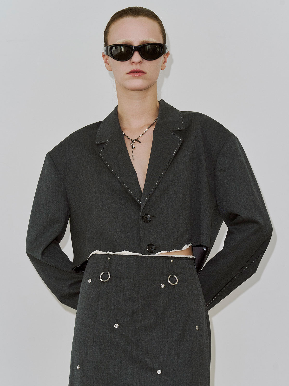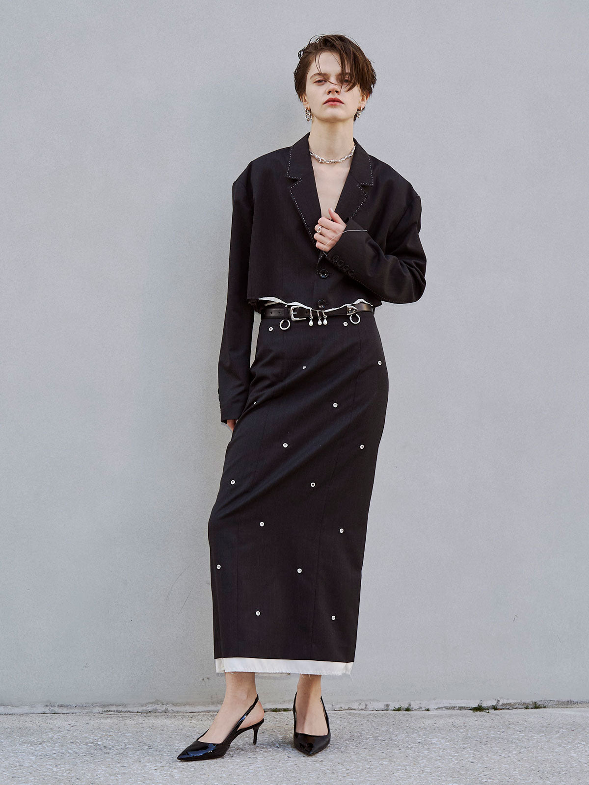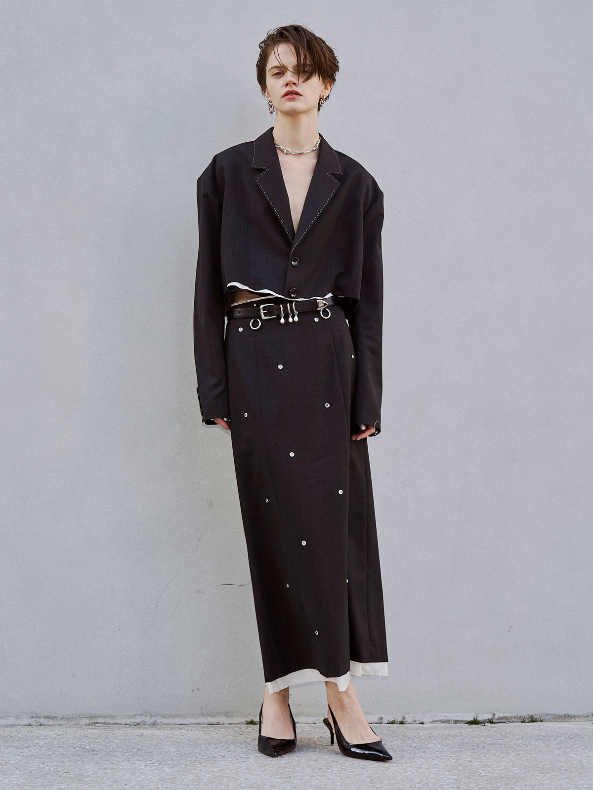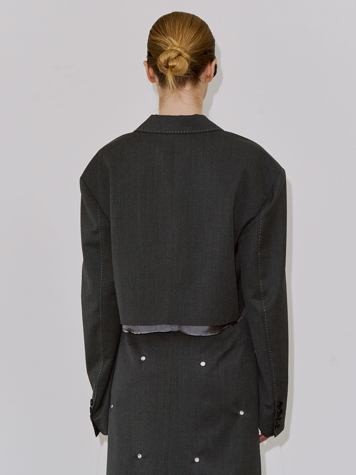 肩にはパッドを入れてシャープなラインを強調し、コンパクトながら存在感のあるバランスに仕上げました。