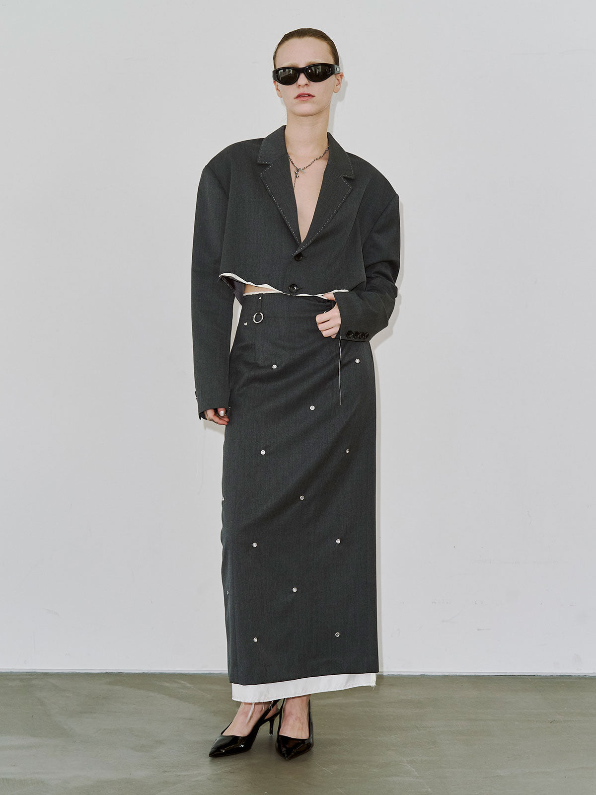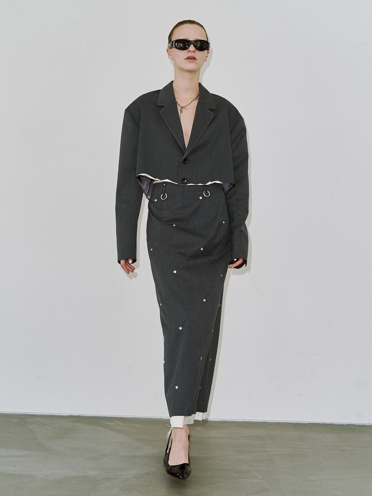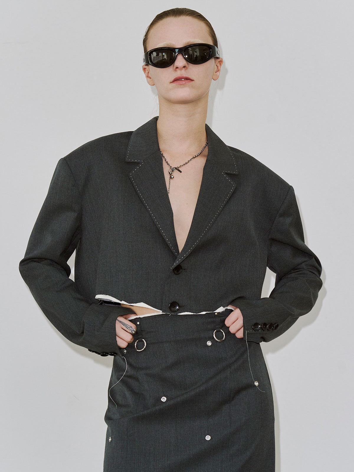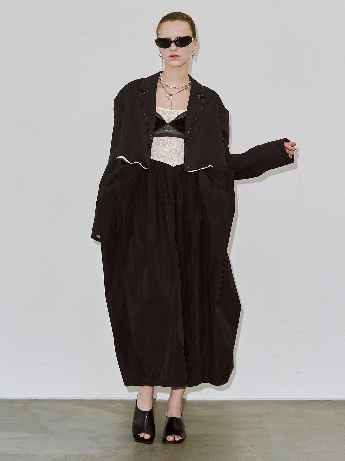 肩にはパッドを入れてシャープなラインを強調し、コンパクトながら存在感のあるバランスに仕上げました。