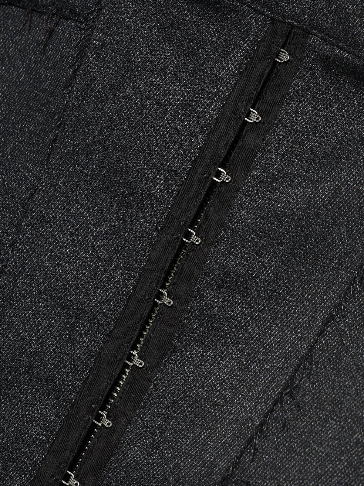前面にあしらわれたフックアイのディテールがタテにラインを強調し