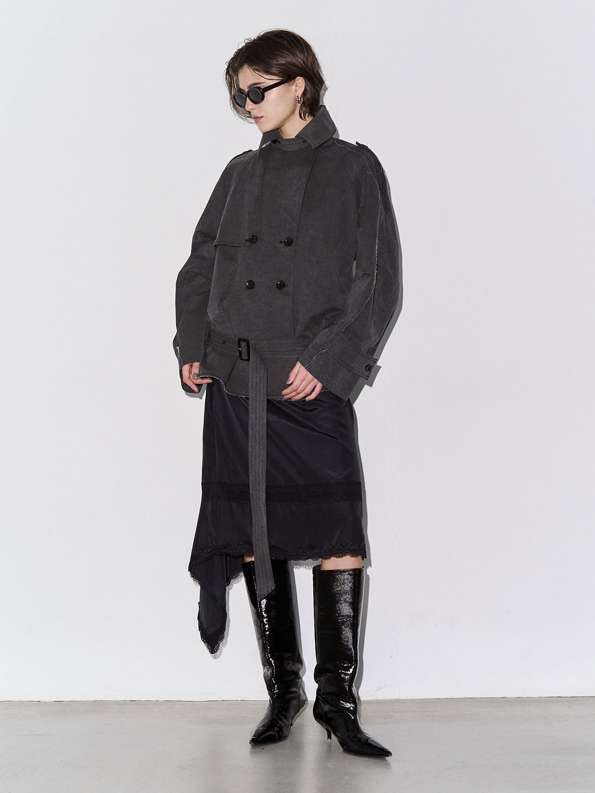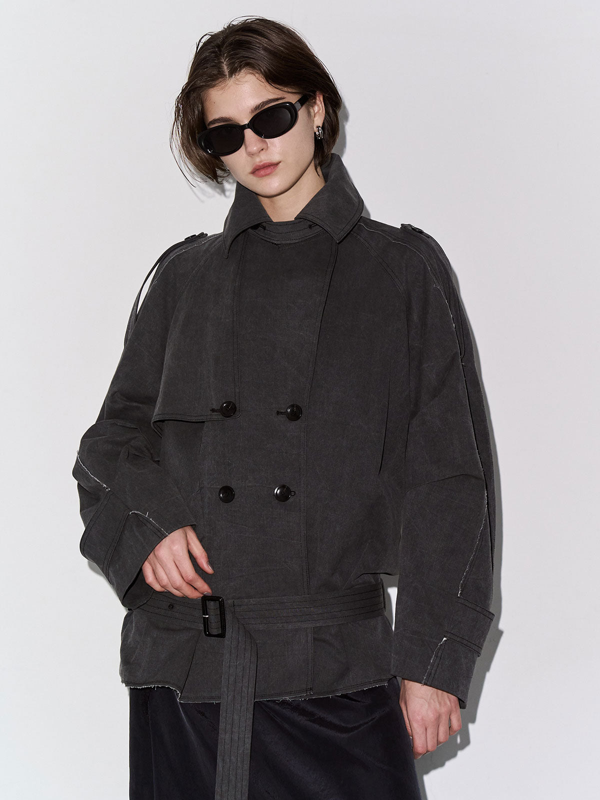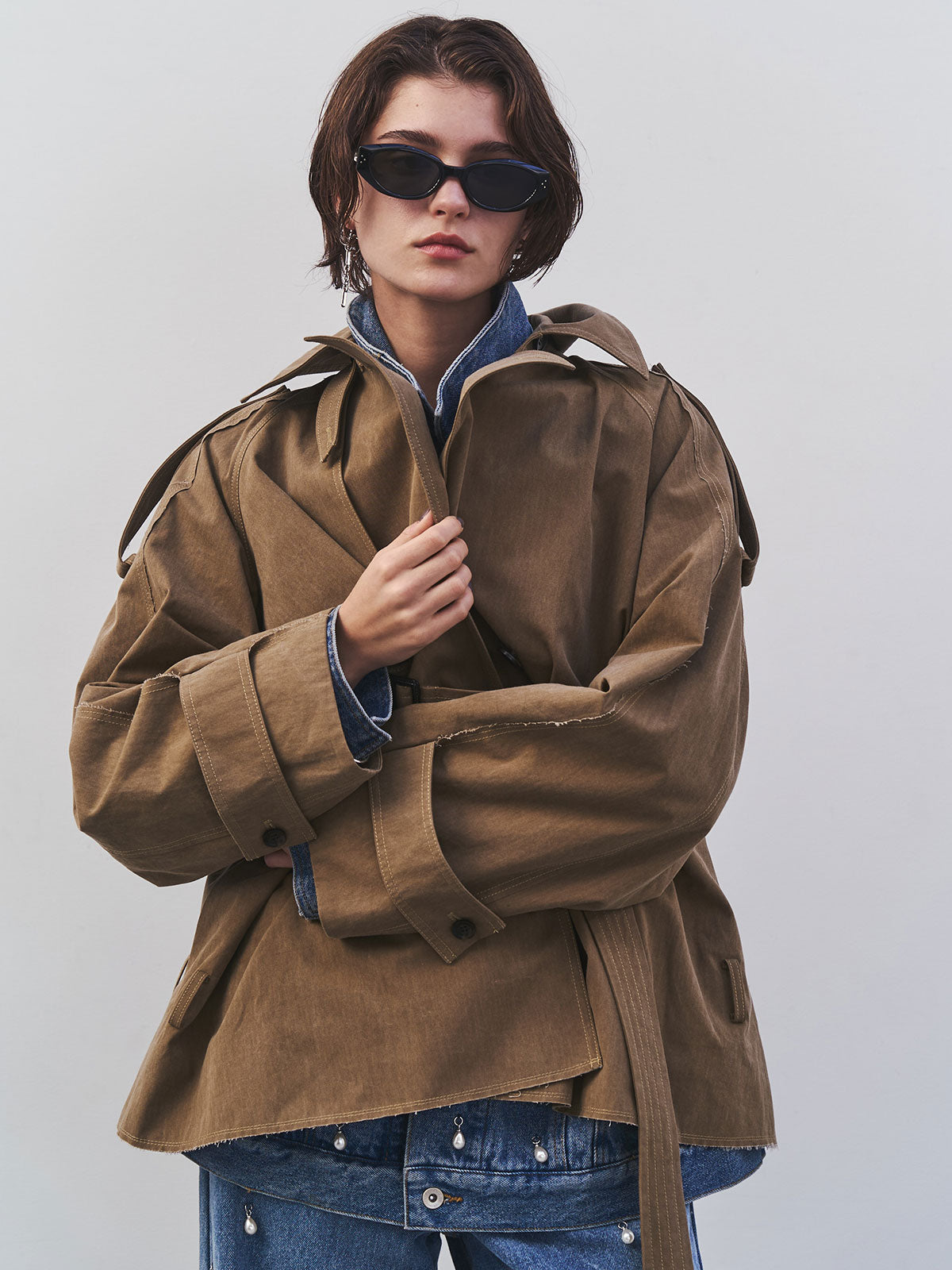 たっぷりとした見頃サイズと大きめの衿元はエッジの効いた佇まいを演出し、モードな印象を際立たせます。