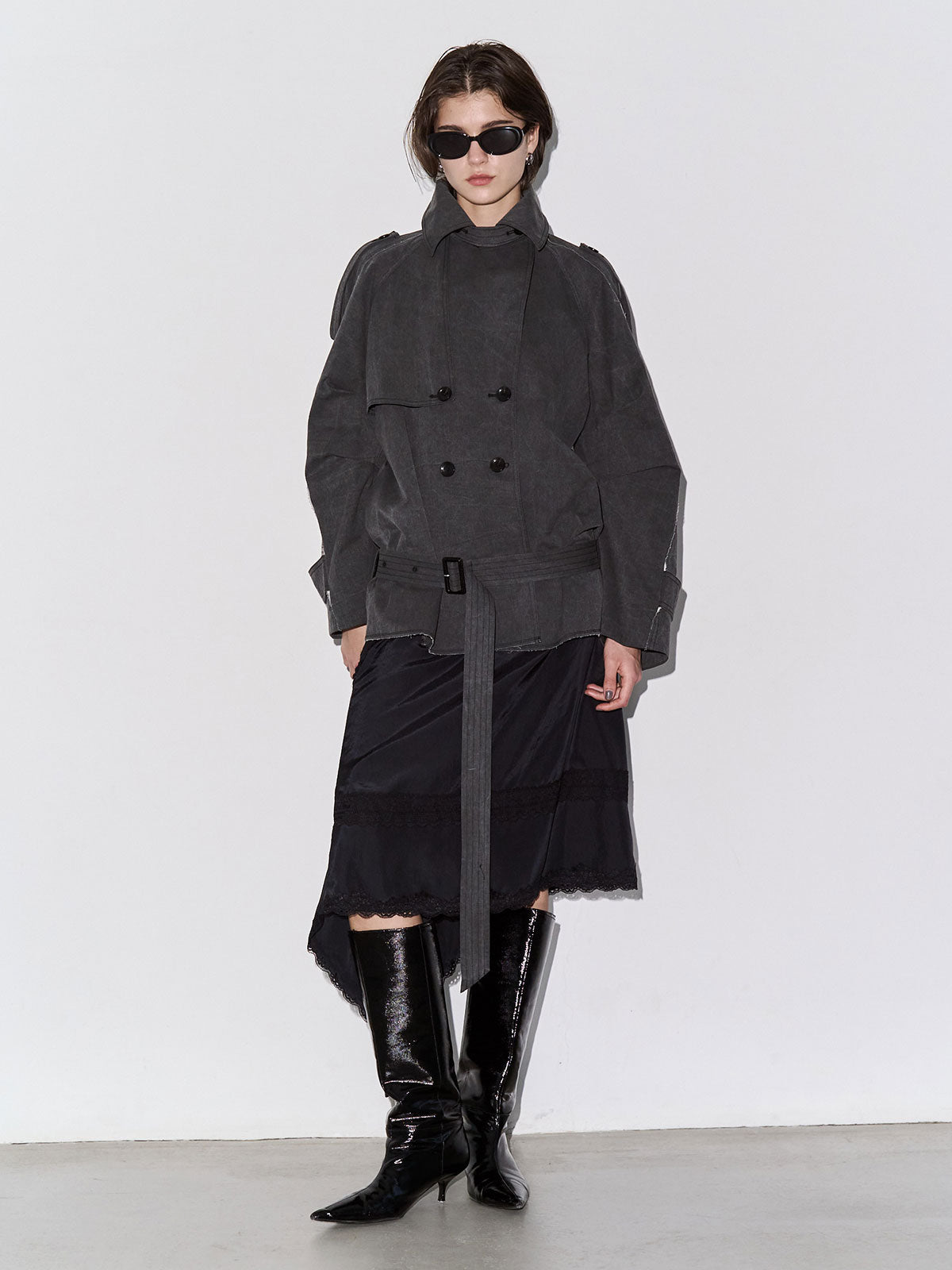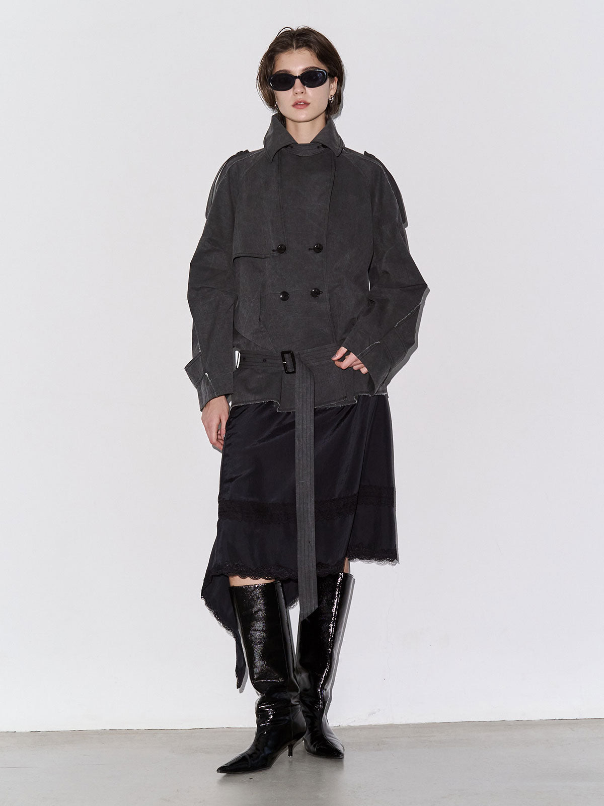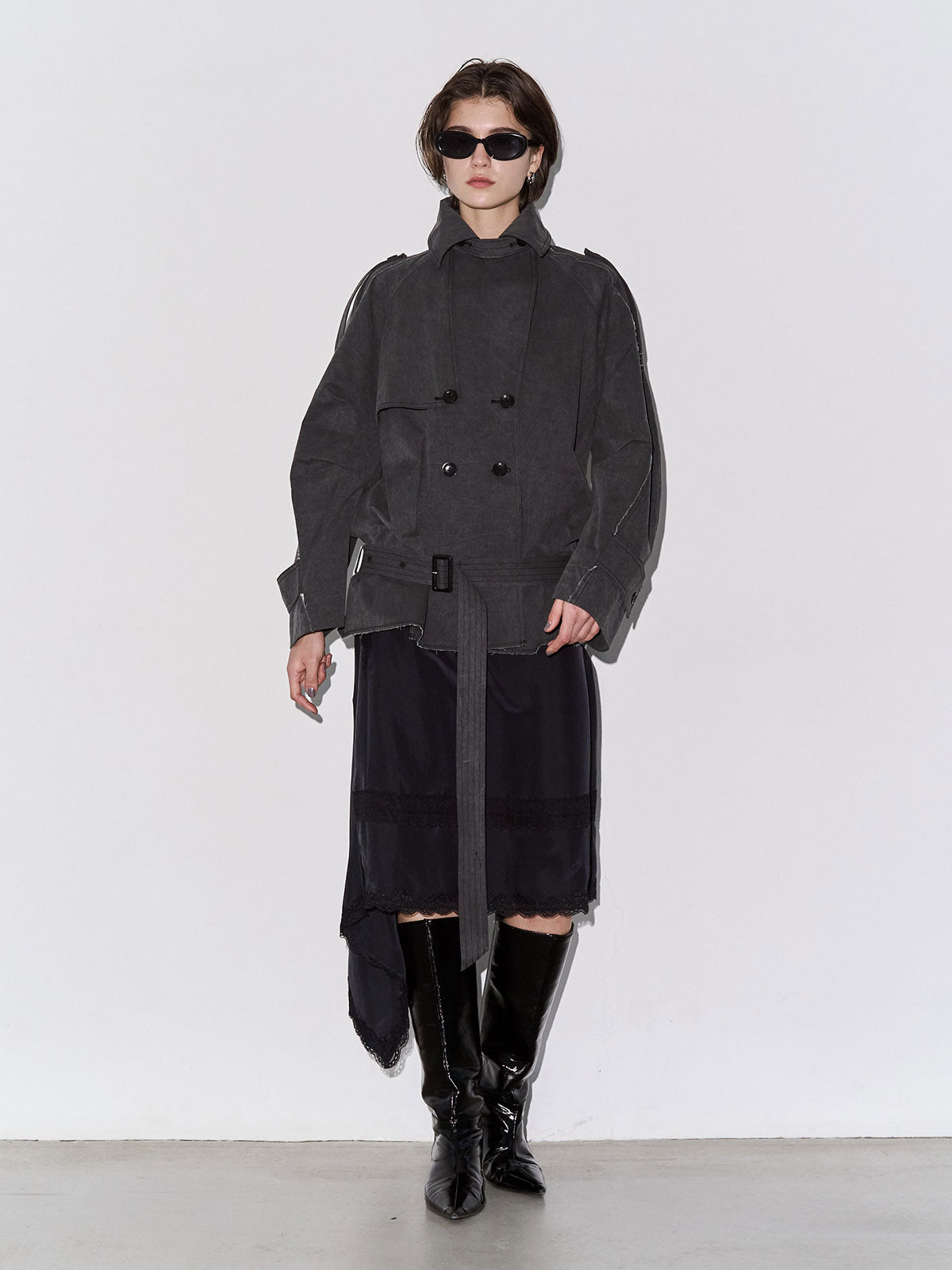 たっぷりとした見頃サイズと大きめの衿元はエッジの効いた佇まいを演出し、モードな印象を際立たせます。