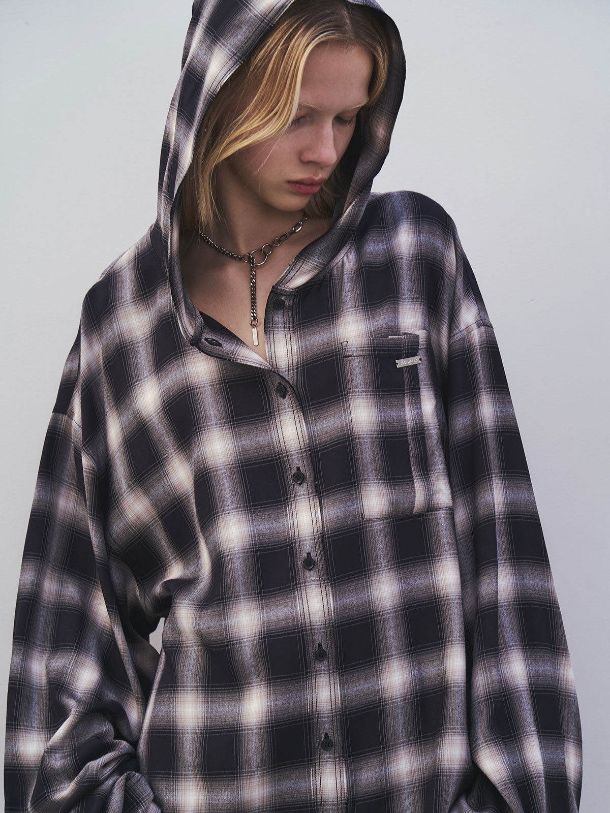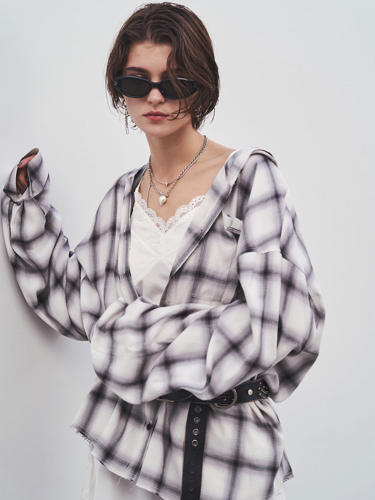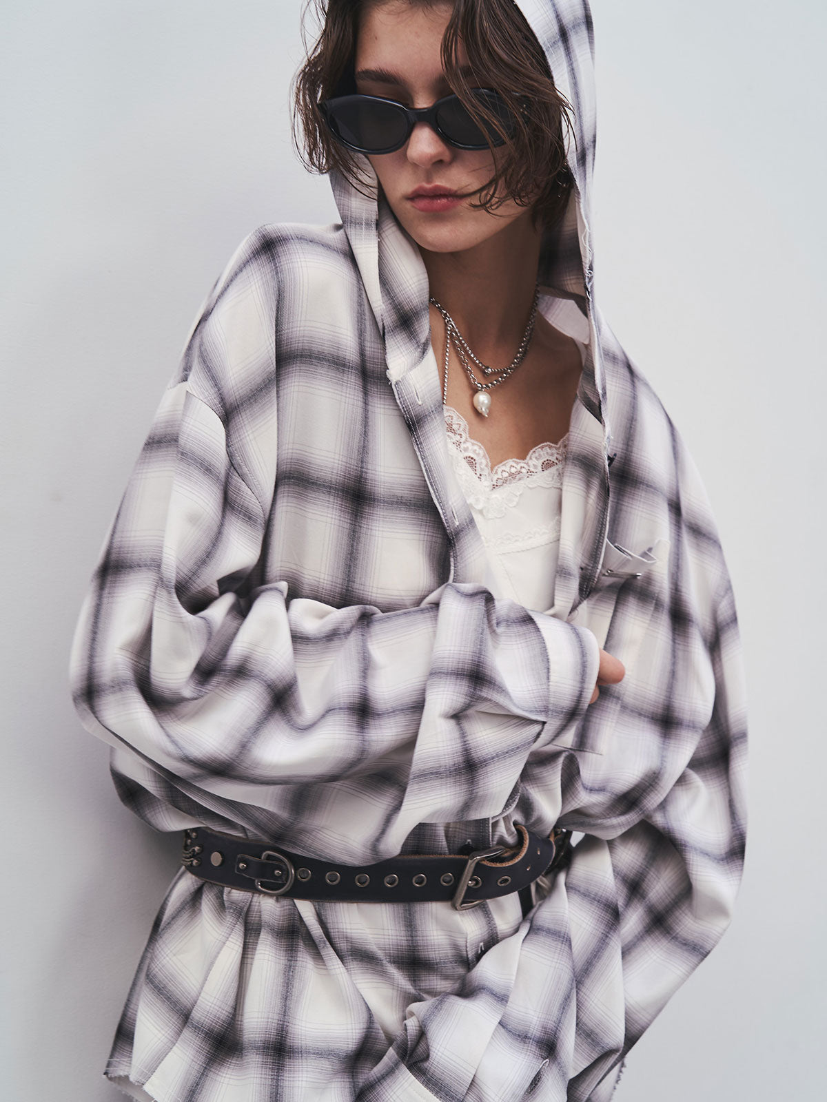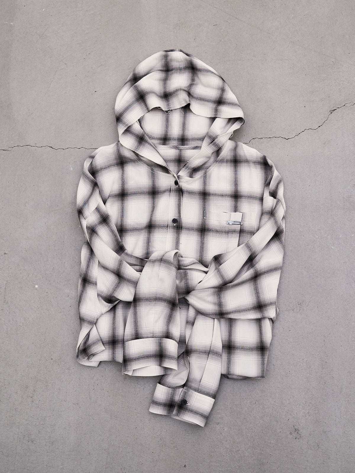 シャツのカジュアルさにひと癖を加えた、JOSEMOONらしいモードなチェックフーディー。