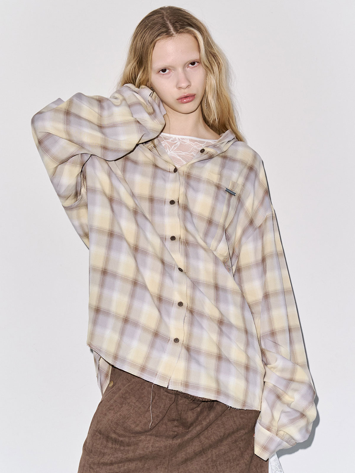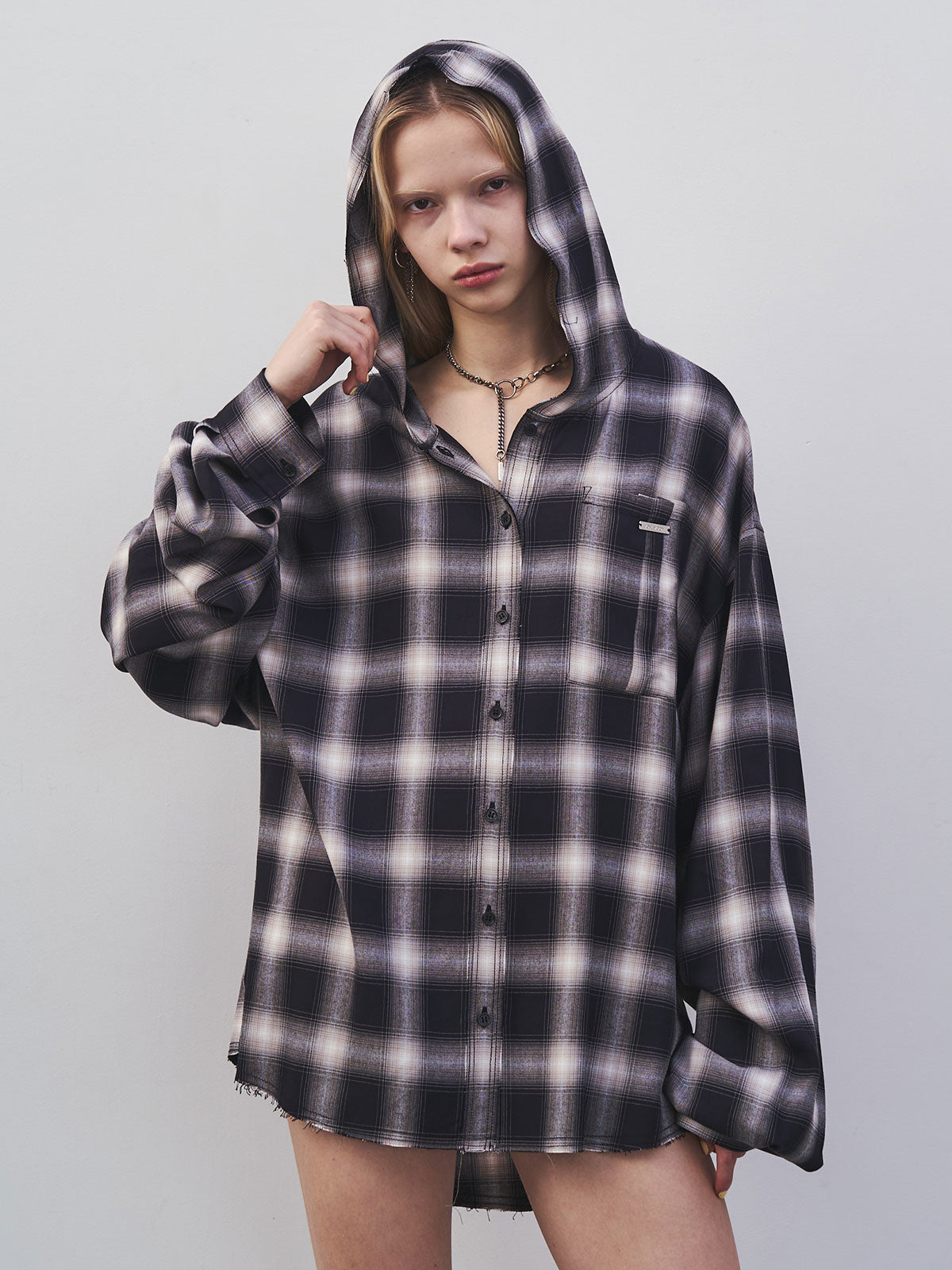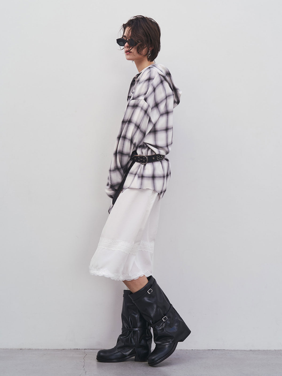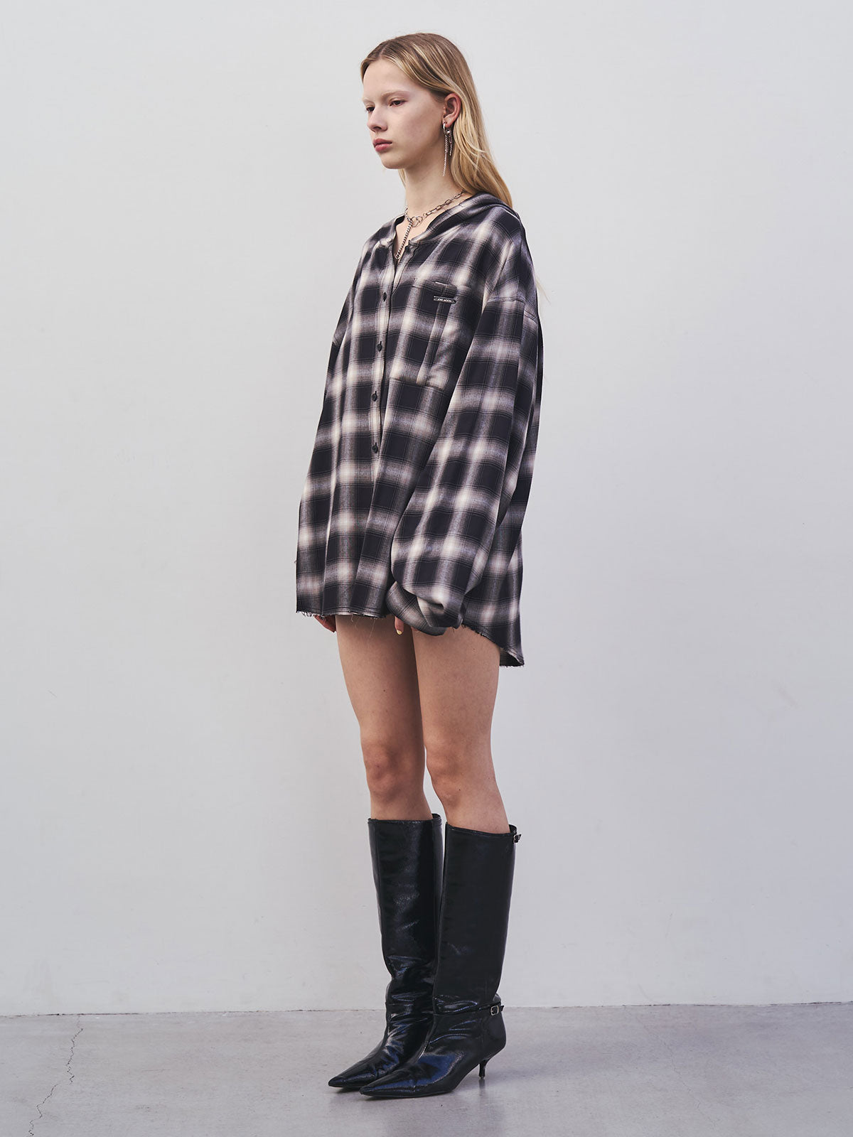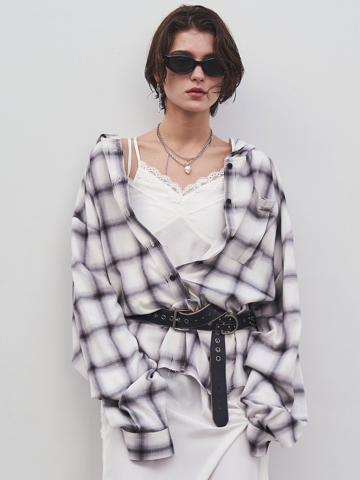 シャツのカジュアルさにひと癖を加えた、JOSEMOONらしいモードなチェックフーディー。