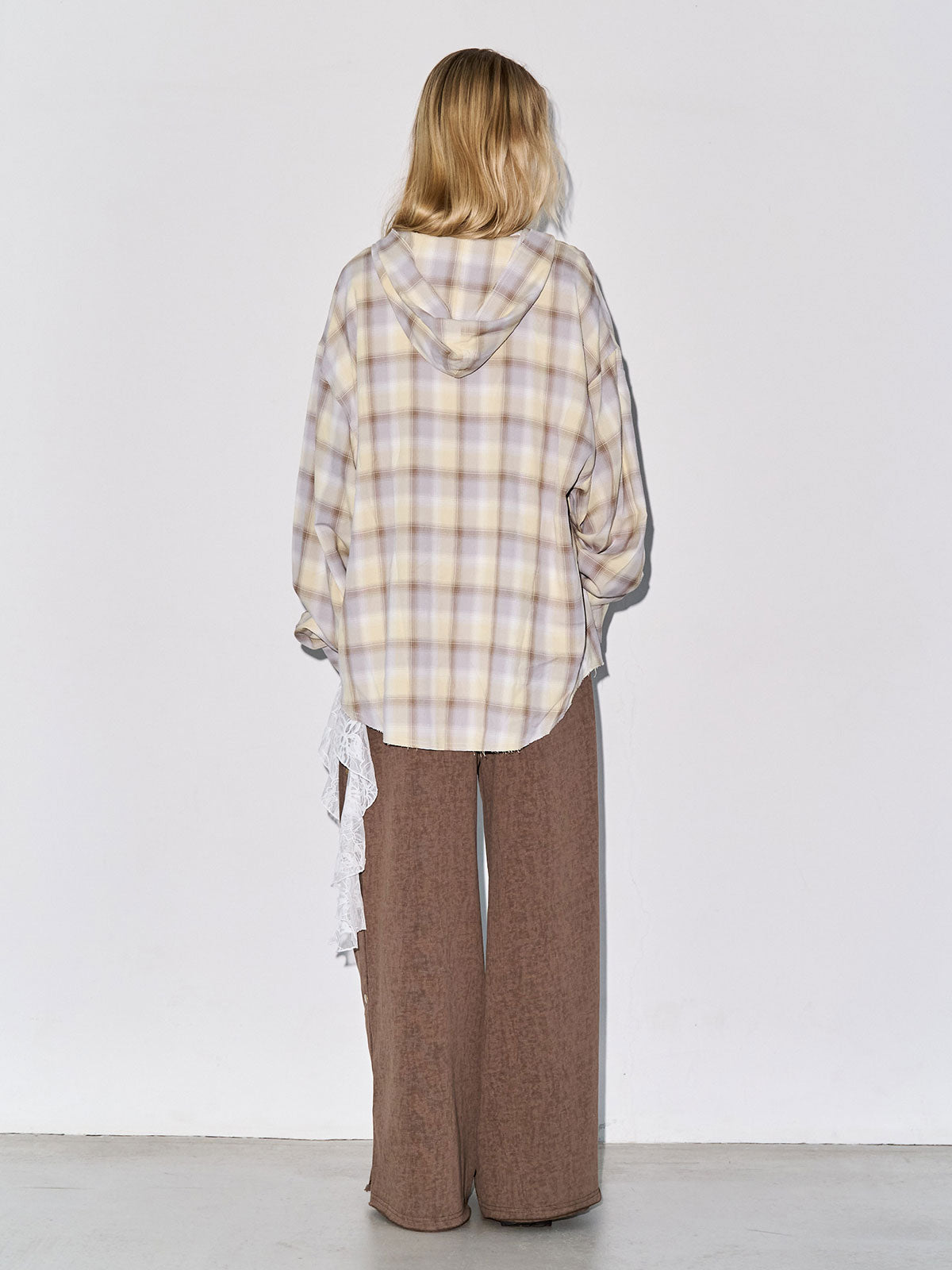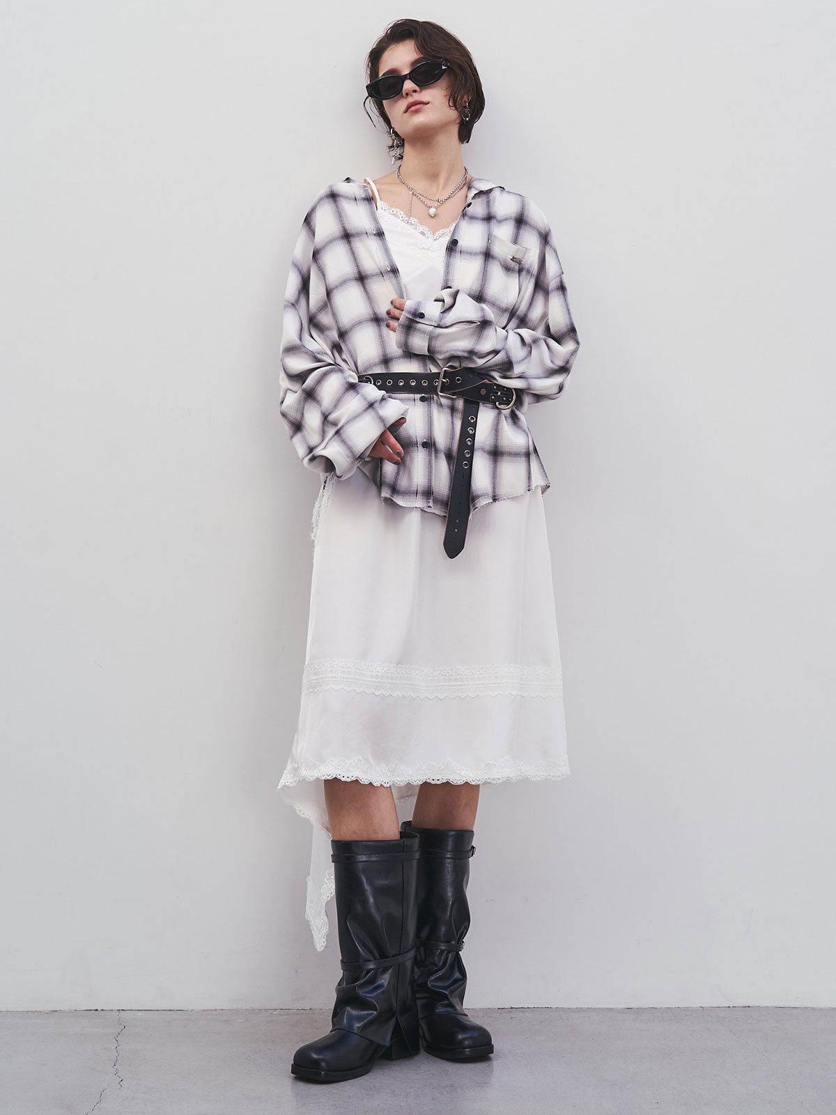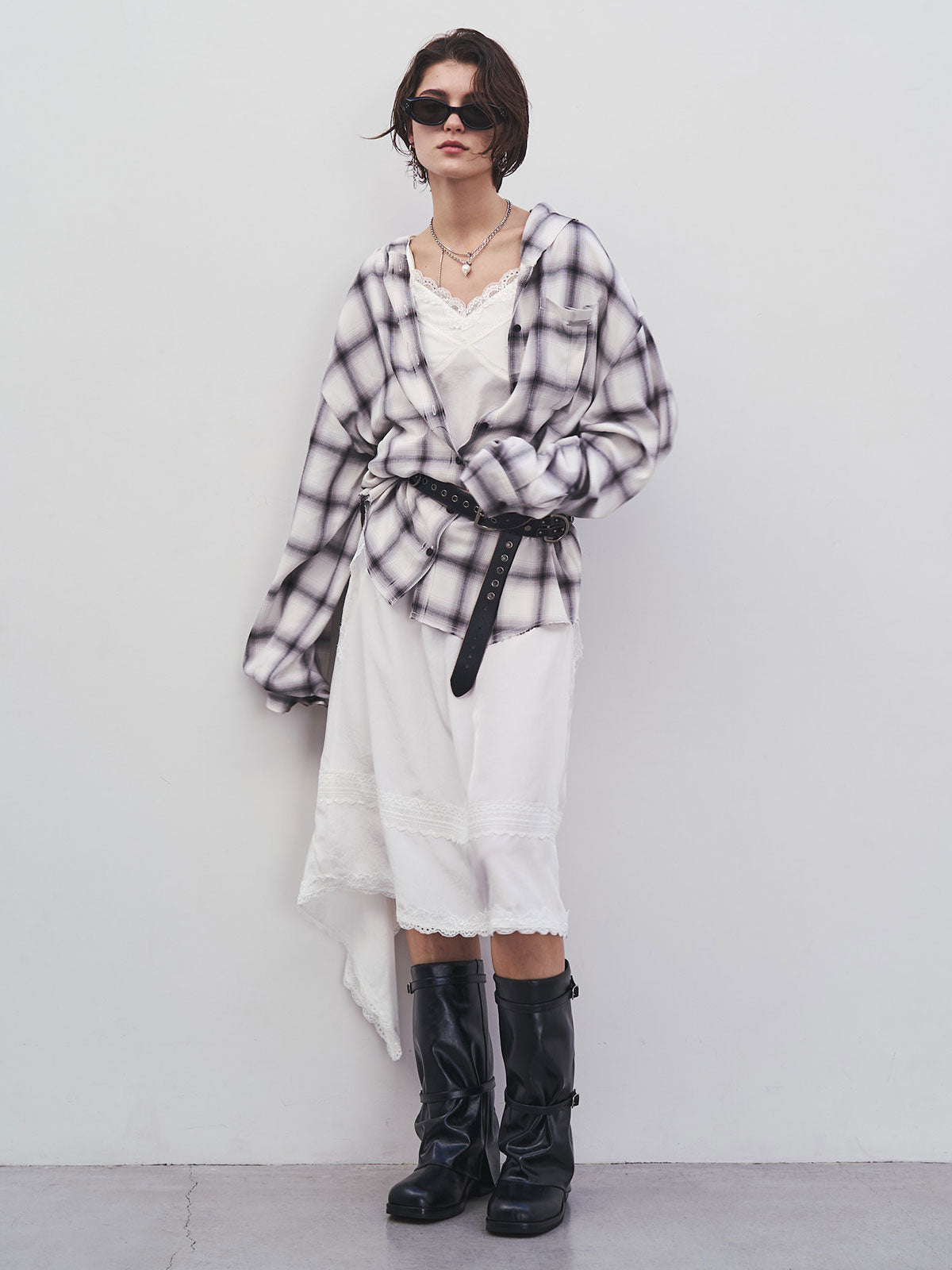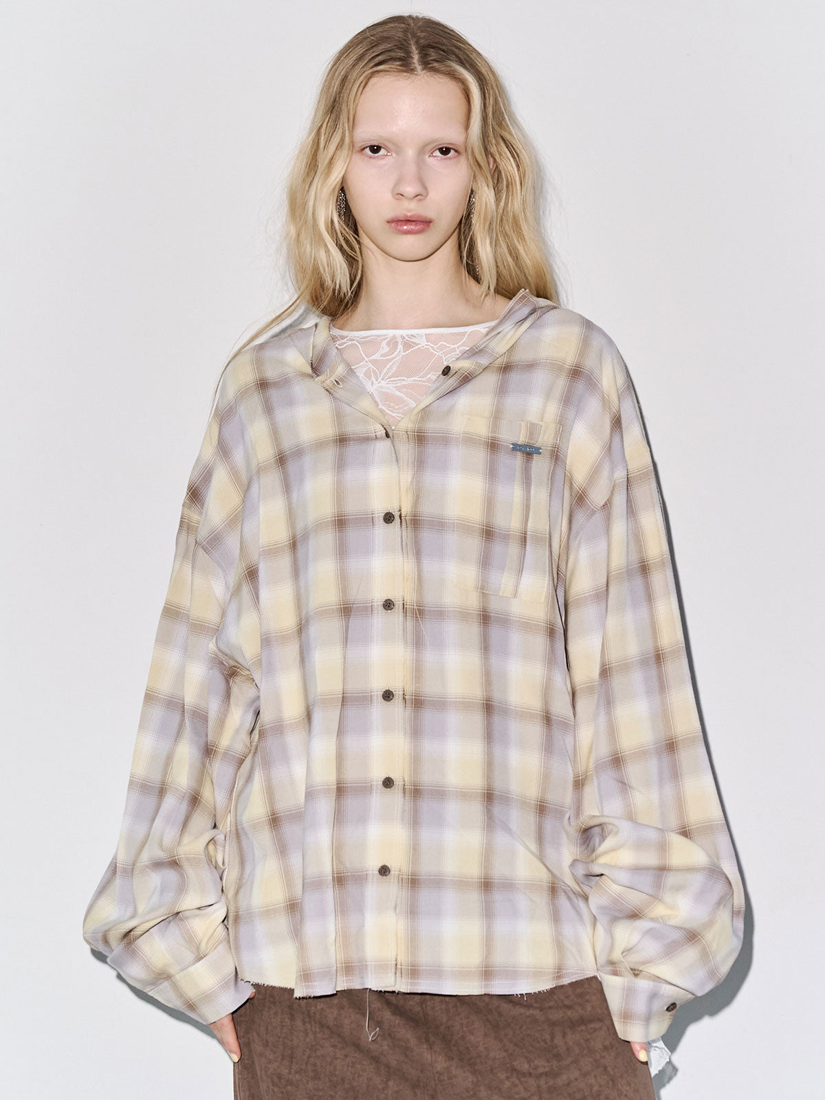 シャツのカジュアルさにひと癖を加えた、JOSEMOONらしいモードなチェックフーディー。