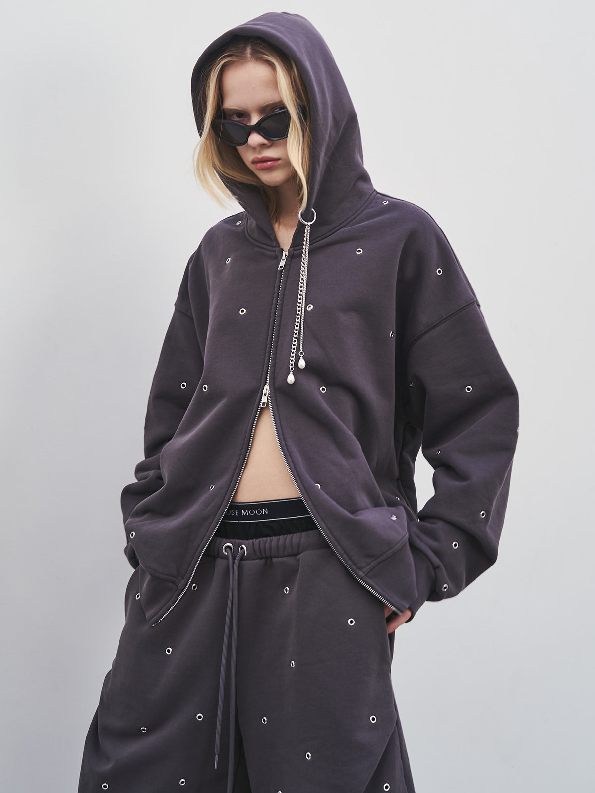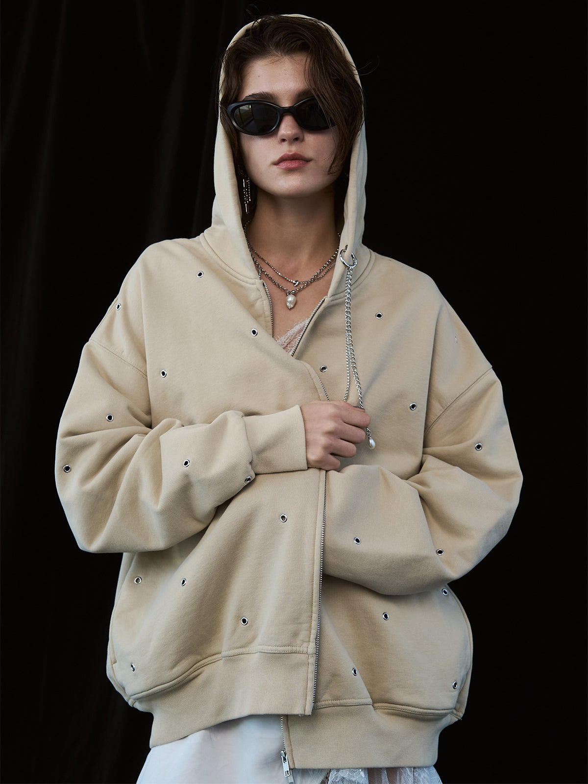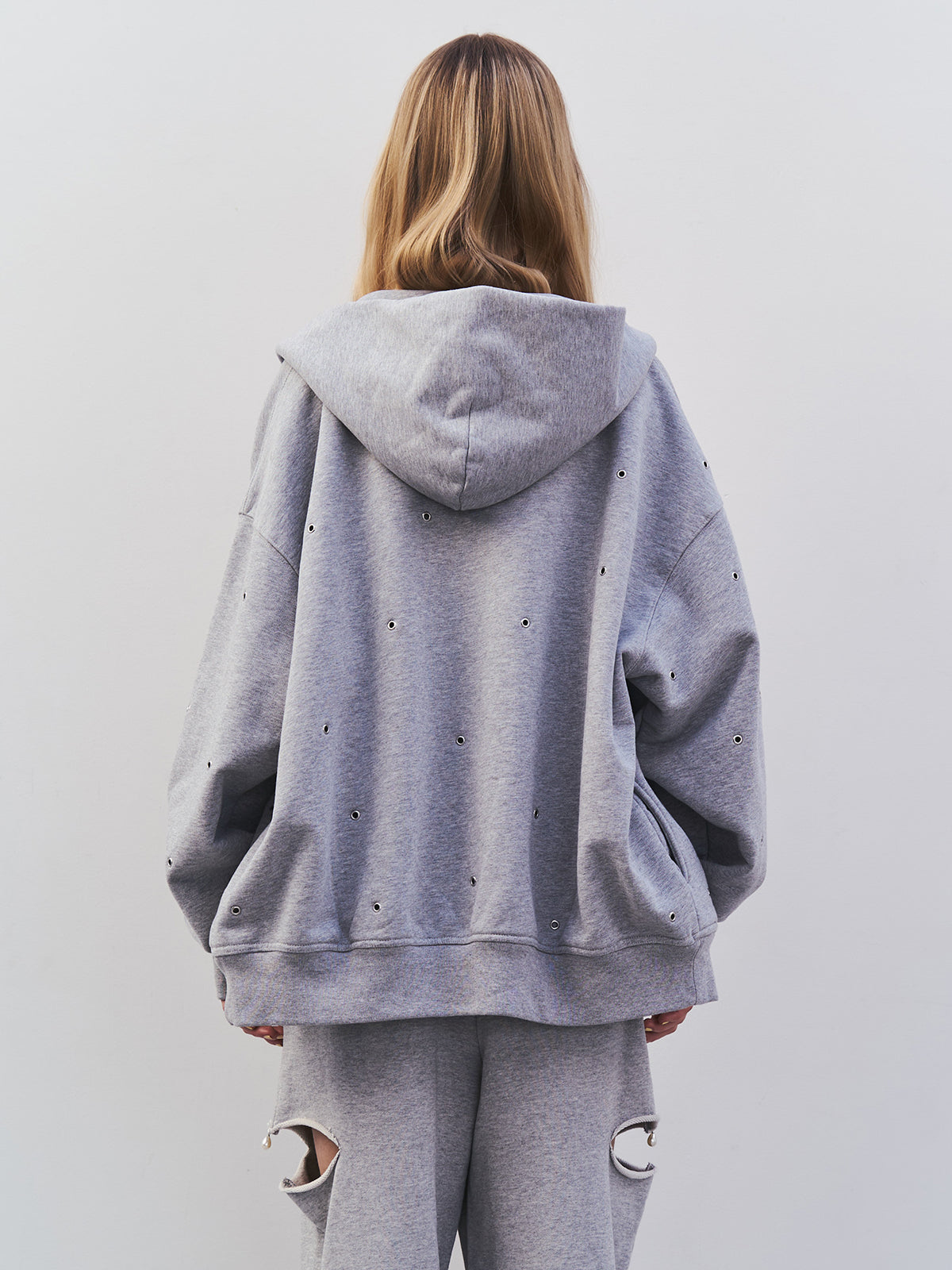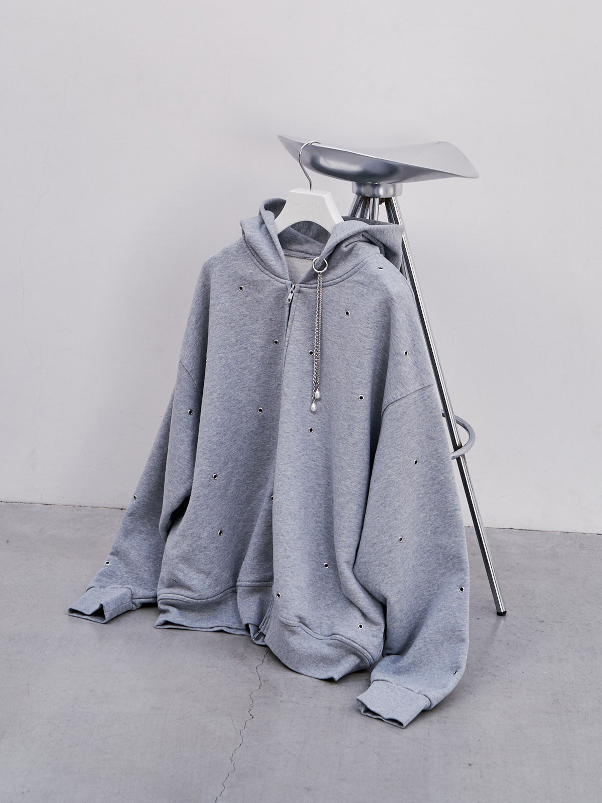 全体にハトメを打ち込んだ、存在感のあるフーディー。