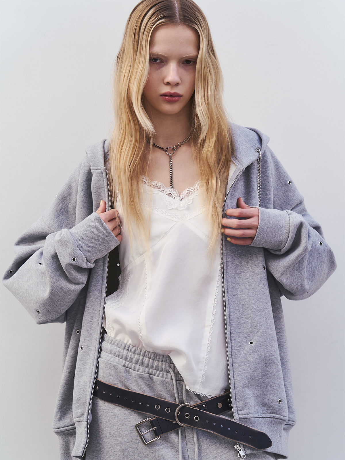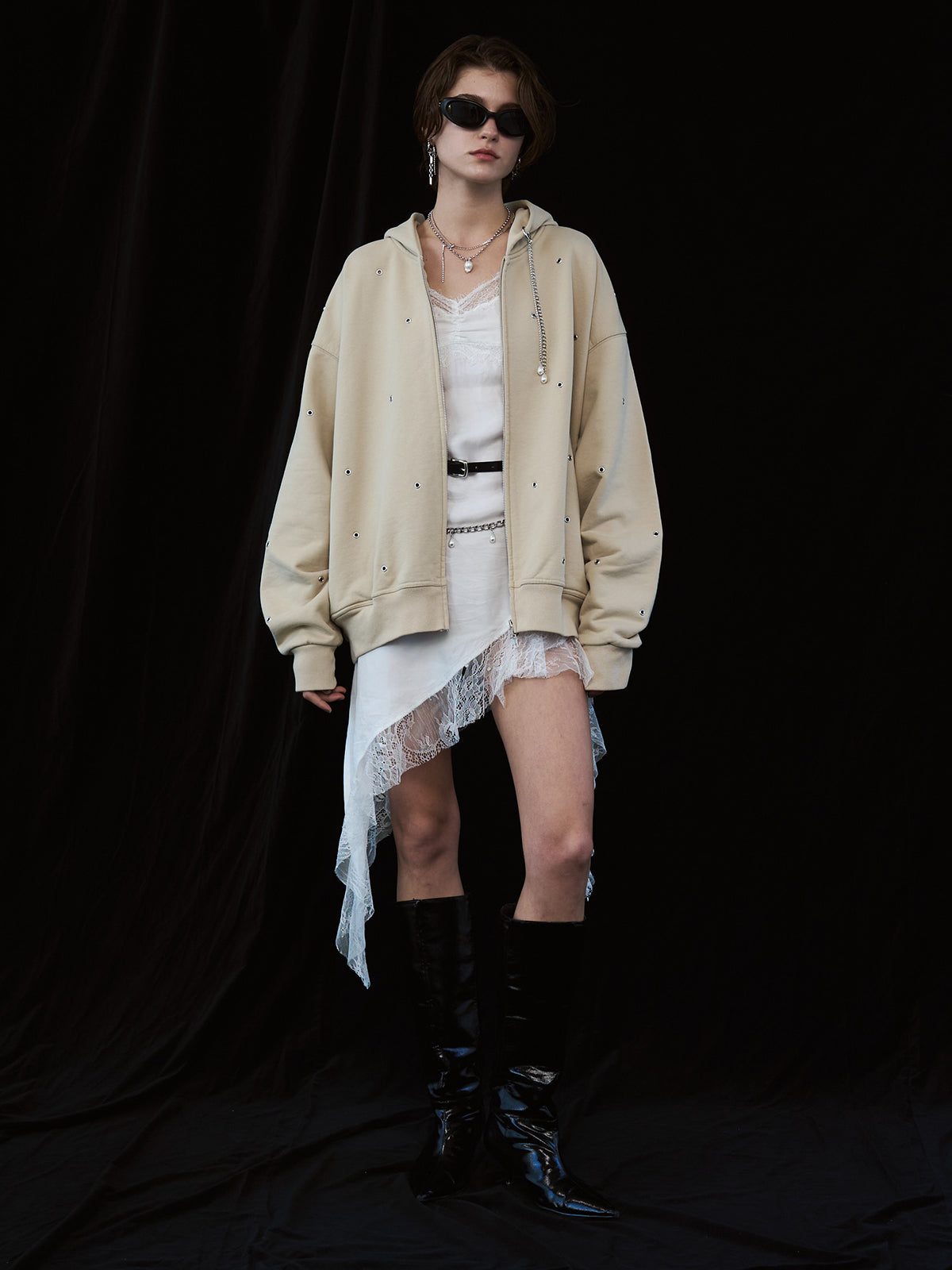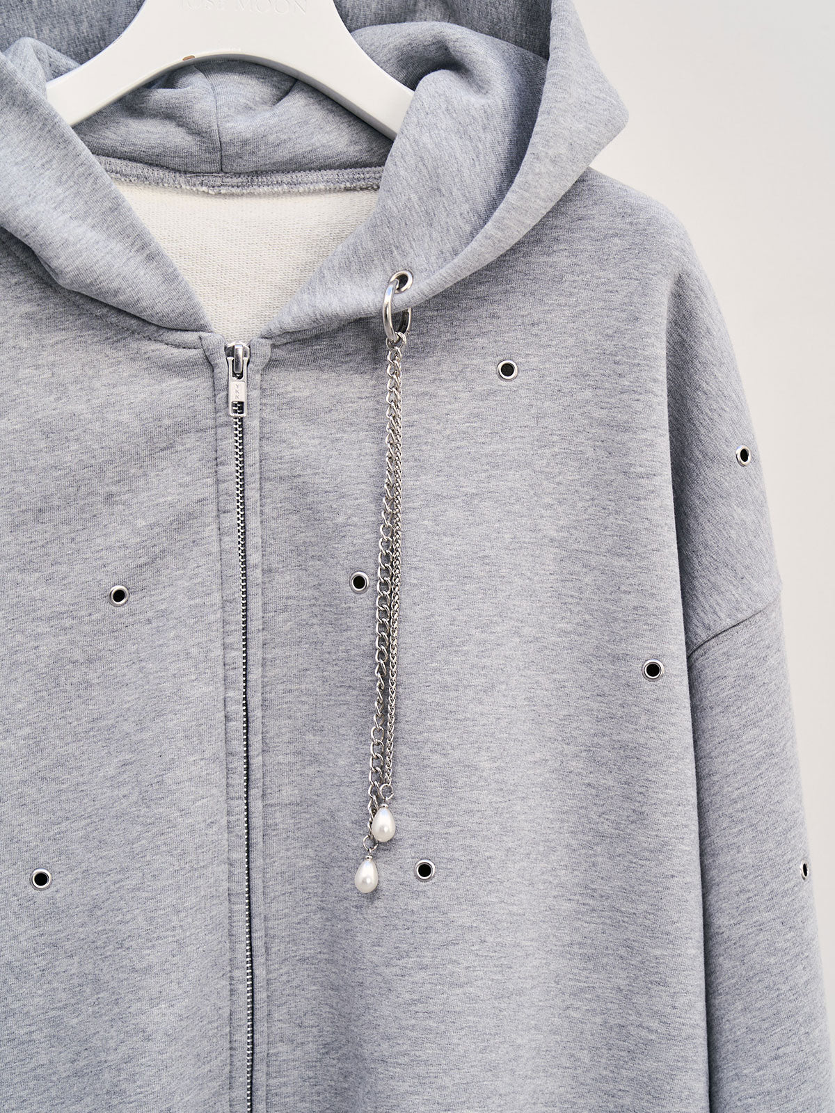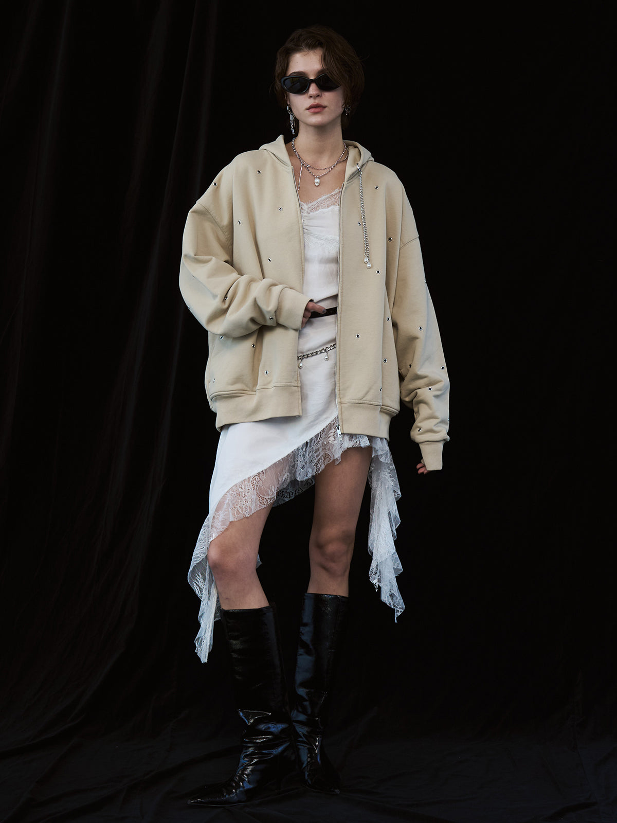 全体にハトメを打ち込んだ、存在感のあるフーディー。