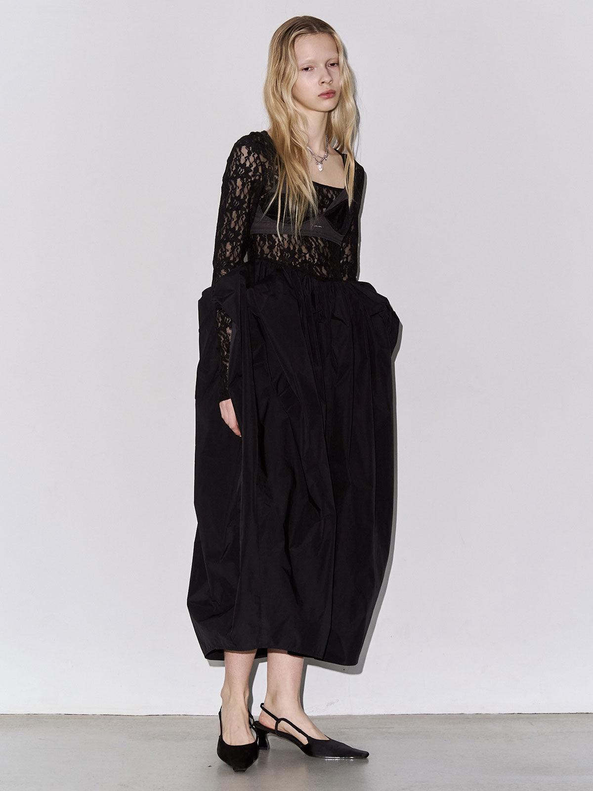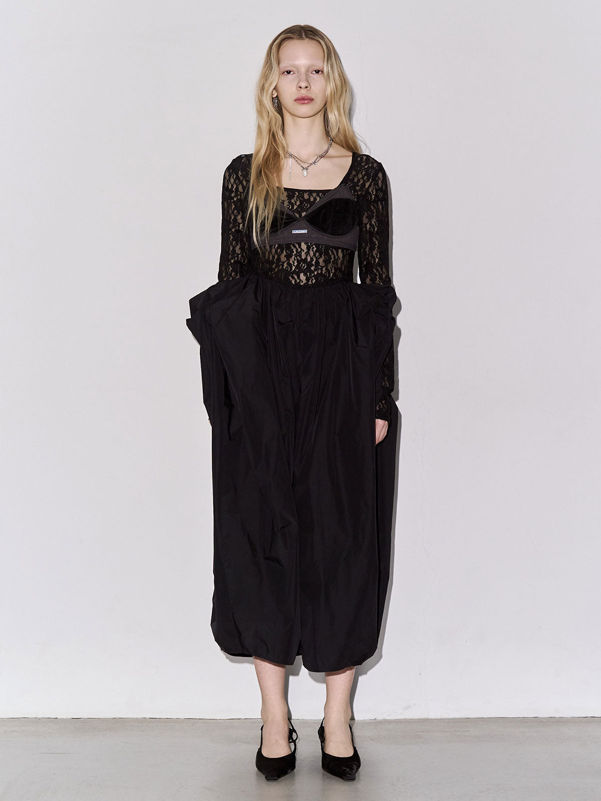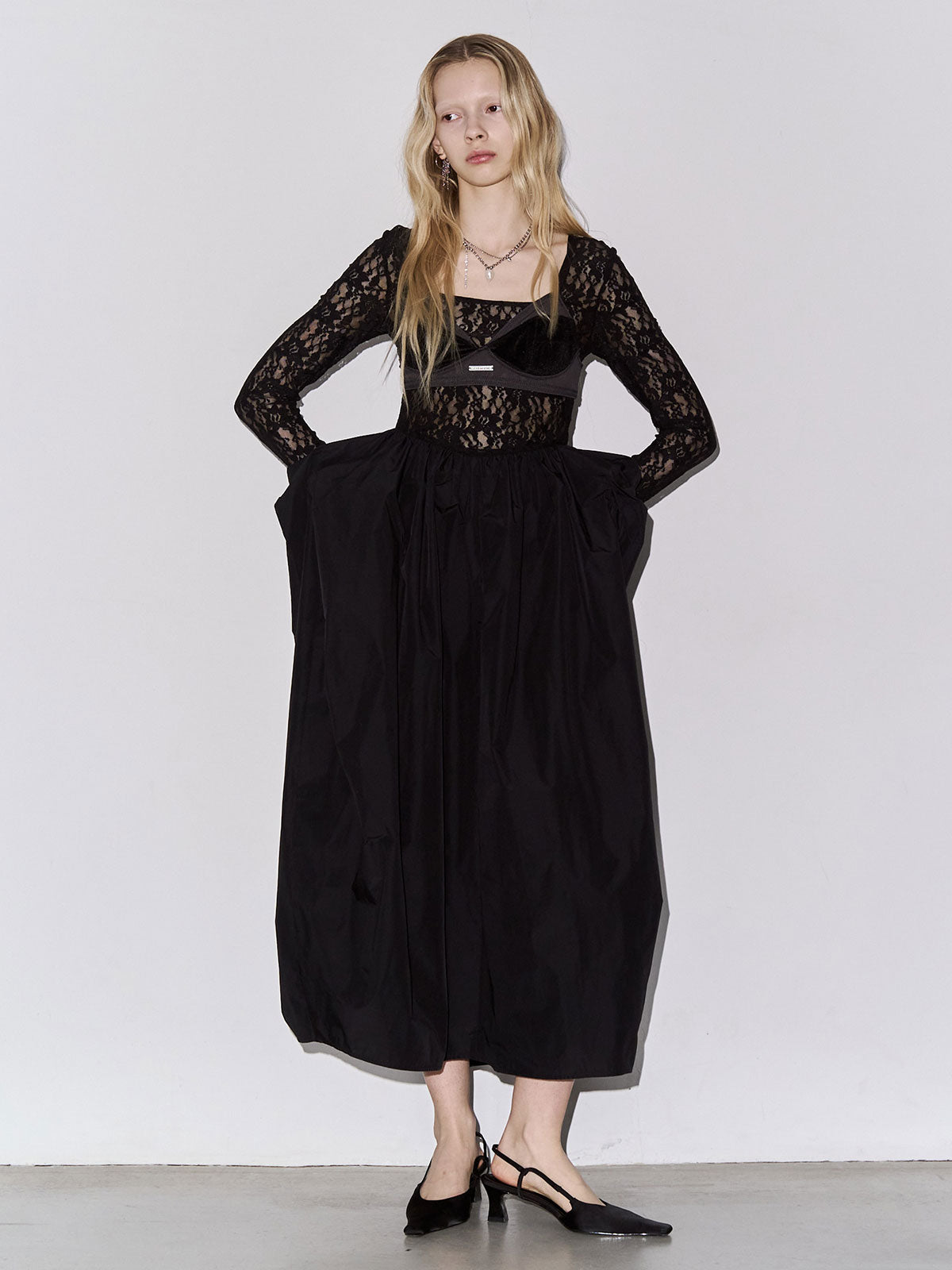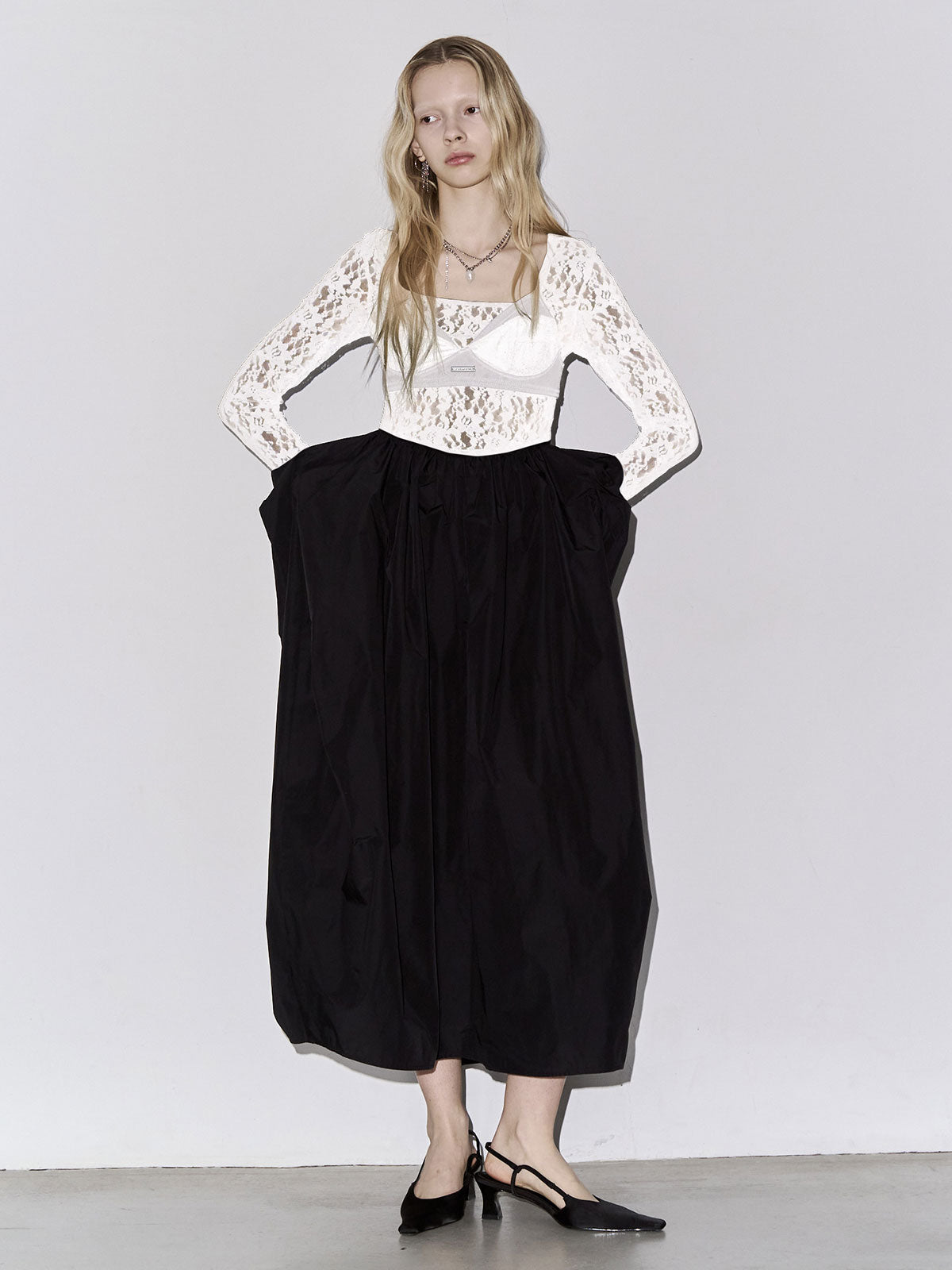 上見頃はしっかりとホールドした伸縮性のあるレース素材を使用しスカート部分は異素材でボリュームを持たせたワンピース。