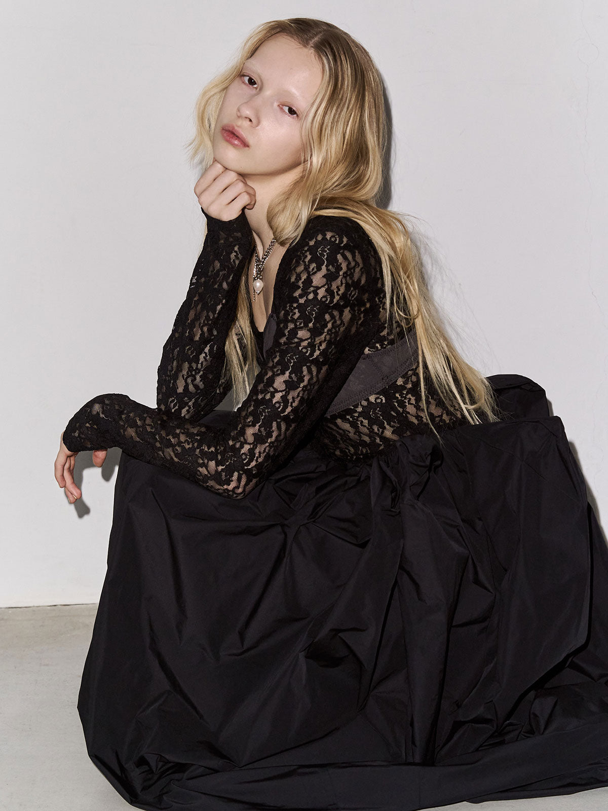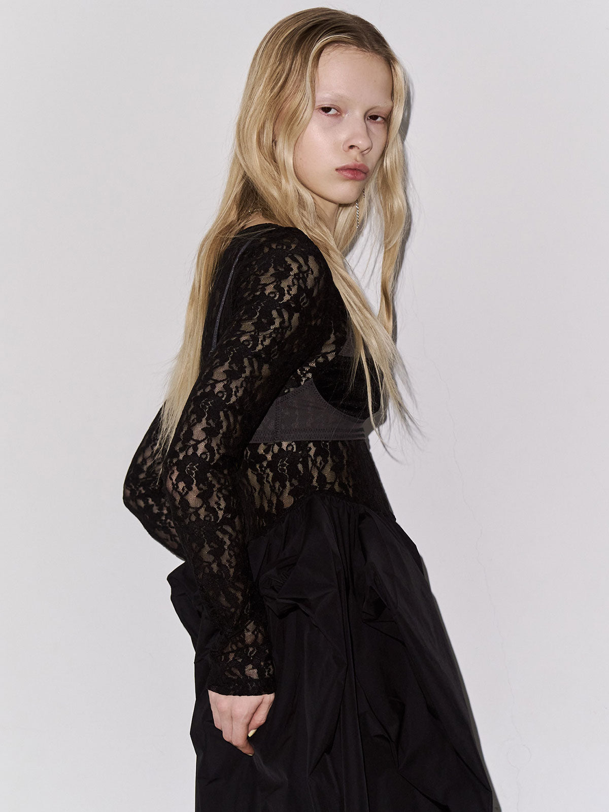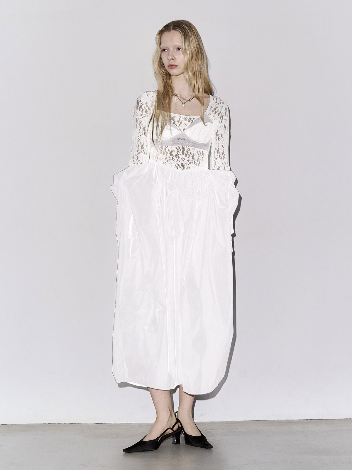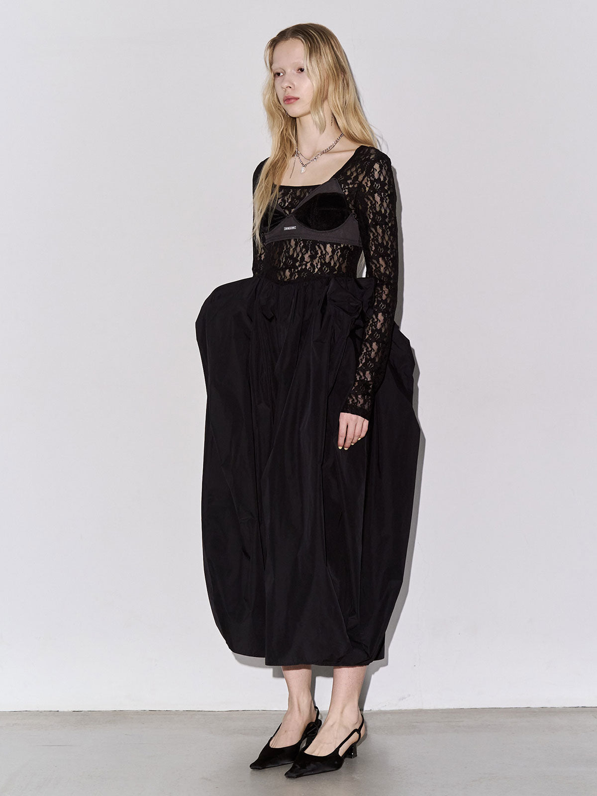 上見頃はしっかりとホールドした伸縮性のあるレース素材を使用しスカート部分は異素材でボリュームを持たせたワンピース。