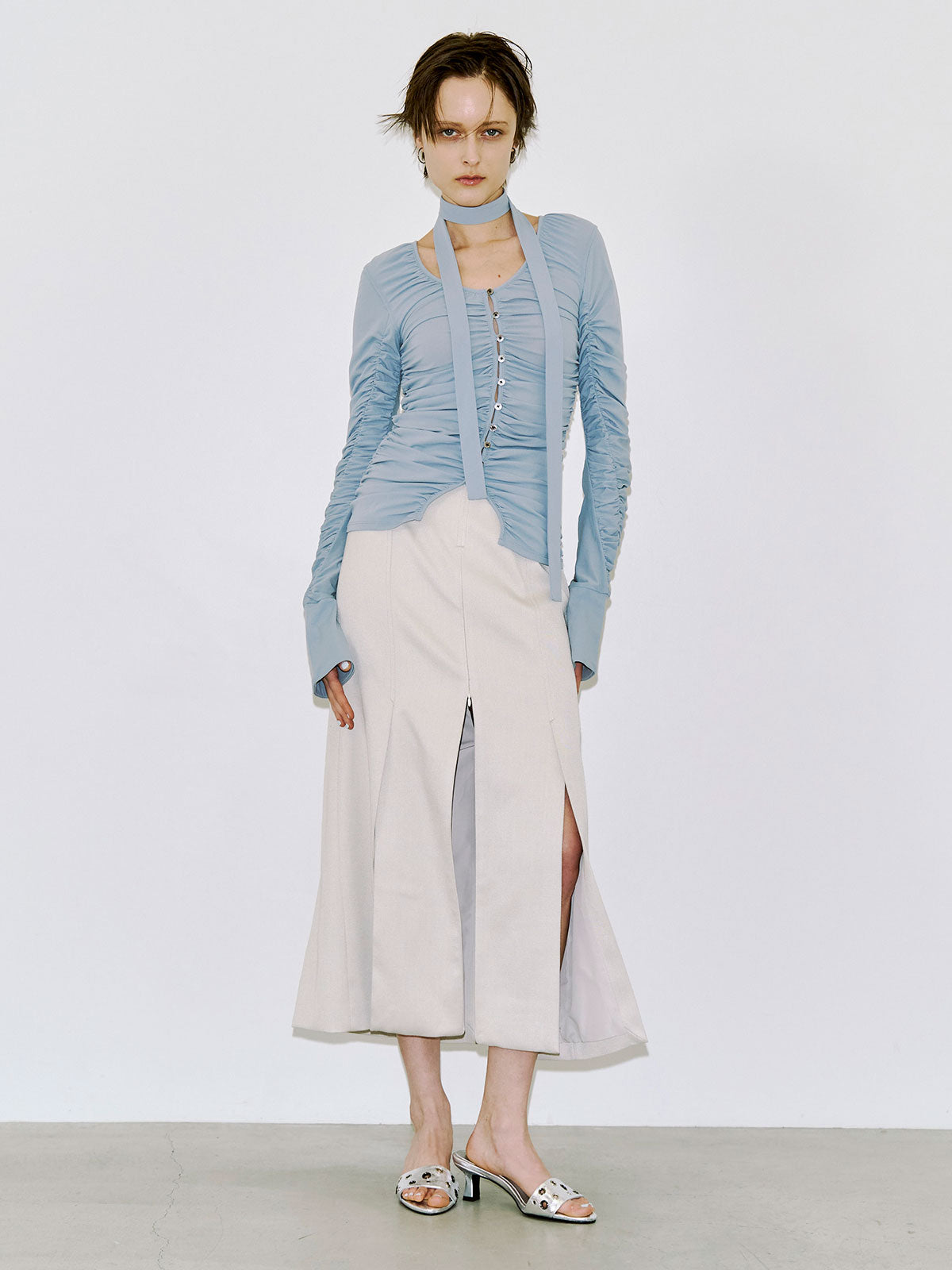 両サイドの深めの大胆なベンツに加え前中心にはファスナーでスリットを調整可能。