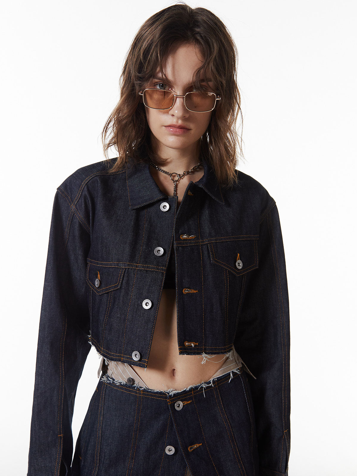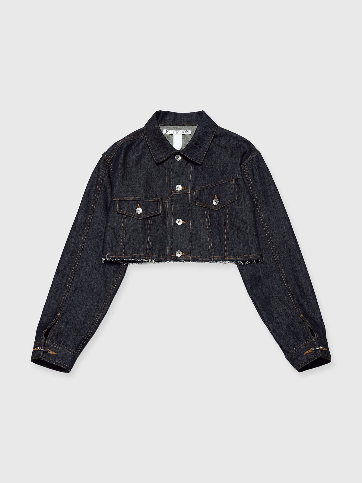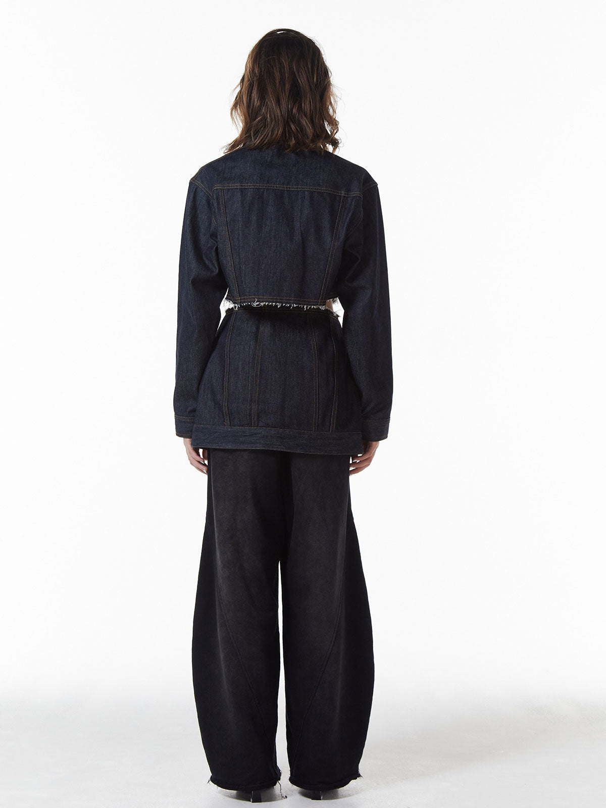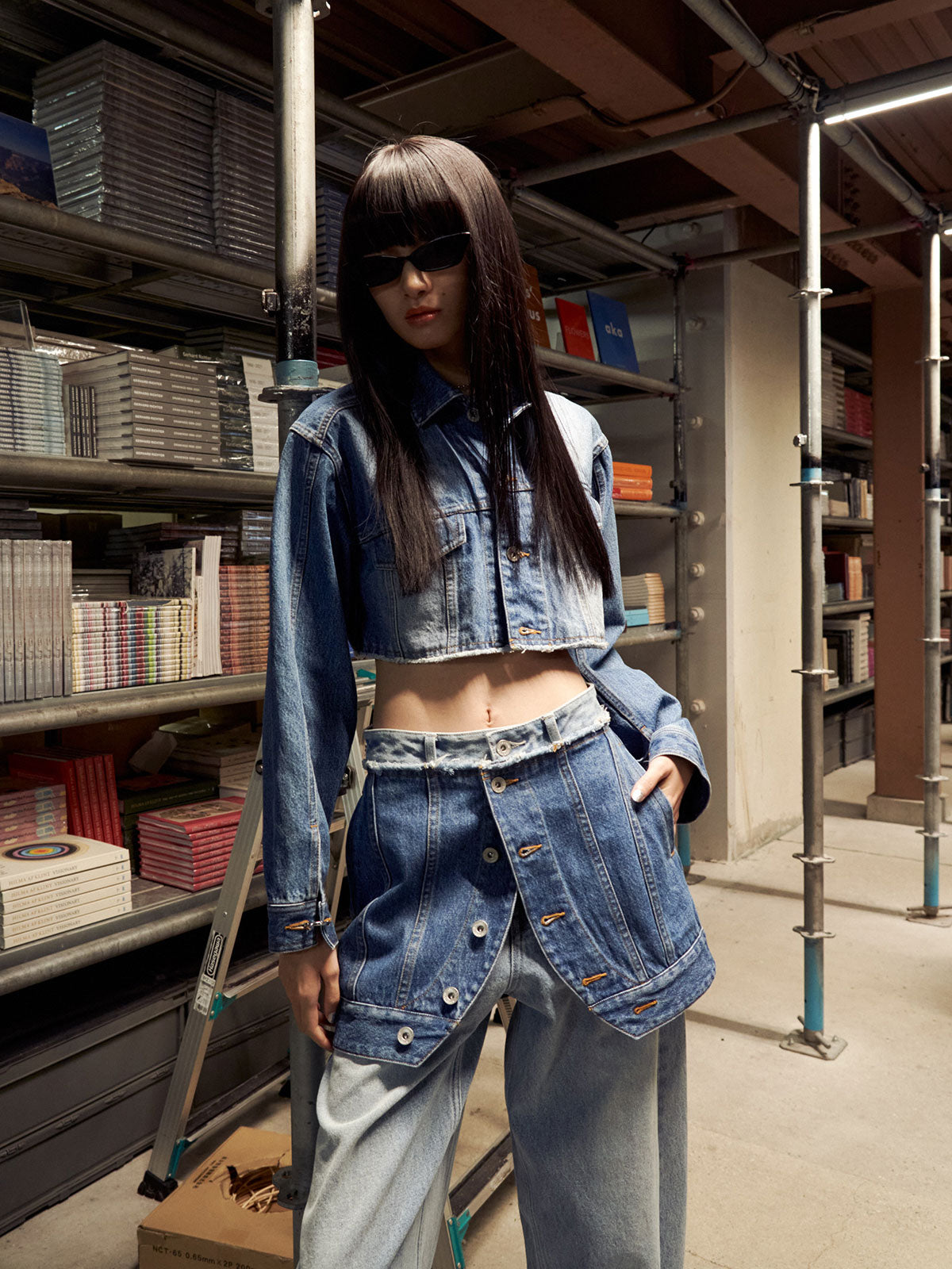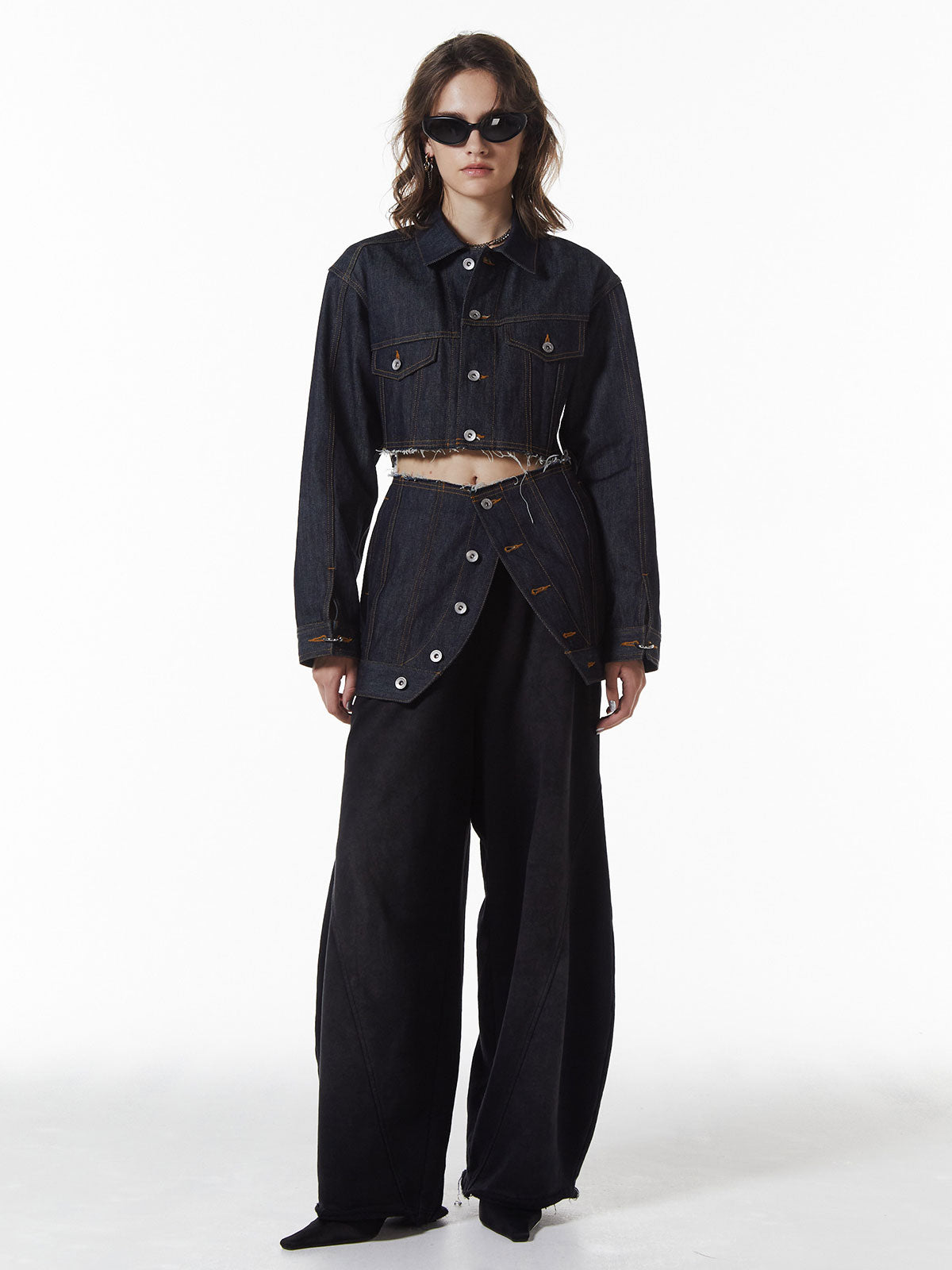 左右が非対称のデザインや、袖を後ろ前に反転させて取り付けたディテールで、カジュアルなデニムにモードなスパイスを効かせました。