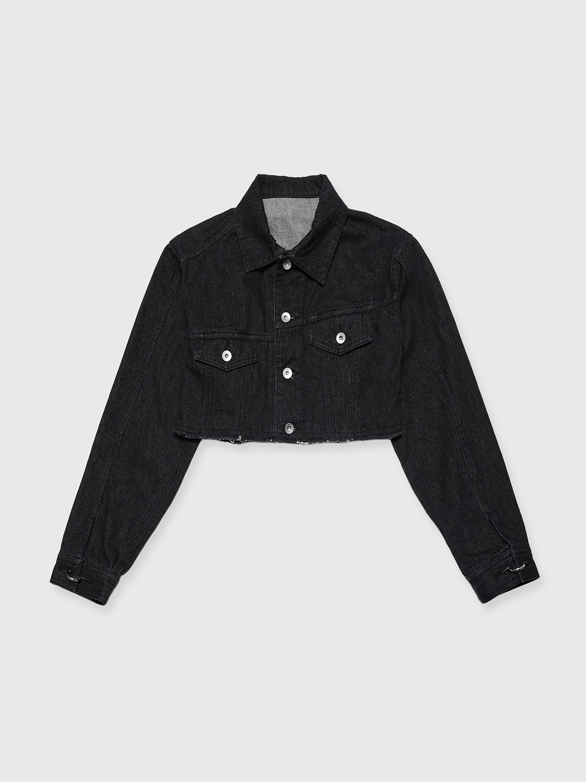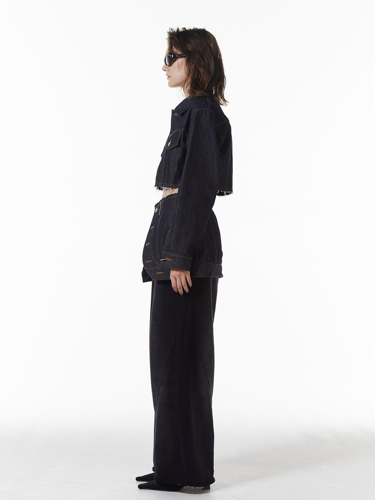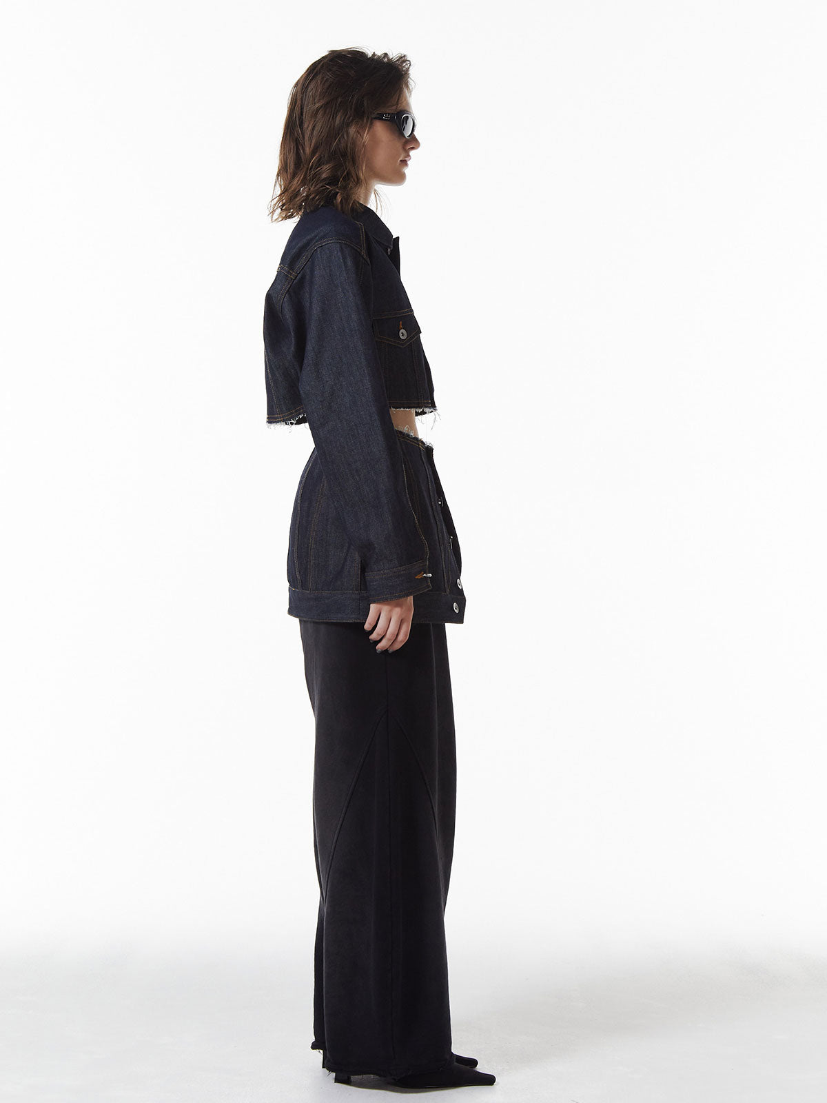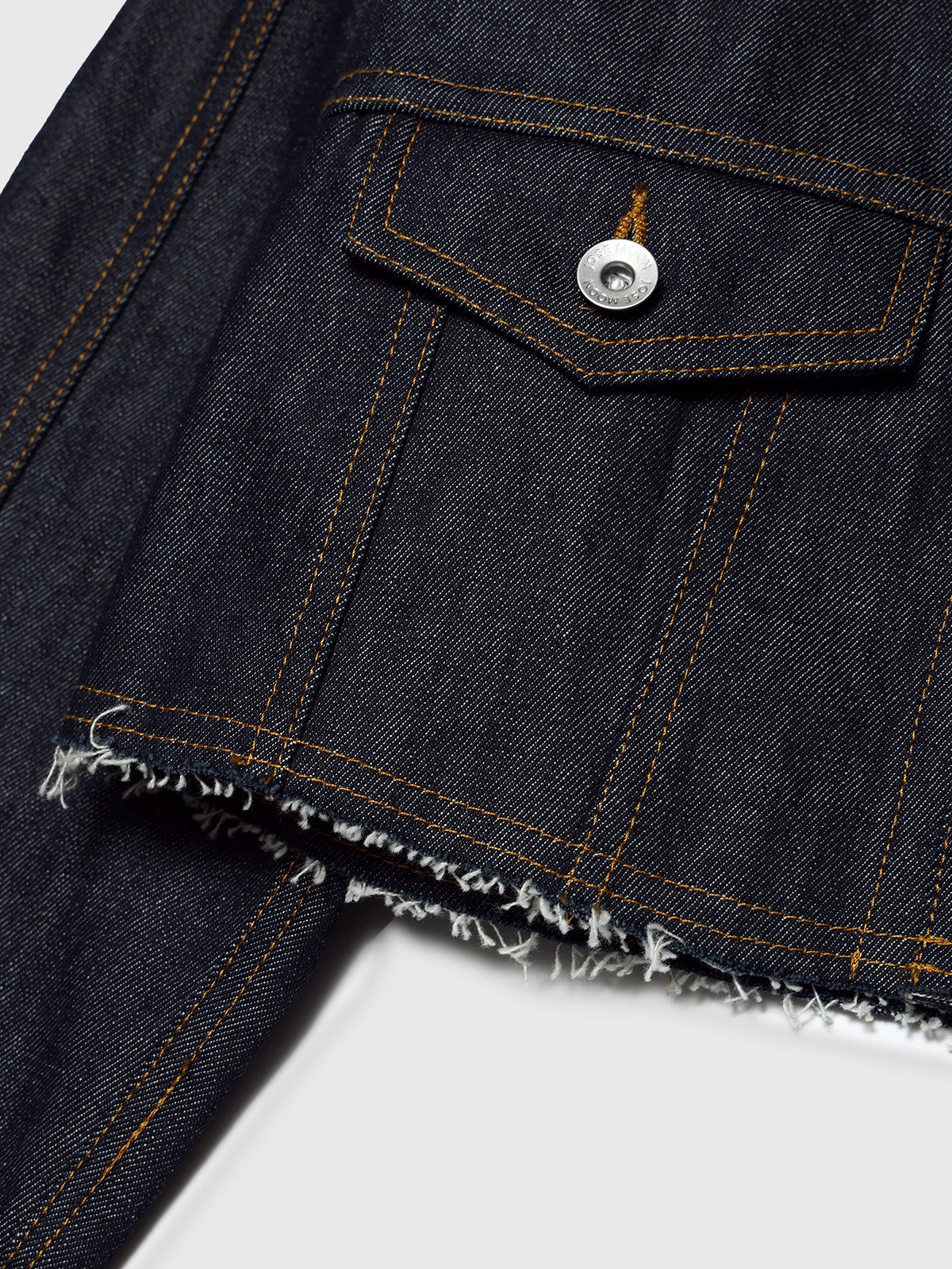 左右が非対称のデザインや、袖を後ろ前に反転させて取り付けたディテールで、カジュアルなデニムにモードなスパイスを効かせました。