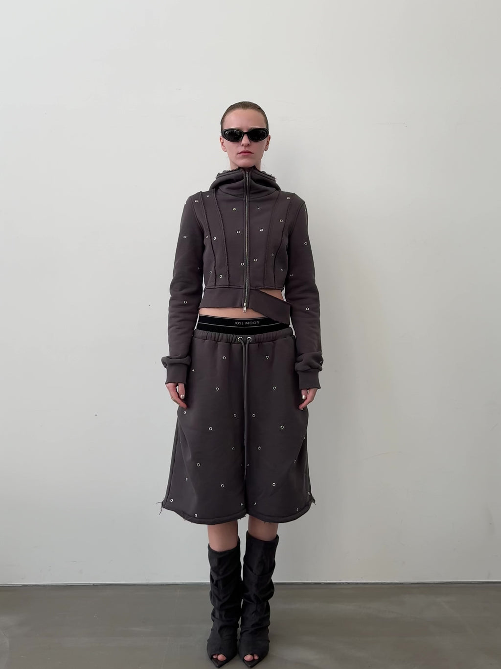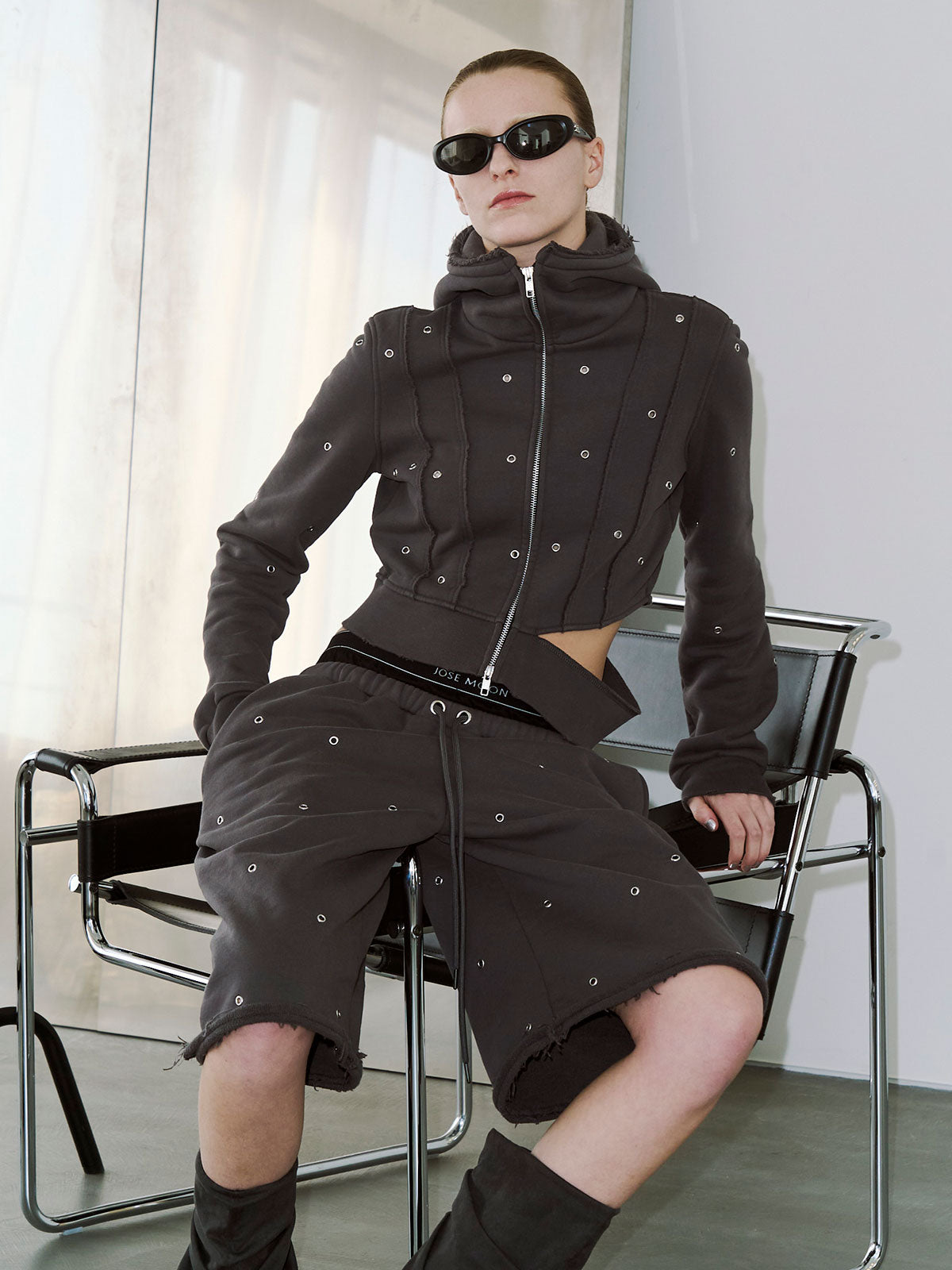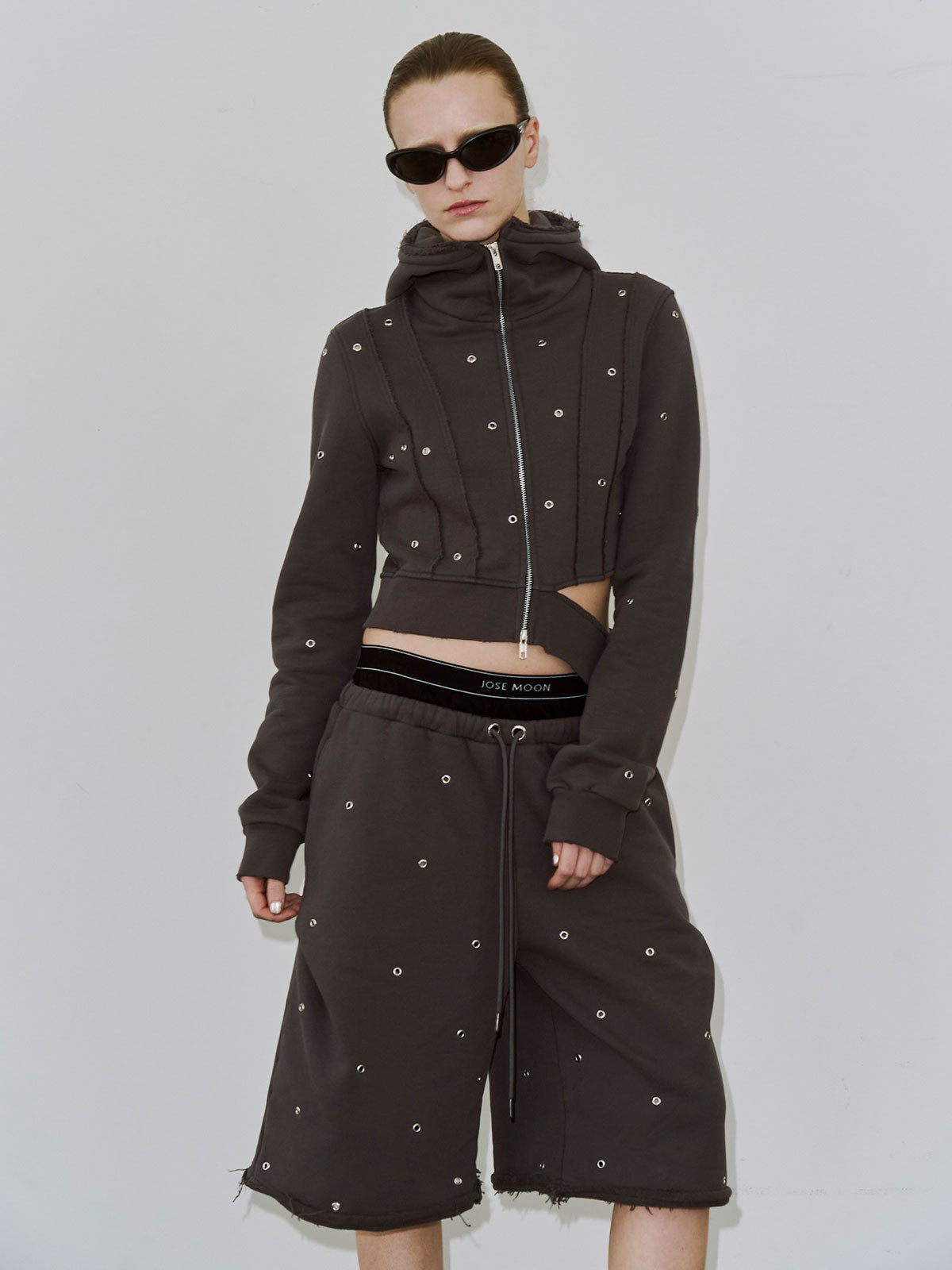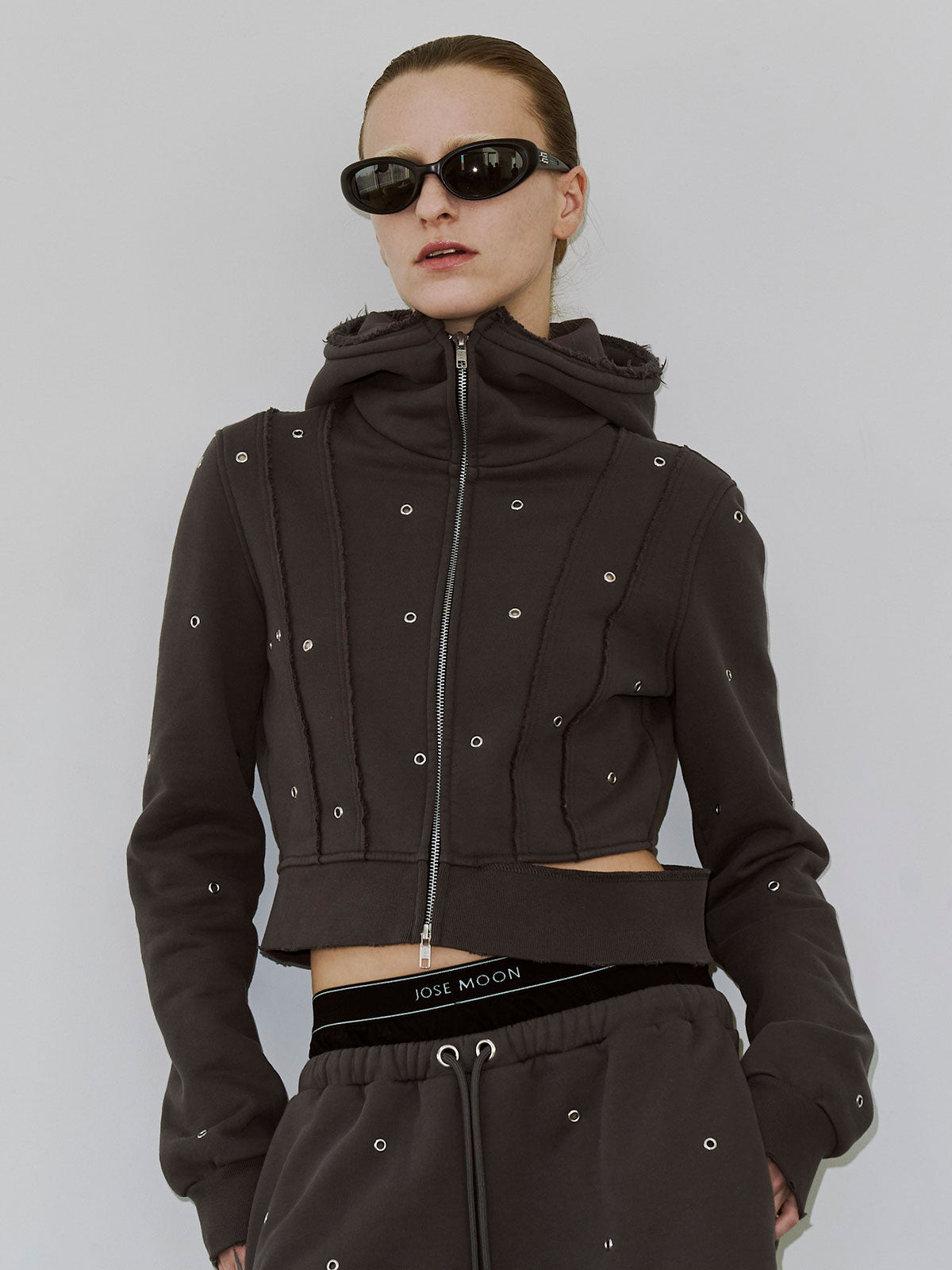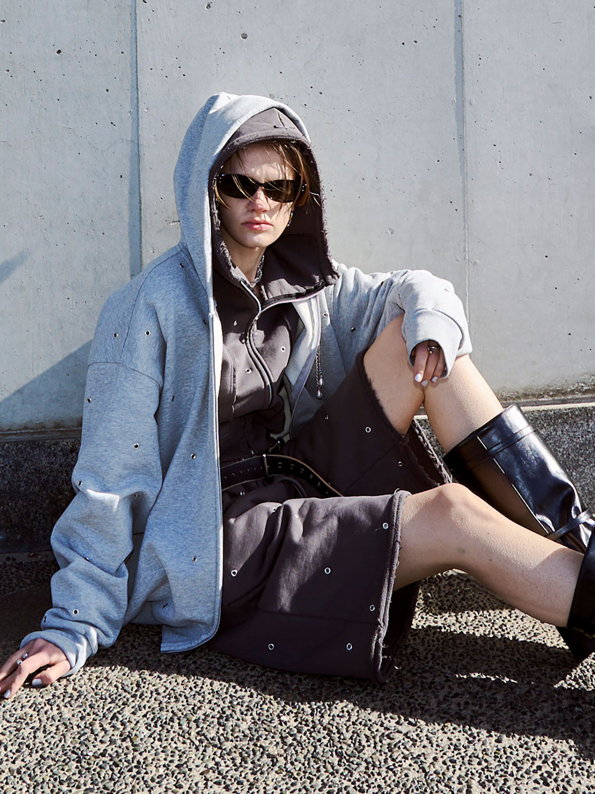全体にハトメを打ち込んだ、存在感のあるフーディー。