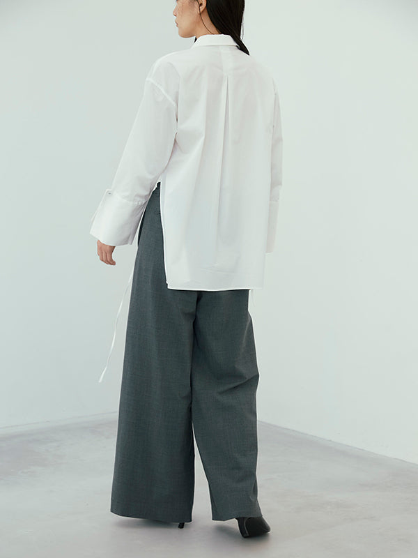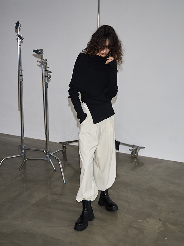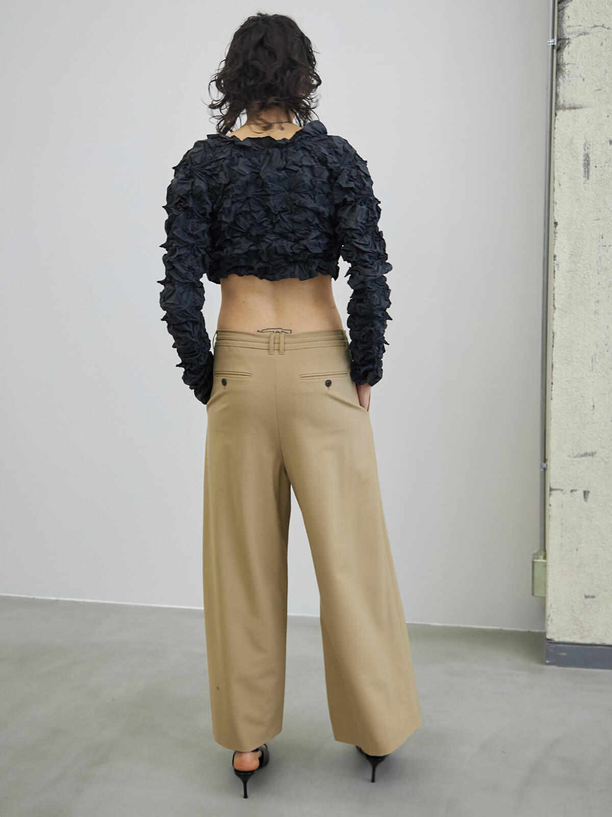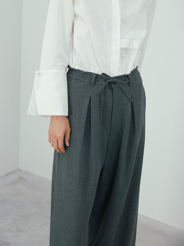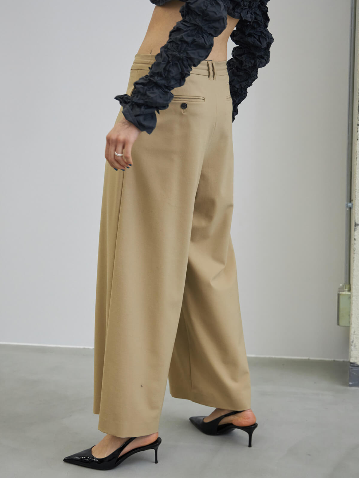 ウエストはあえて大きく作り、ご自身でぎゅっとギャザーを寄せてはいていただくデザインの為、ジャストウエストでも、ローウエストでも、気分に合わせて穿いて頂けます。