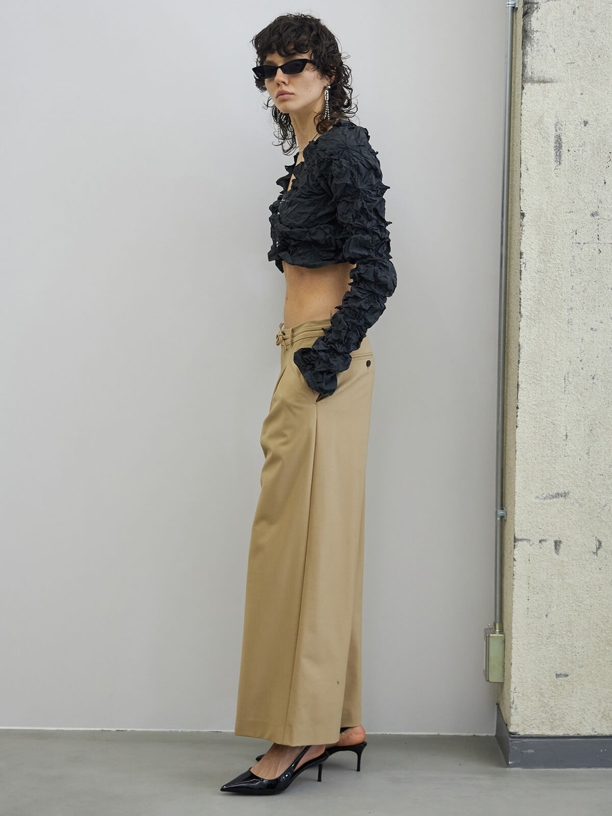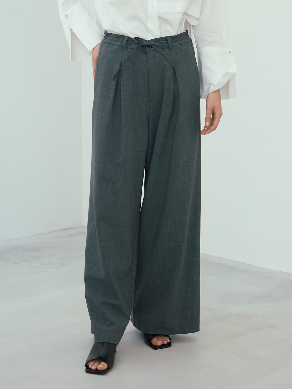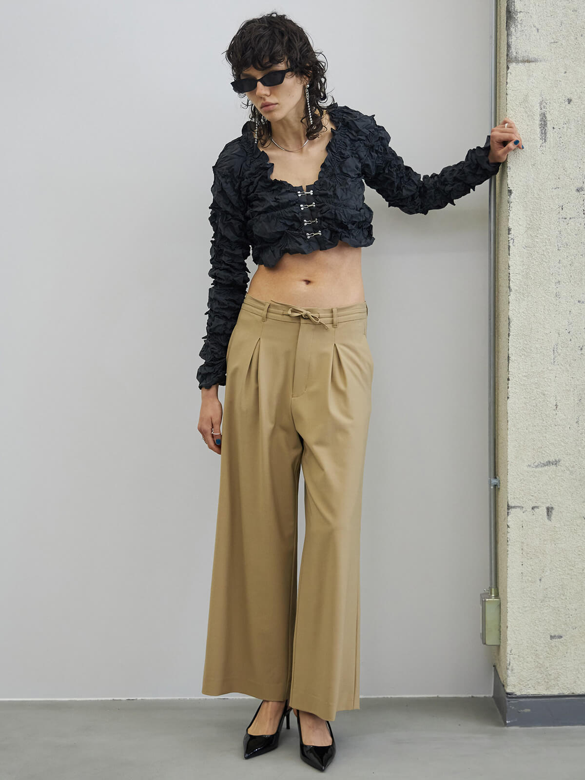 ウエストはあえて大きく作り、ご自身でぎゅっとギャザーを寄せてはいていただくデザインの為、ジャストウエストでも、ローウエストでも、気分に合わせて穿いて頂けます。