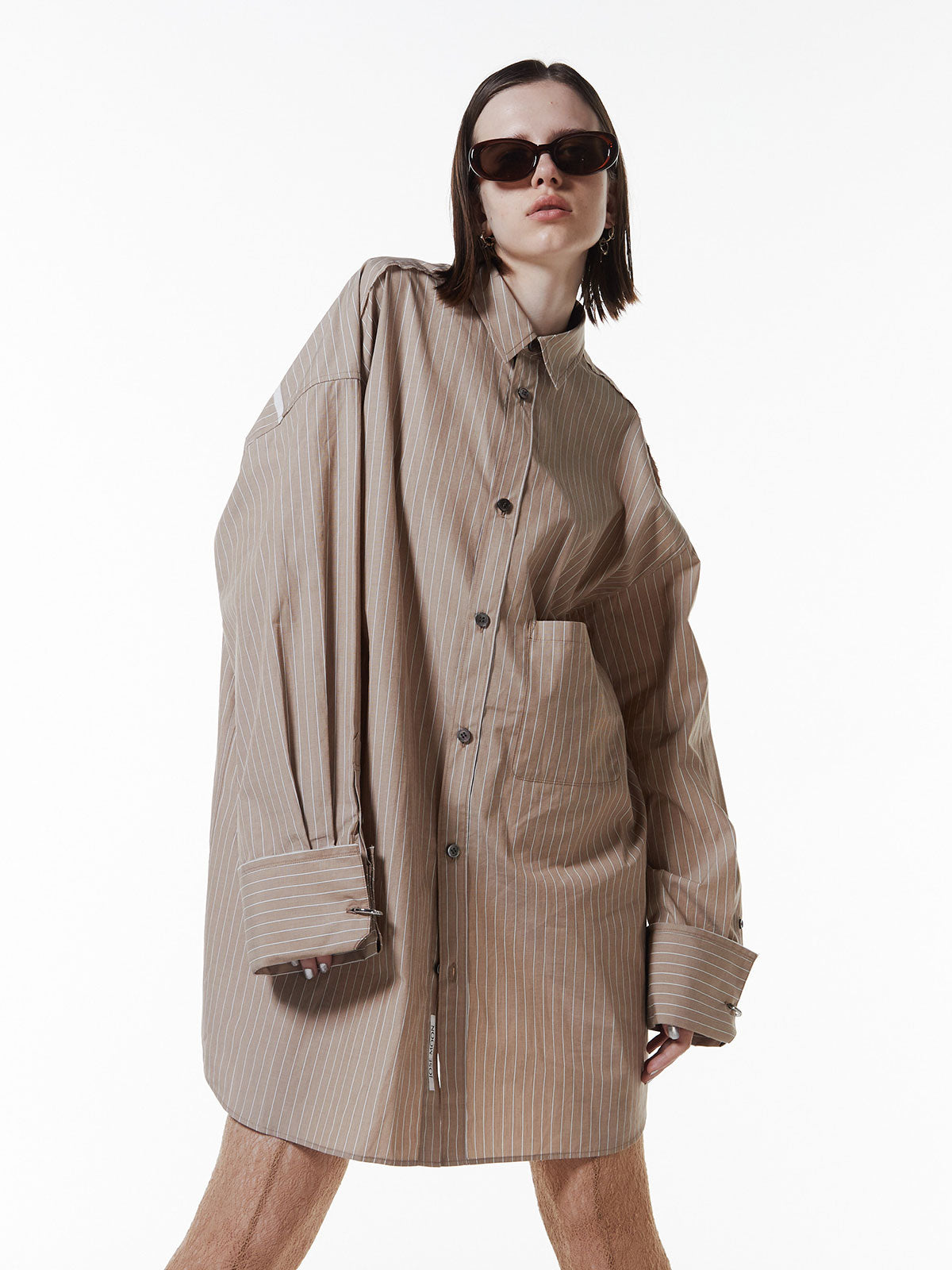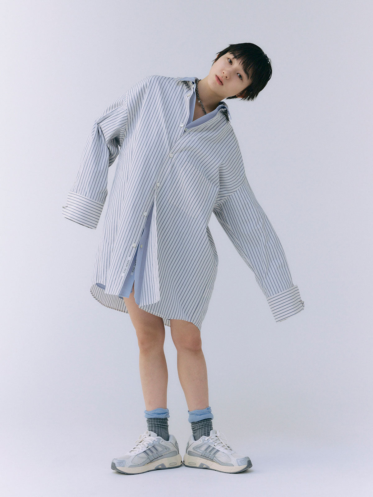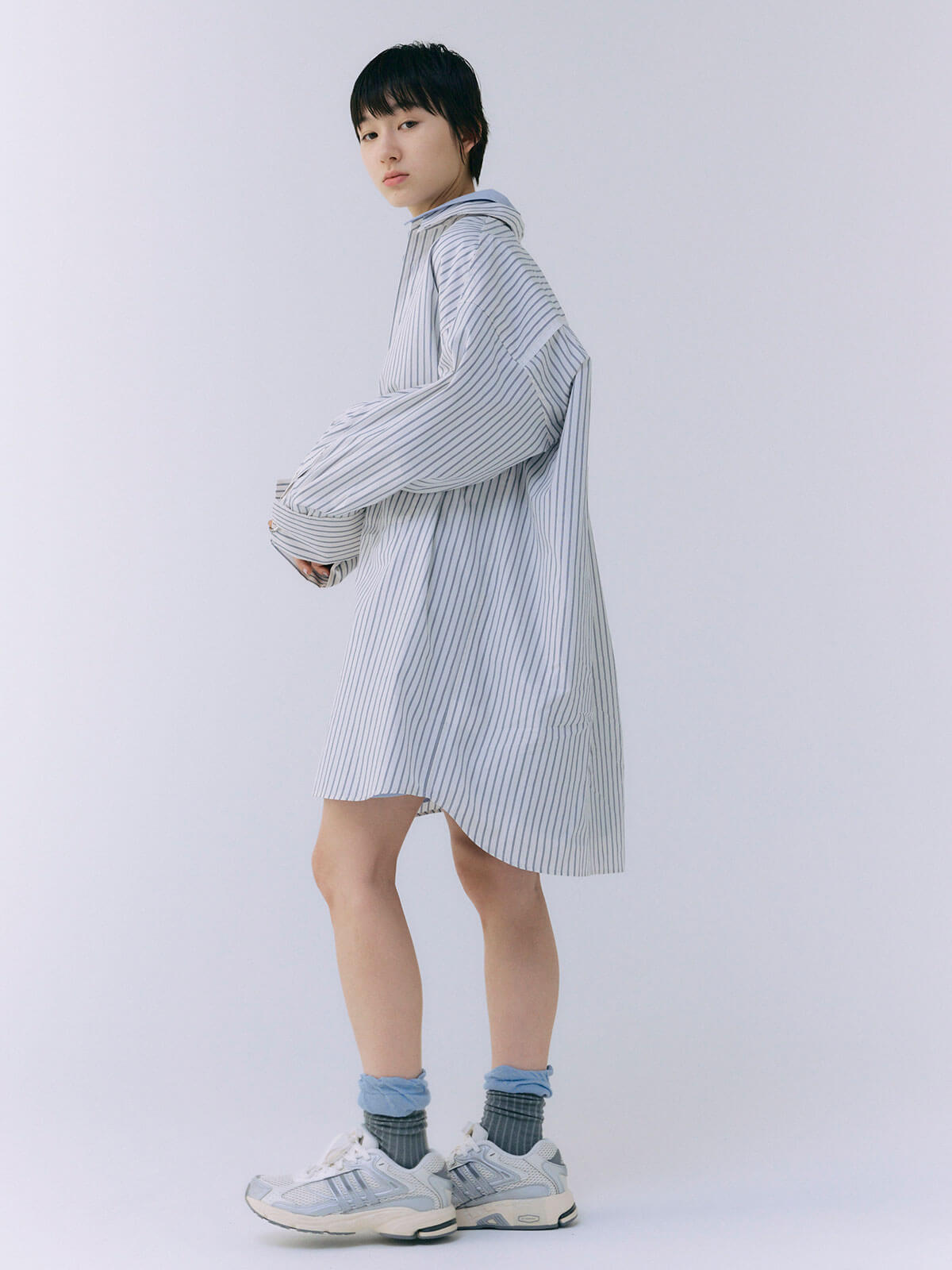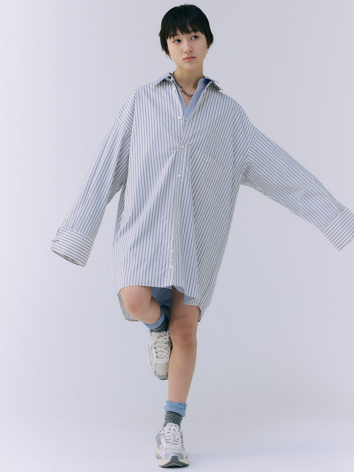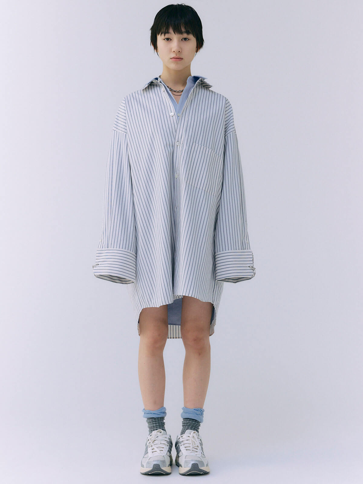 オーバーサイズのデザインなので、ボトムスと合わせるだけでなく、ワンピースとしても着用可能。
