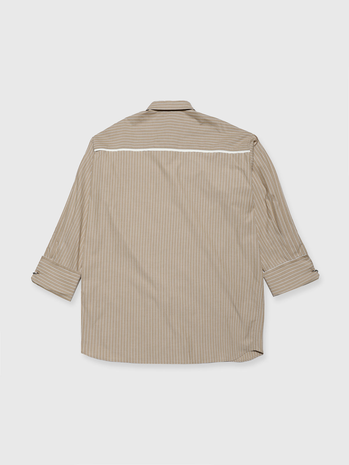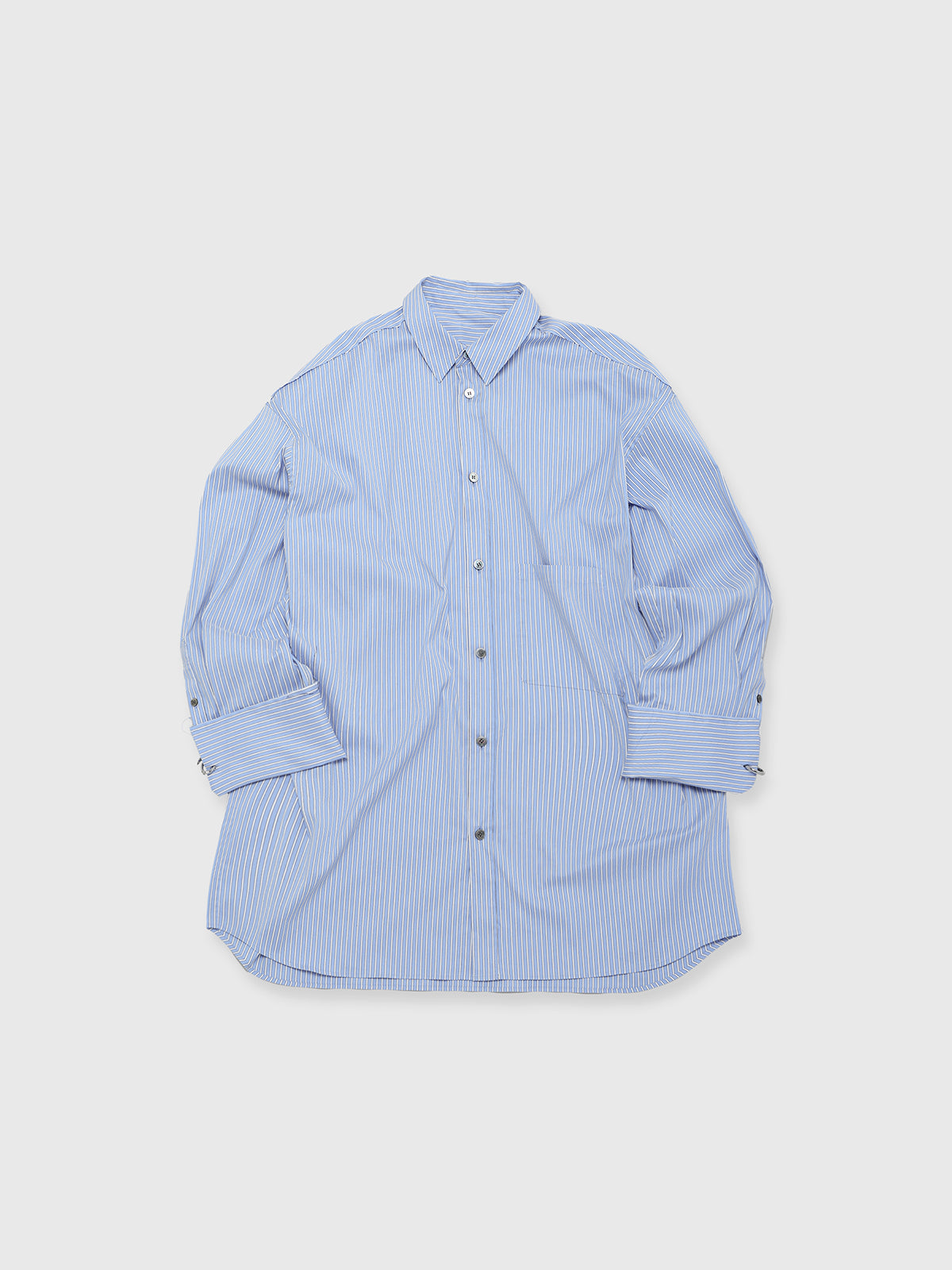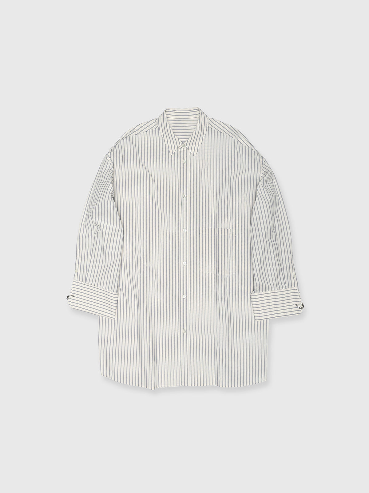 袖口にはオリジナルのリングをあしらったビッグカフスが目を引き、裁ち切り始末などのディテールがシャツ全体を格上げします。